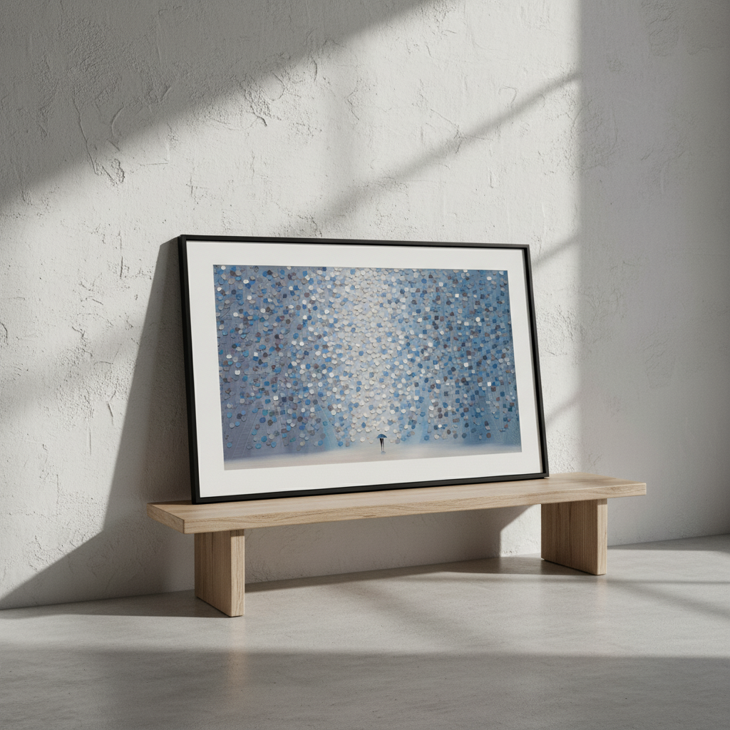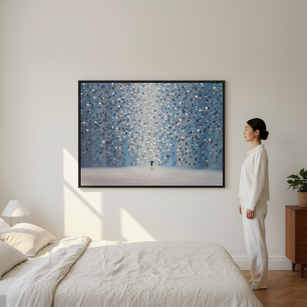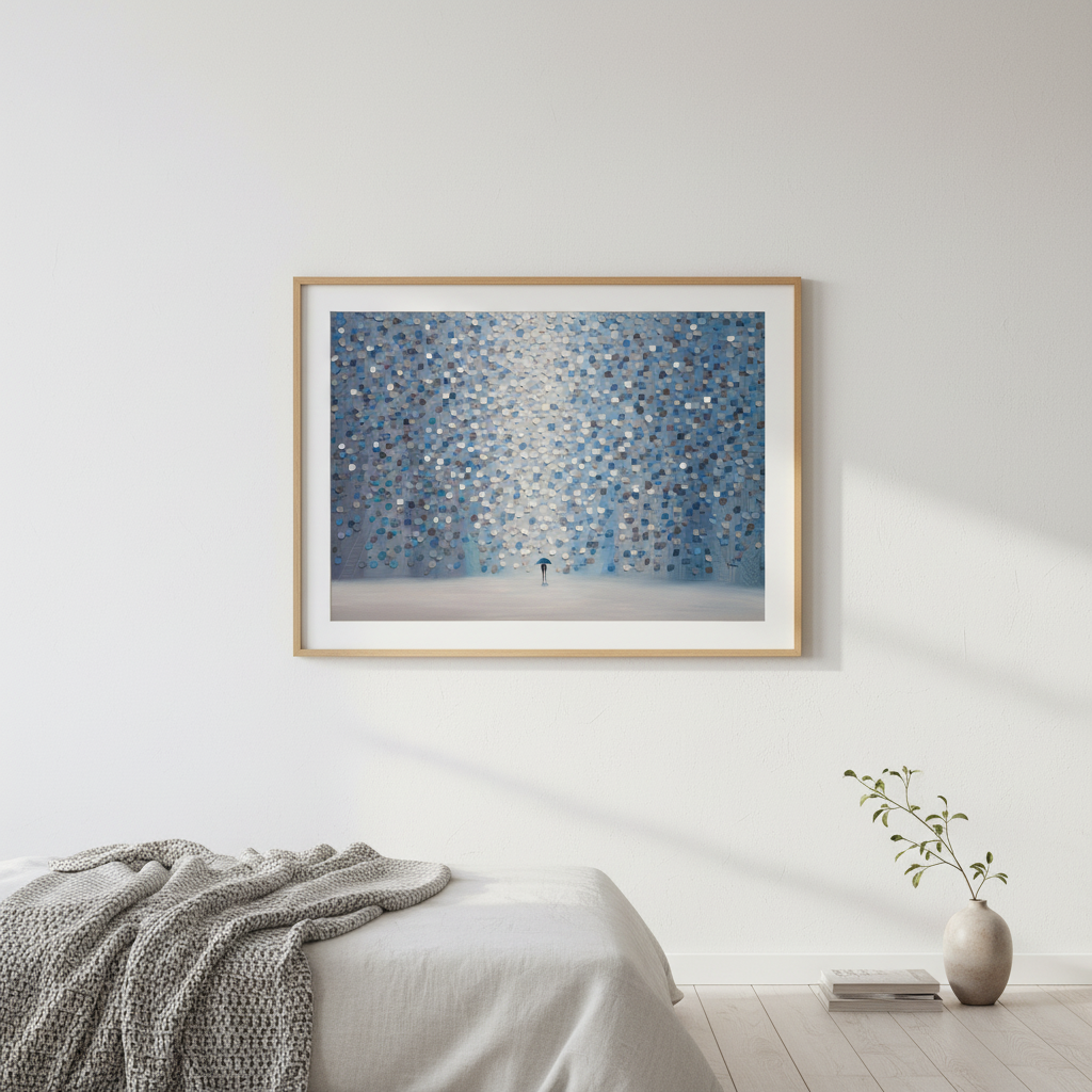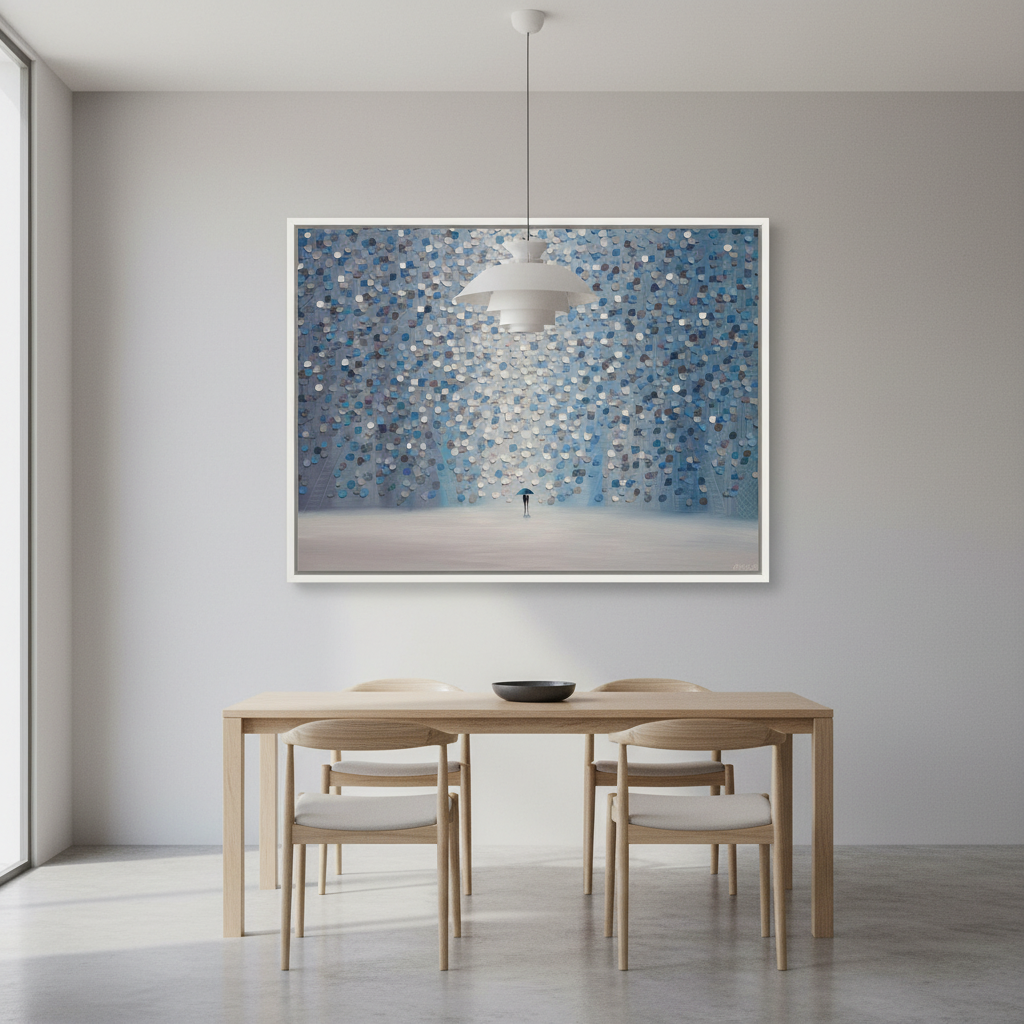 Moonlight Rain captures a contemplative moment through Ekaterina Ermilkina's distinctive artistic vision. The composition features a solitary figure sheltering beneath an umbrella, positioned against a mesmerizing backdrop of interlocking blue and gray circular patterns. These geometric forms create rhythmic visual movement, evoking the sensation of rainfall and atmospheric depth. The interplay between the figure and abstract background suggests themes of solitude, resilience, and the quiet beauty found in everyday moments. This piece combines figurative storytelling with modern geometric abstraction, making it an engaging focal point for contemporary interiors seeking both narrative depth and visual sophistication.
