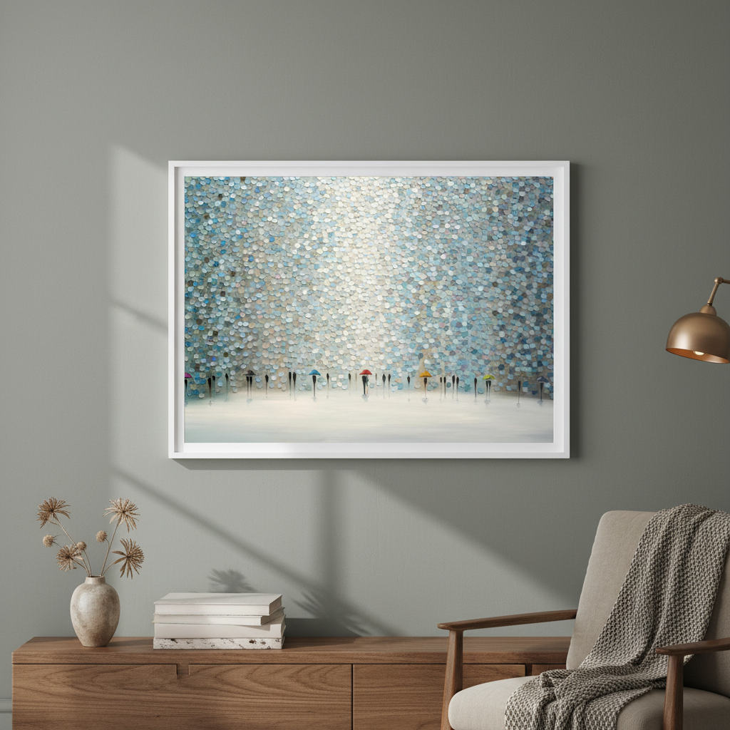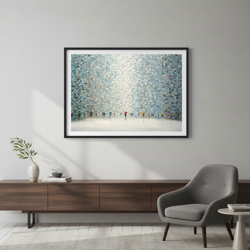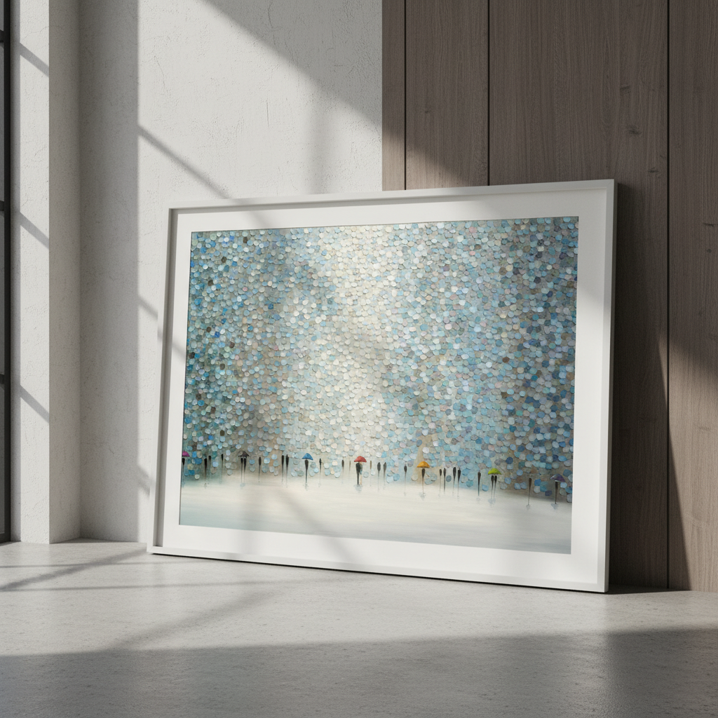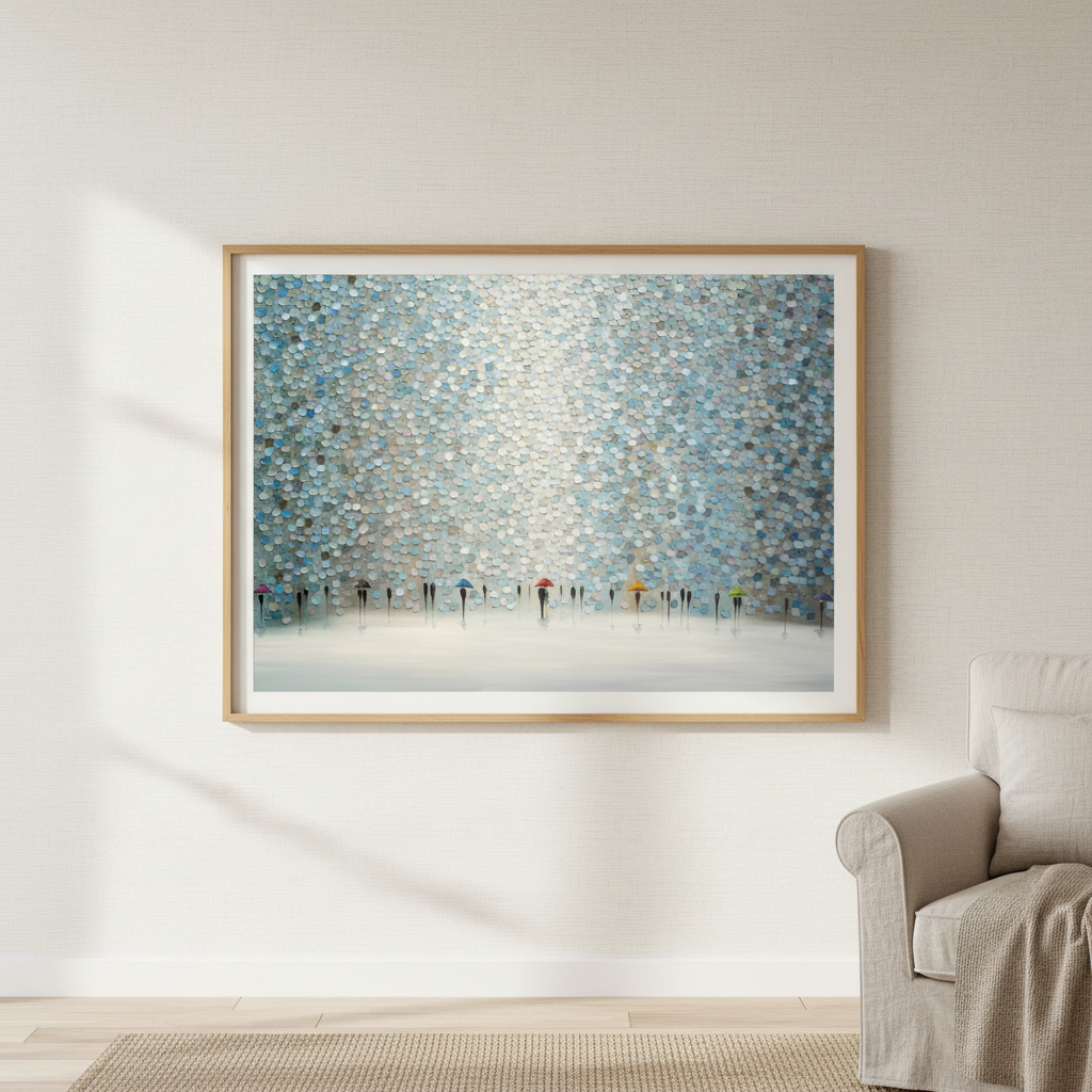 Rain Symphony by Ekaterina Ermilkina captures a poignant moment where figures navigate wet weather with quiet grace. This artistic composition features silhouetted figures clutching umbrellas, rendered against a richly textured wall surface that adds depth and visual intrigue. The interplay of light and shadow creates an evocative atmosphere, transforming an everyday scene into a contemplative study of human resilience. The textured backdrop enhances the emotional resonance, inviting viewers to pause and reflect on life's quieter moments. An ideal choice for spaces seeking sophisticated wall art that balances narrative storytelling with refined aesthetic appeal.