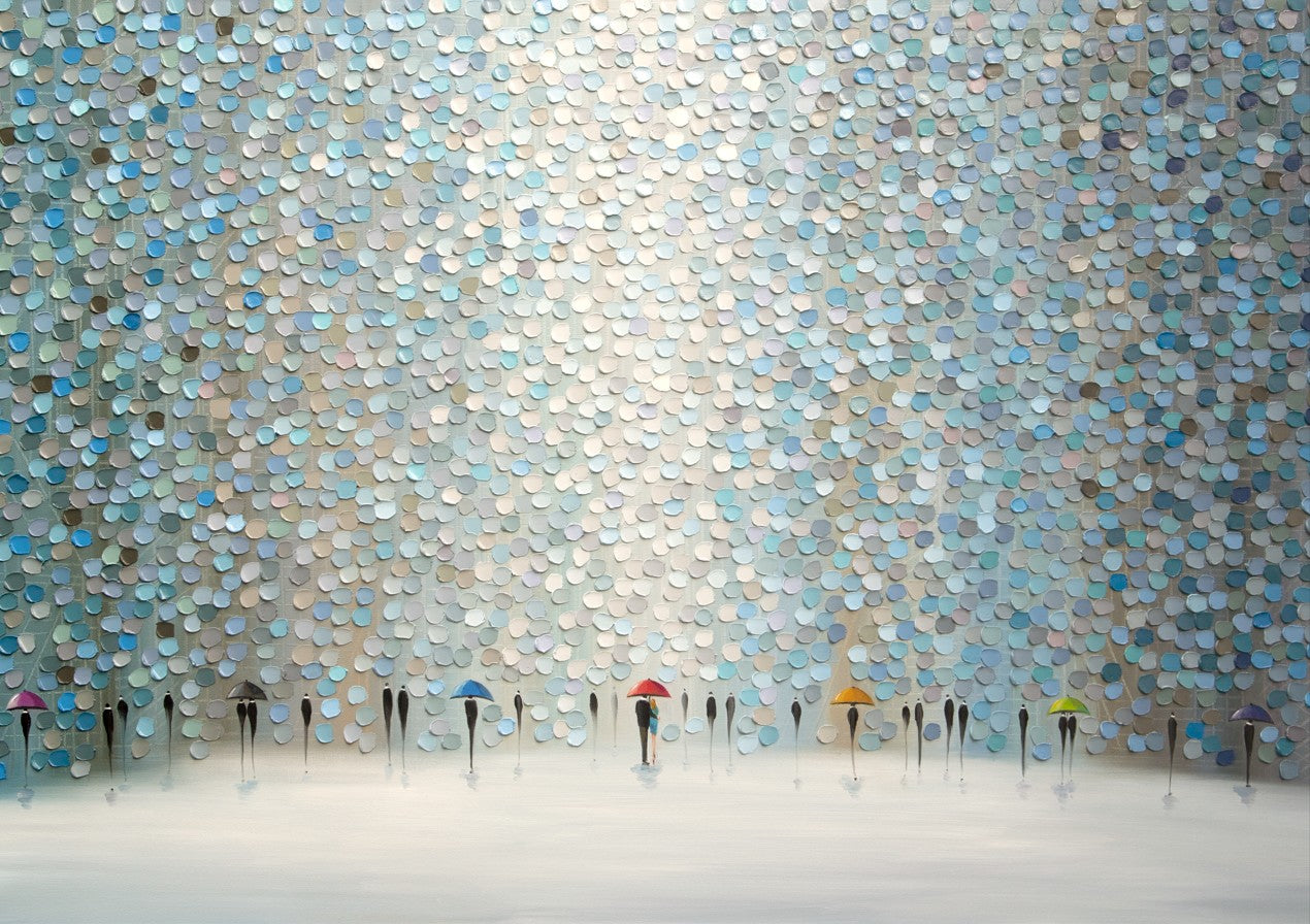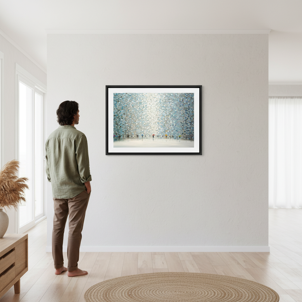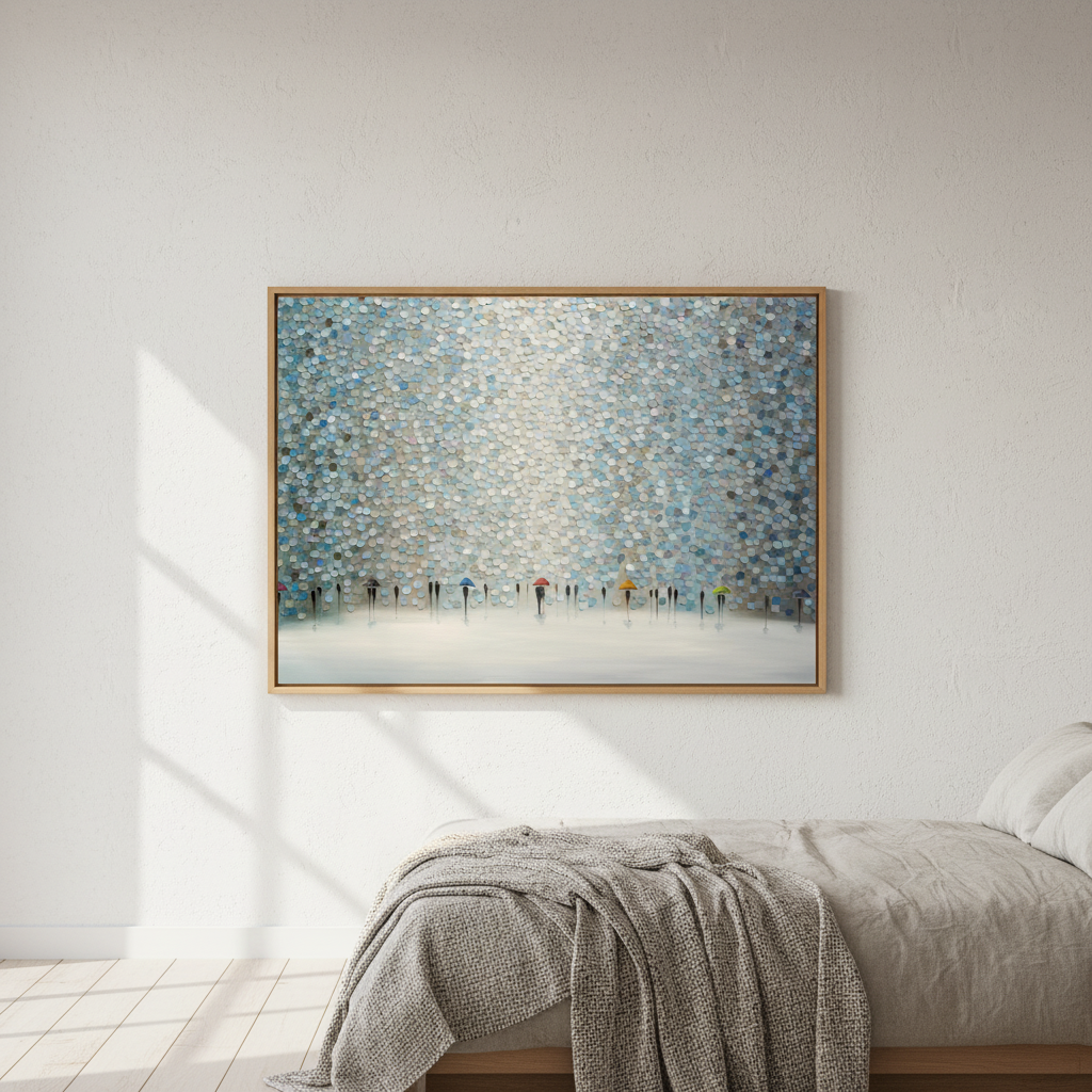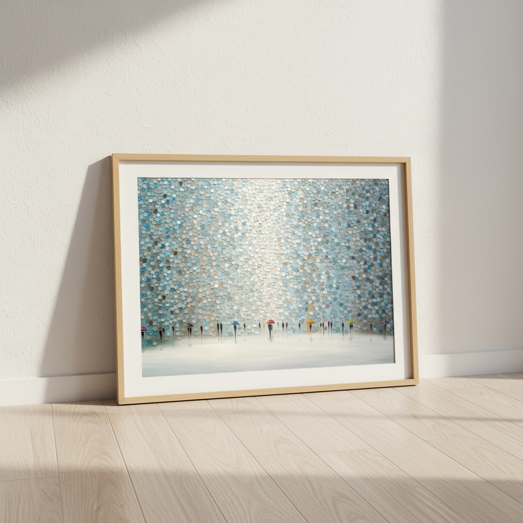 Rain Symphony by Ekaterina Ermilkina captures a poignant moment where figures navigate wet weather with quiet grace. This artistic composition features silhouetted figures clutching umbrellas, rendered against a richly textured wall surface that adds depth and visual intrigue. The interplay of light and shadow creates an evocative atmosphere, transforming an everyday scene into a contemplative study of human resilience. The textured backdrop enhances the emotional resonance, inviting viewers to pause and reflect on life's quieter moments. An ideal choice for spaces seeking sophisticated wall art that balances narrative storytelling with refined aesthetic appeal.