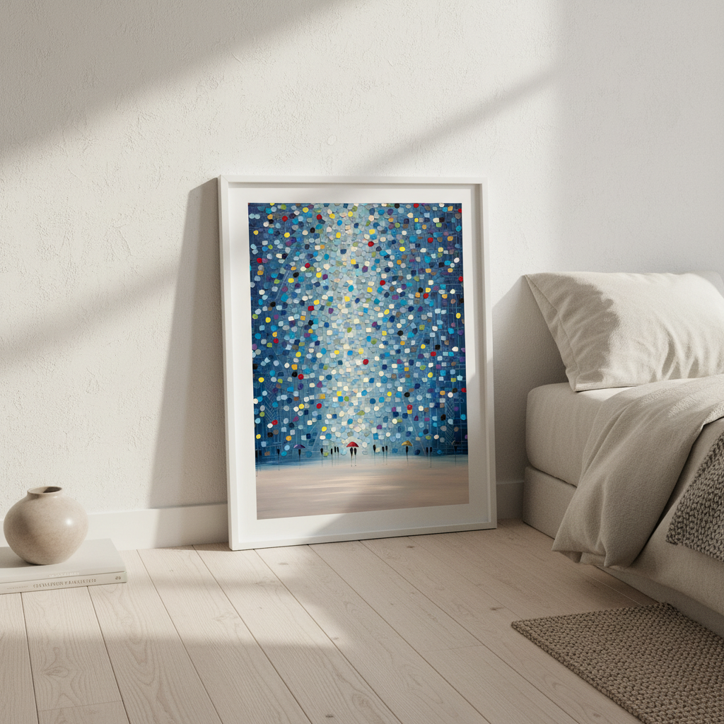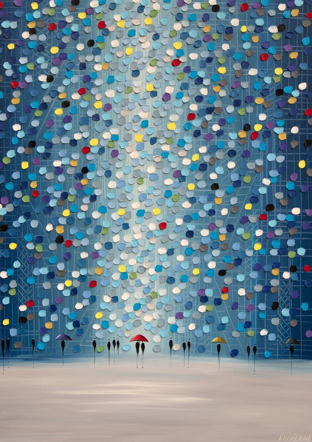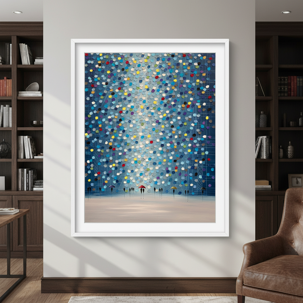 Raindrop Confetti captures a whimsical moment where pedestrians navigate wet streets beneath a vibrant, stippled sky. This artistic composition by Ekaterina Ermilkina merges figurative storytelling with abstract expressionism, using dotted patterns to evoke both rainfall and atmospheric energy. The interplay of umbrellas and colorful precipitation creates visual rhythm, transforming an everyday scene into a contemplative meditation on movement and weather. Perfect for spaces seeking sophisticated wall art that balances narrative depth with contemporary aesthetic appeal.