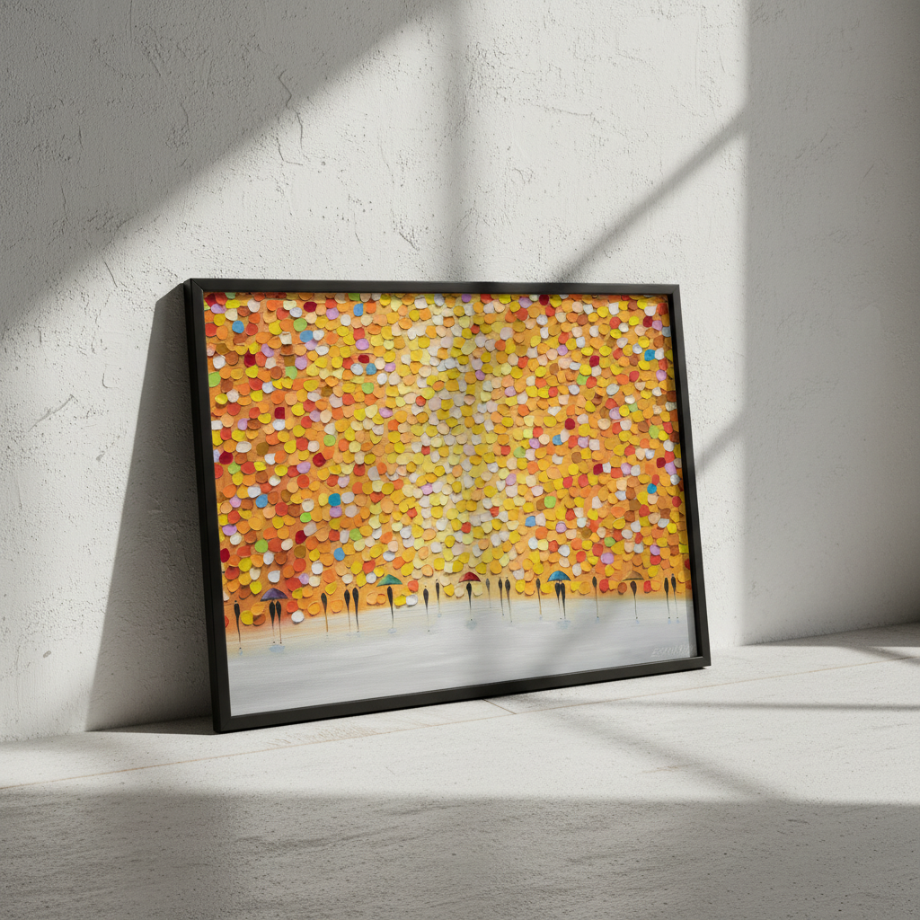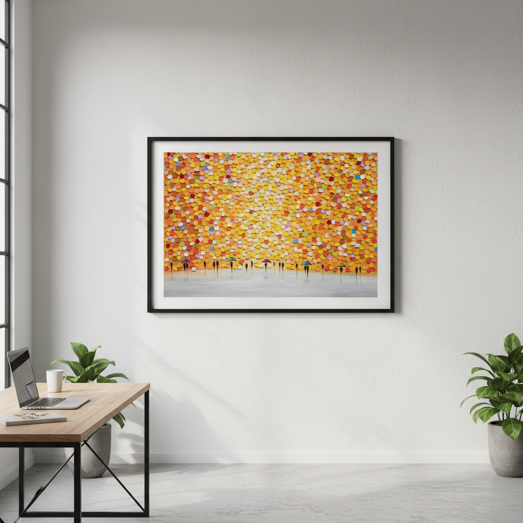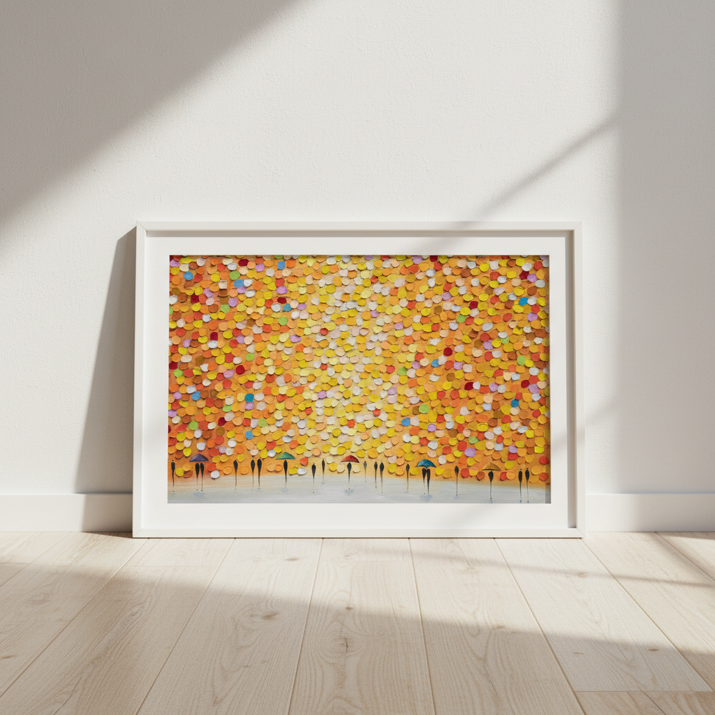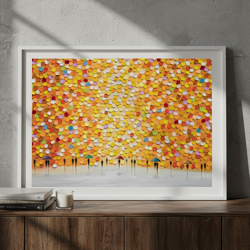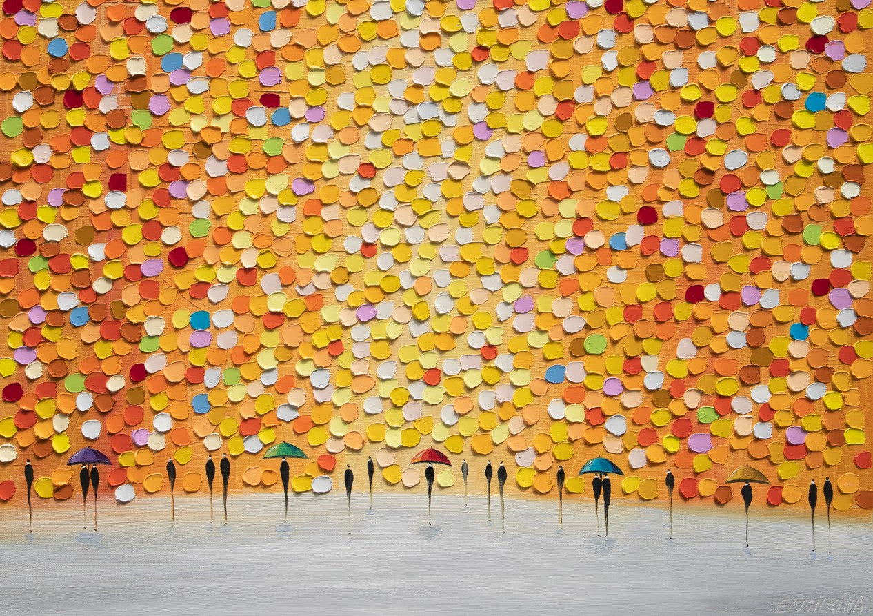 This striking wall art captures a dynamic moment of everyday life through an artistic lens. Ekaterina Ermilkina's composition features figures sheltering beneath umbrellas, rendered against a bold, multicolored backdrop that brings movement and energy to any space. The vibrant palette creates visual interest while the figurative subject matter adds narrative depth. Perfect for contemporary interiors seeking statement-making artwork that balances sophistication with playful colour. An ideal choice for those who appreciate modern illustration with emotional resonance and chromatic boldness.