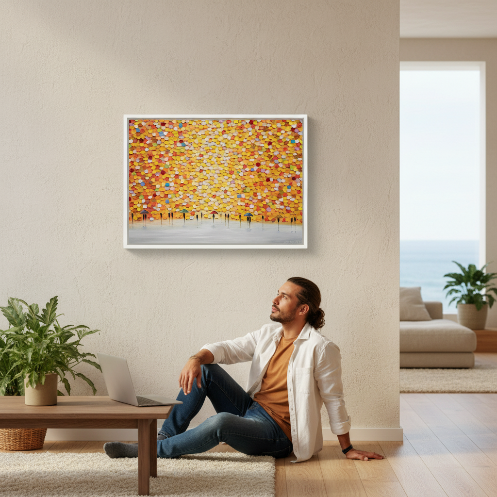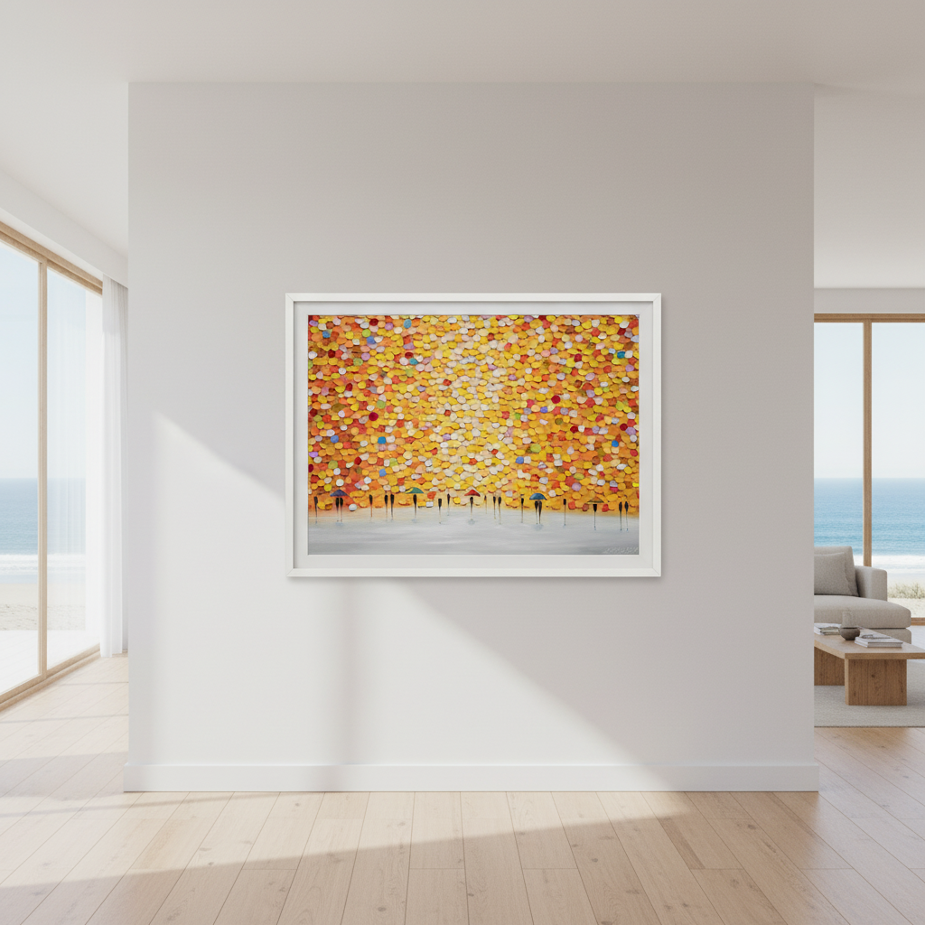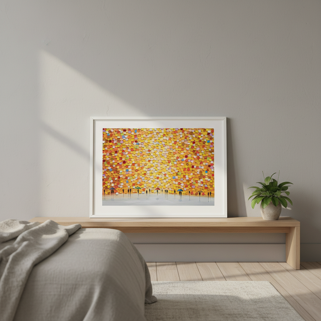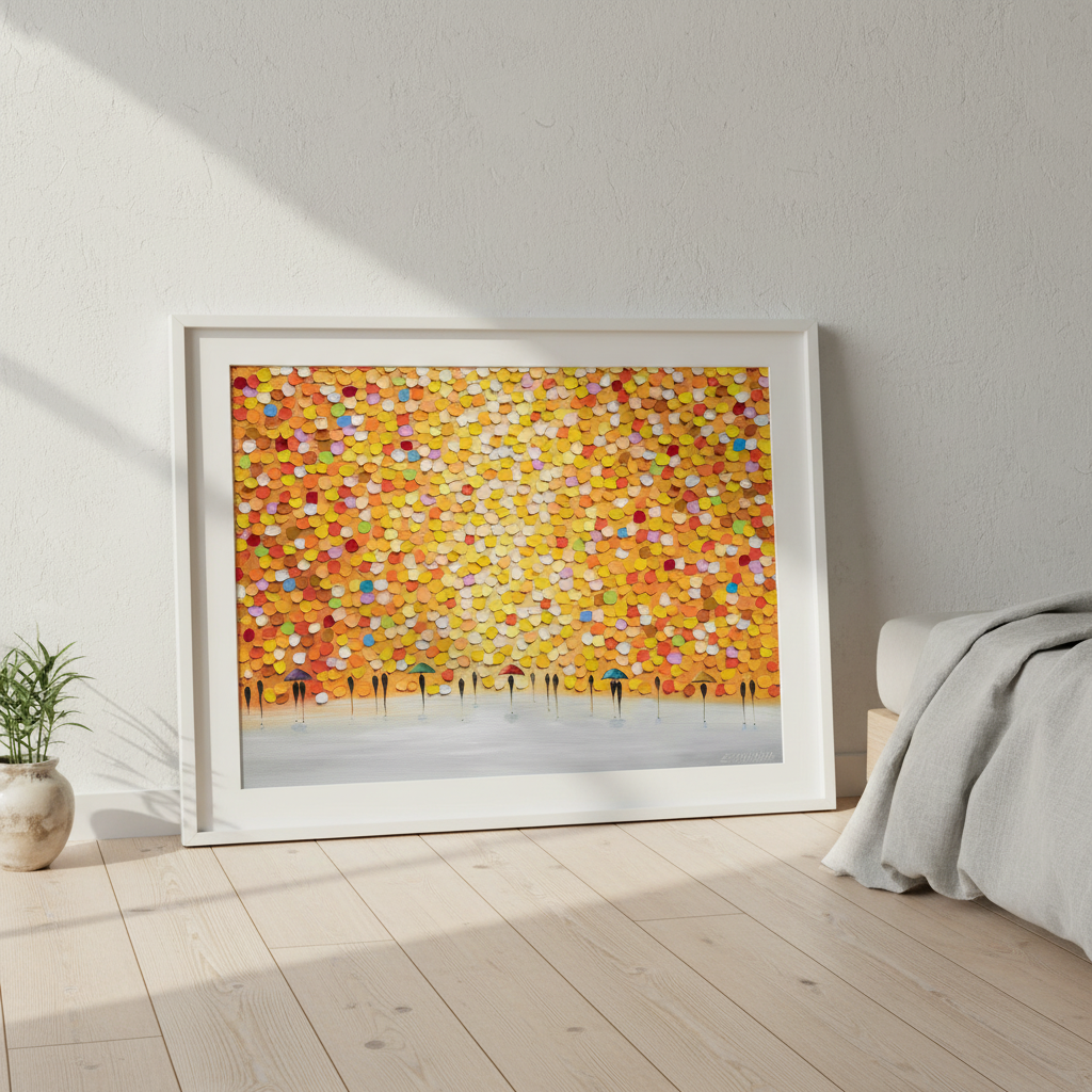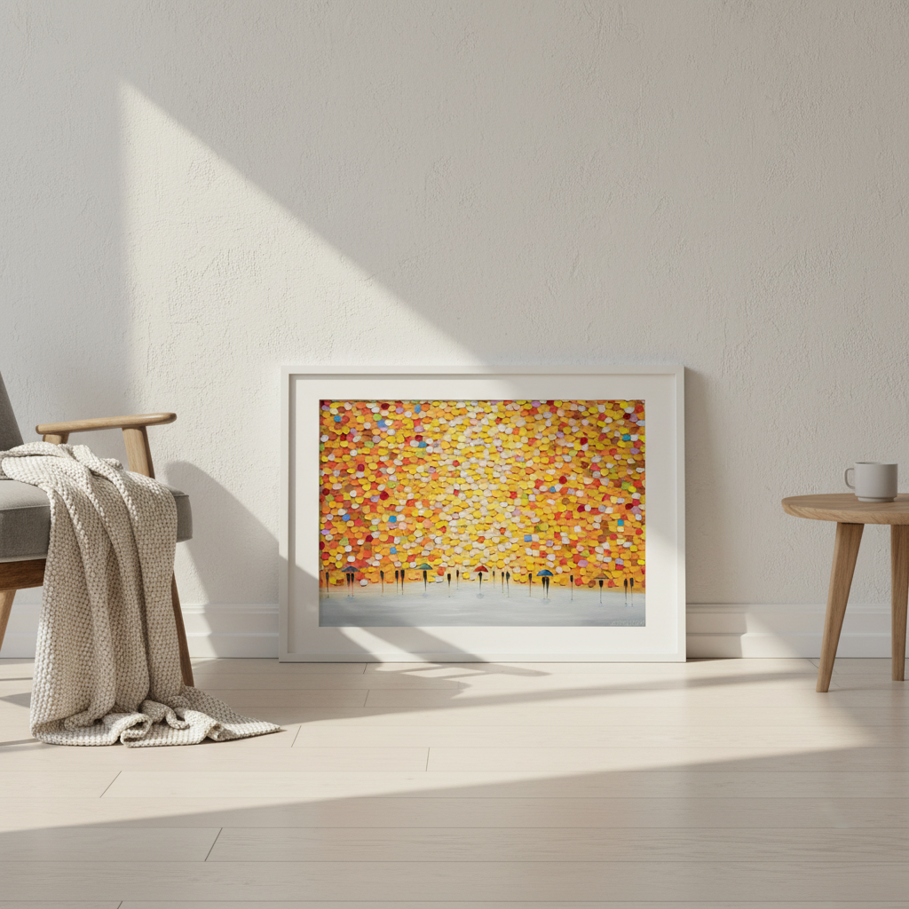 This striking wall art captures a dynamic moment of everyday life through an artistic lens. Ekaterina Ermilkina's composition features figures sheltering beneath umbrellas, rendered against a bold, multicolored backdrop that brings movement and energy to any space. The vibrant palette creates visual interest while the figurative subject matter adds narrative depth. Perfect for contemporary interiors seeking statement-making artwork that balances sophistication with playful colour. An ideal choice for those who appreciate modern illustration with emotional resonance and chromatic boldness.