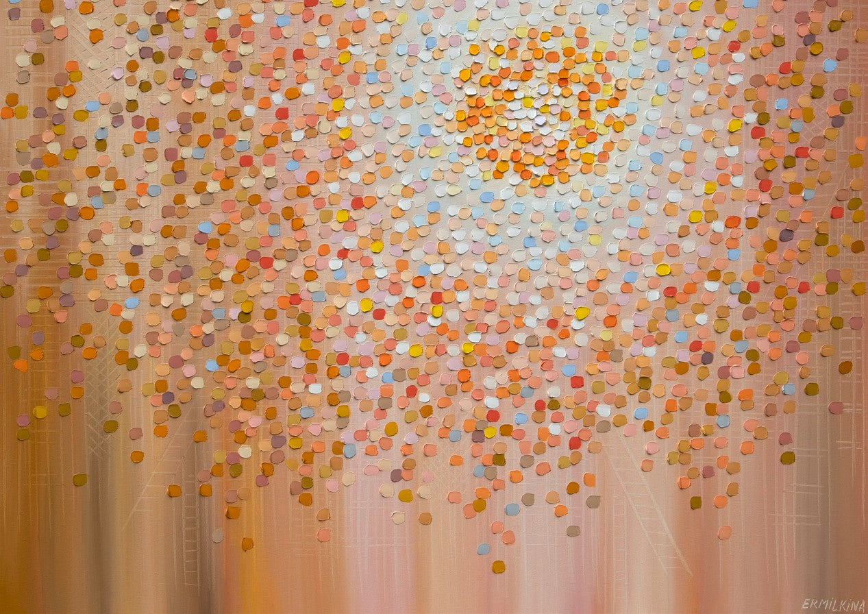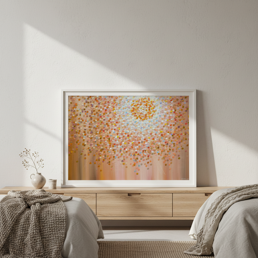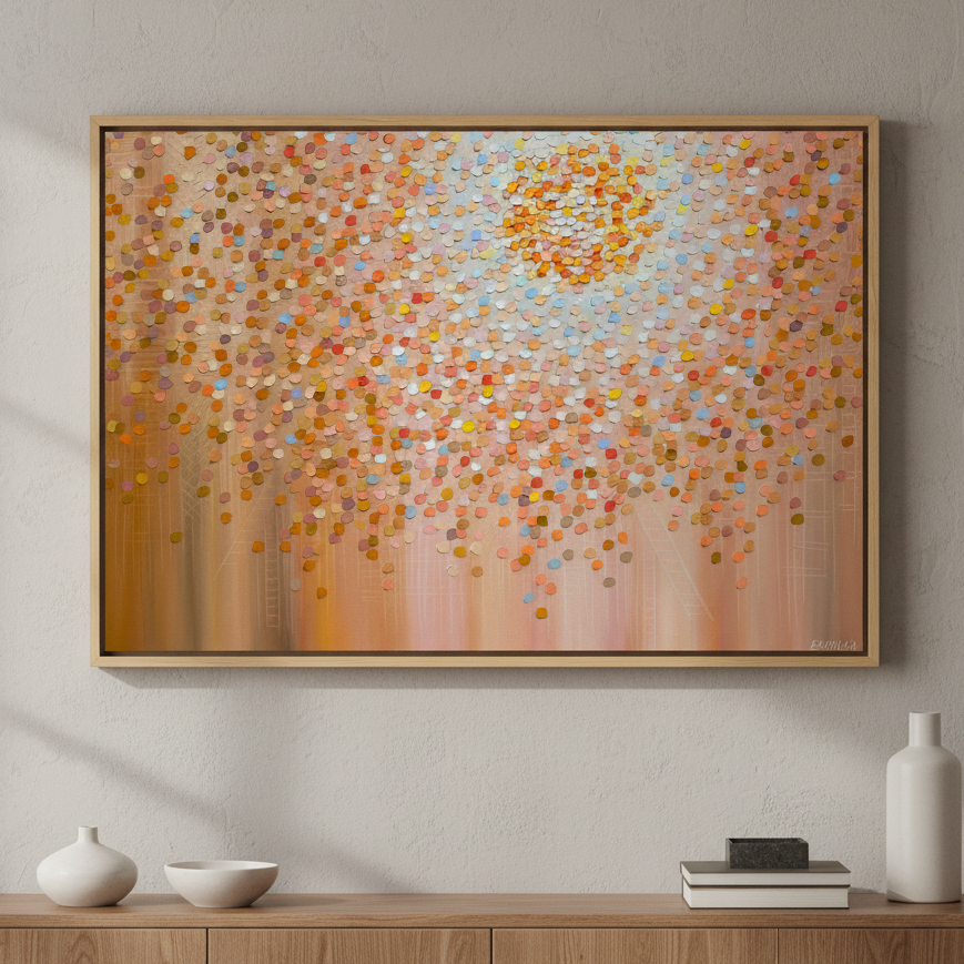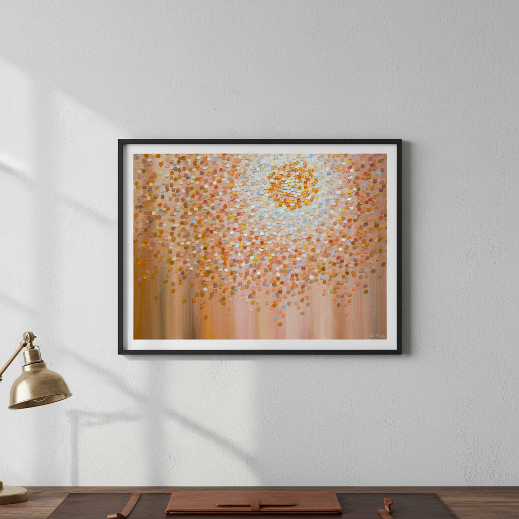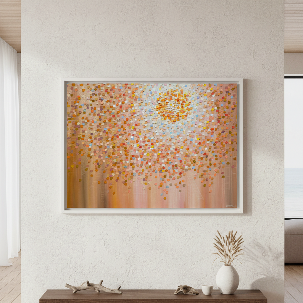 Sun by Ekaterina Ermilkina captures the essence of warmth and movement through carefully composed circular patterns rendered in rich, inviting tones. The composition unfolds against a serene beige backdrop, allowing the golden, amber, and terracotta hues to command attention. This abstract work demonstrates sophisticated use of geometric form and color harmony, creating visual rhythm that draws the eye inward. Ideal for contemporary interiors seeking artistic depth without overwhelming the space, this piece bridges the gap between modern abstraction and organic warmth.