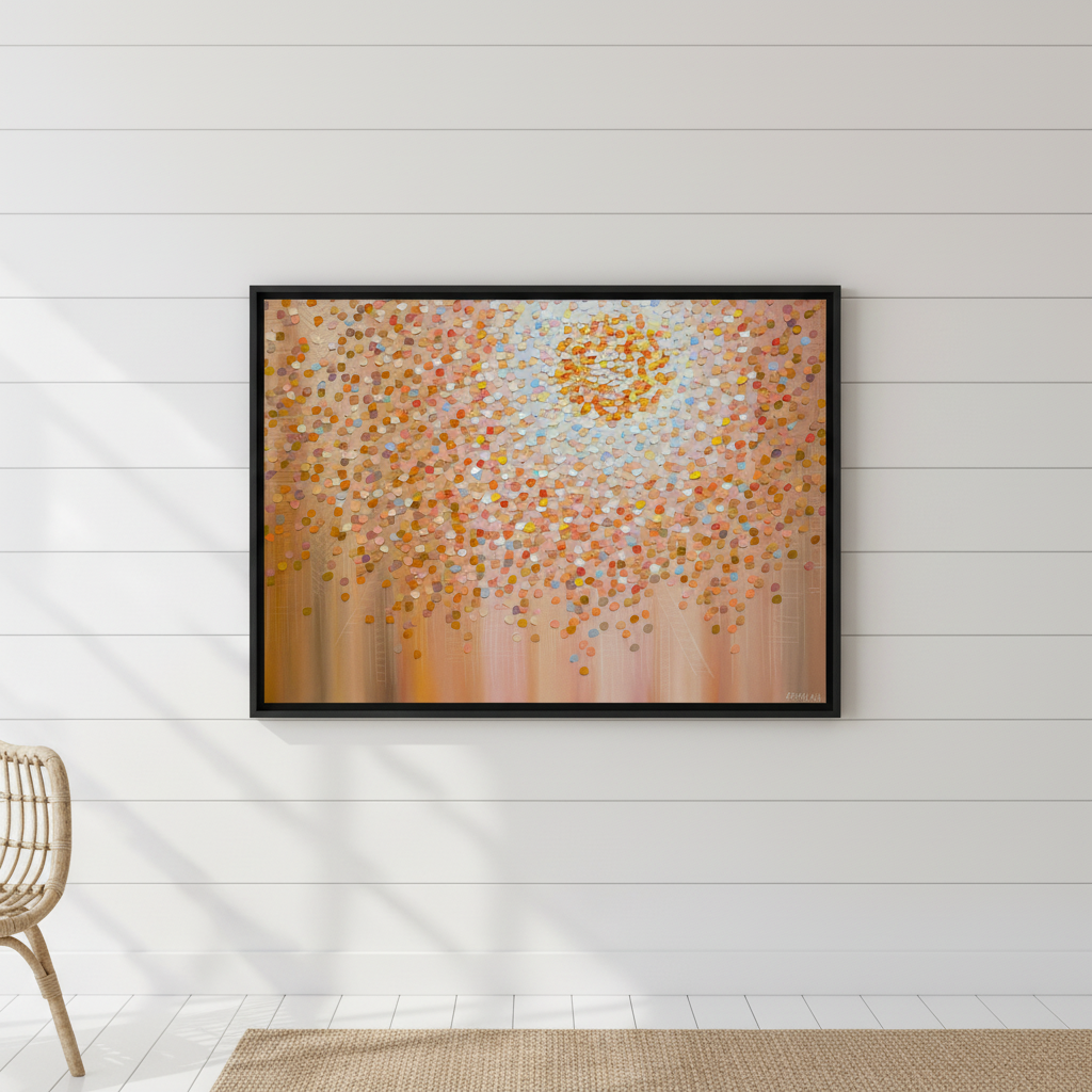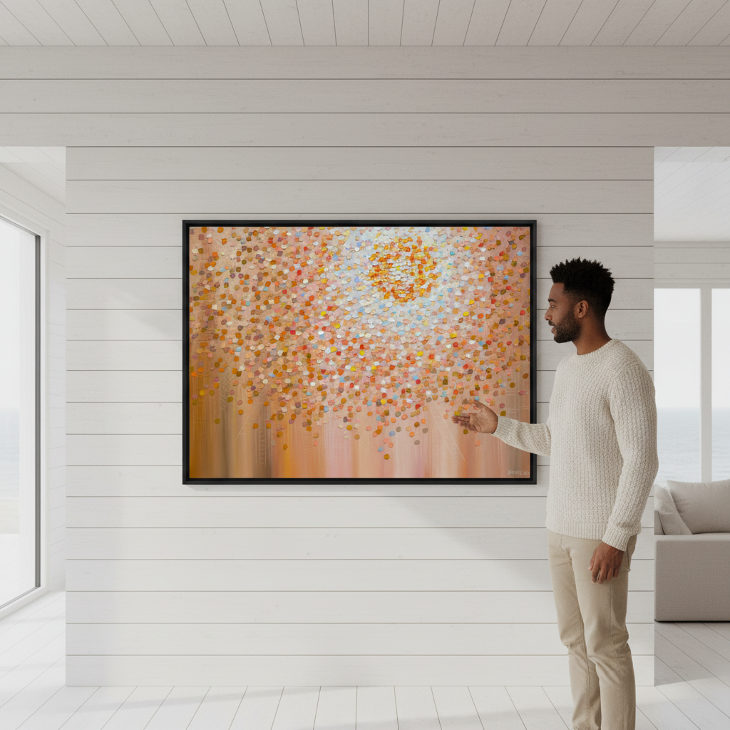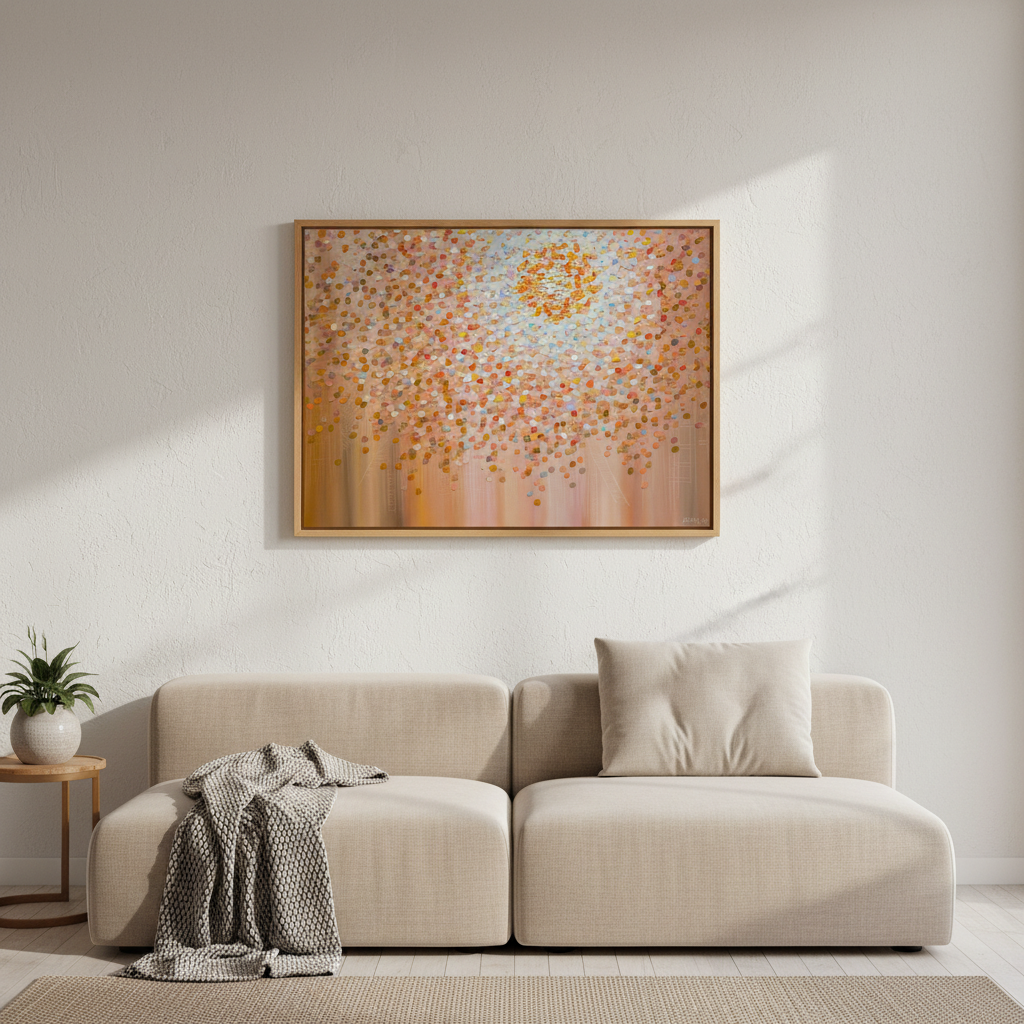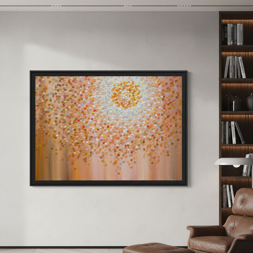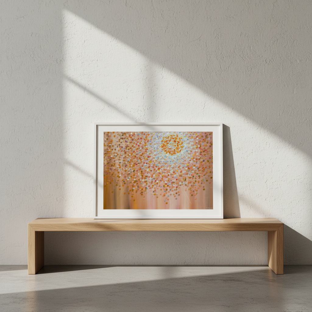 Sun by Ekaterina Ermilkina captures the essence of warmth and movement through carefully composed circular patterns rendered in rich, inviting tones. The composition unfolds against a serene beige backdrop, allowing the golden, amber, and terracotta hues to command attention. This abstract work demonstrates sophisticated use of geometric form and color harmony, creating visual rhythm that draws the eye inward. Ideal for contemporary interiors seeking artistic depth without overwhelming the space, this piece bridges the gap between modern abstraction and organic warmth.
