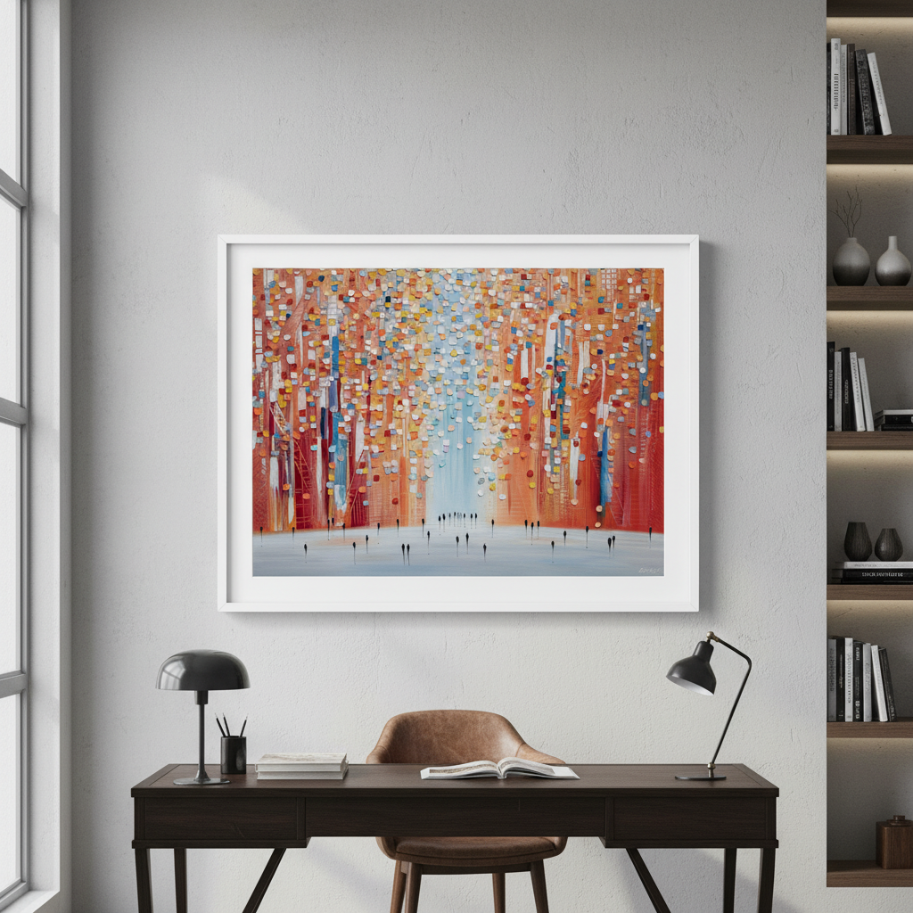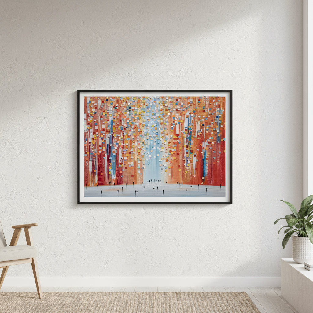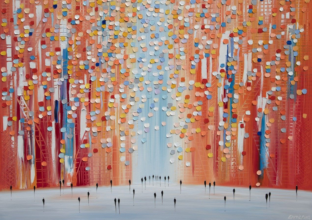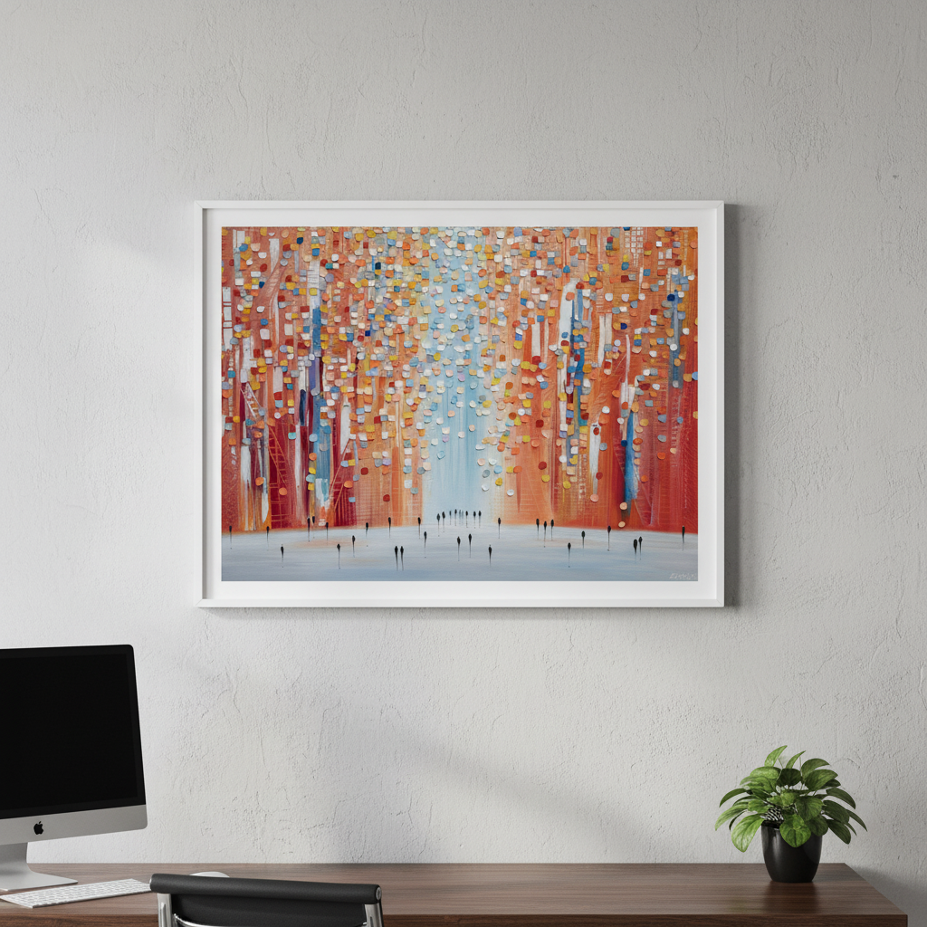 Sunset Motion by Ekaterina Ermilkina captures dynamic energy through a sophisticated interplay of vibrant dots and vertical lines against a serene light backdrop. This abstract composition balances movement with restraint, creating visual rhythm that draws the eye across the canvas. The carefully orchestrated colour palette suggests warmth and transition, while the geometric elements provide structural integrity to the piece. Ideal for contemporary interiors seeking artwork that stimulates conversation and contemplation without overwhelming the space.