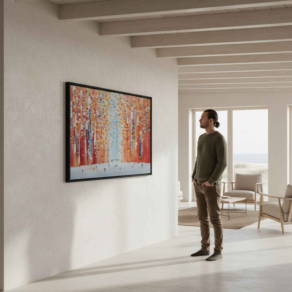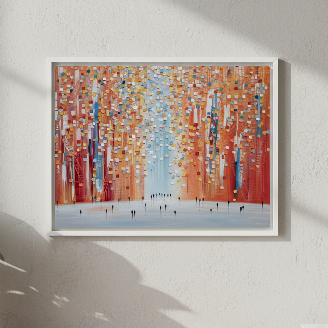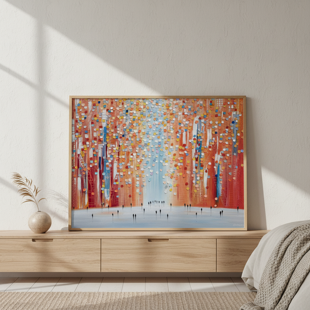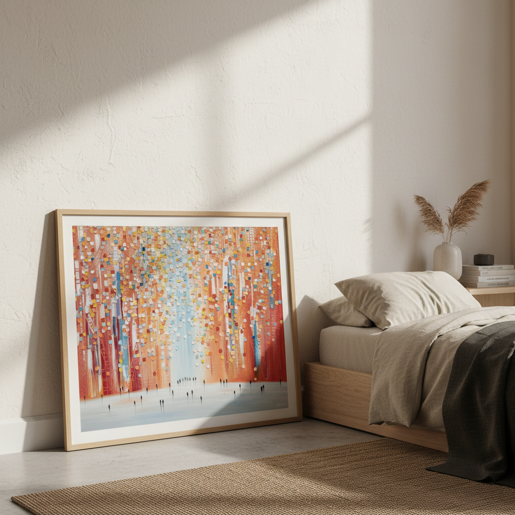 Sunset Motion by Ekaterina Ermilkina captures dynamic energy through a sophisticated interplay of vibrant dots and vertical lines against a serene light backdrop. This abstract composition balances movement with restraint, creating visual rhythm that draws the eye across the canvas. The carefully orchestrated colour palette suggests warmth and transition, while the geometric elements provide structural integrity to the piece. Ideal for contemporary interiors seeking artwork that stimulates conversation and contemplation without overwhelming the space.