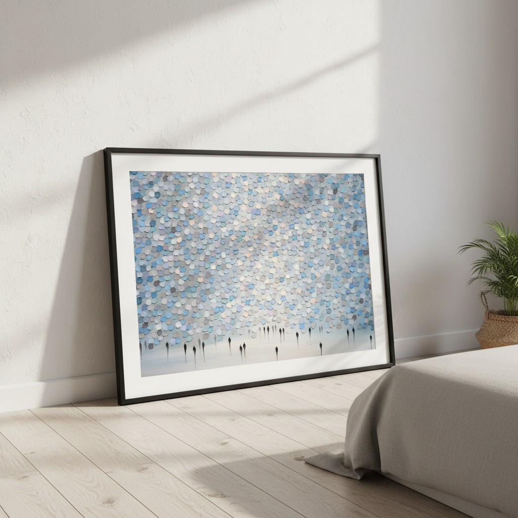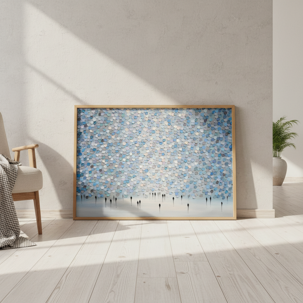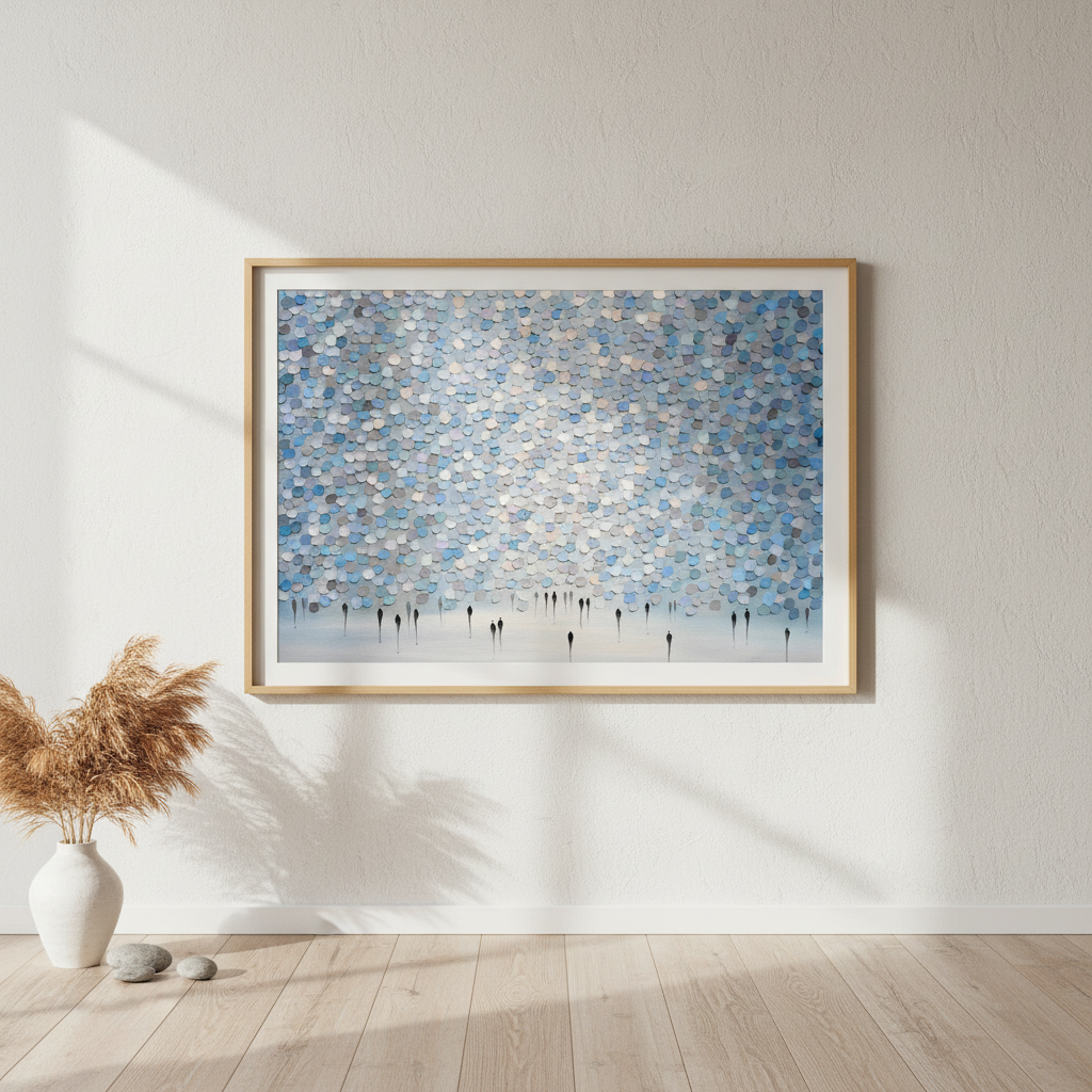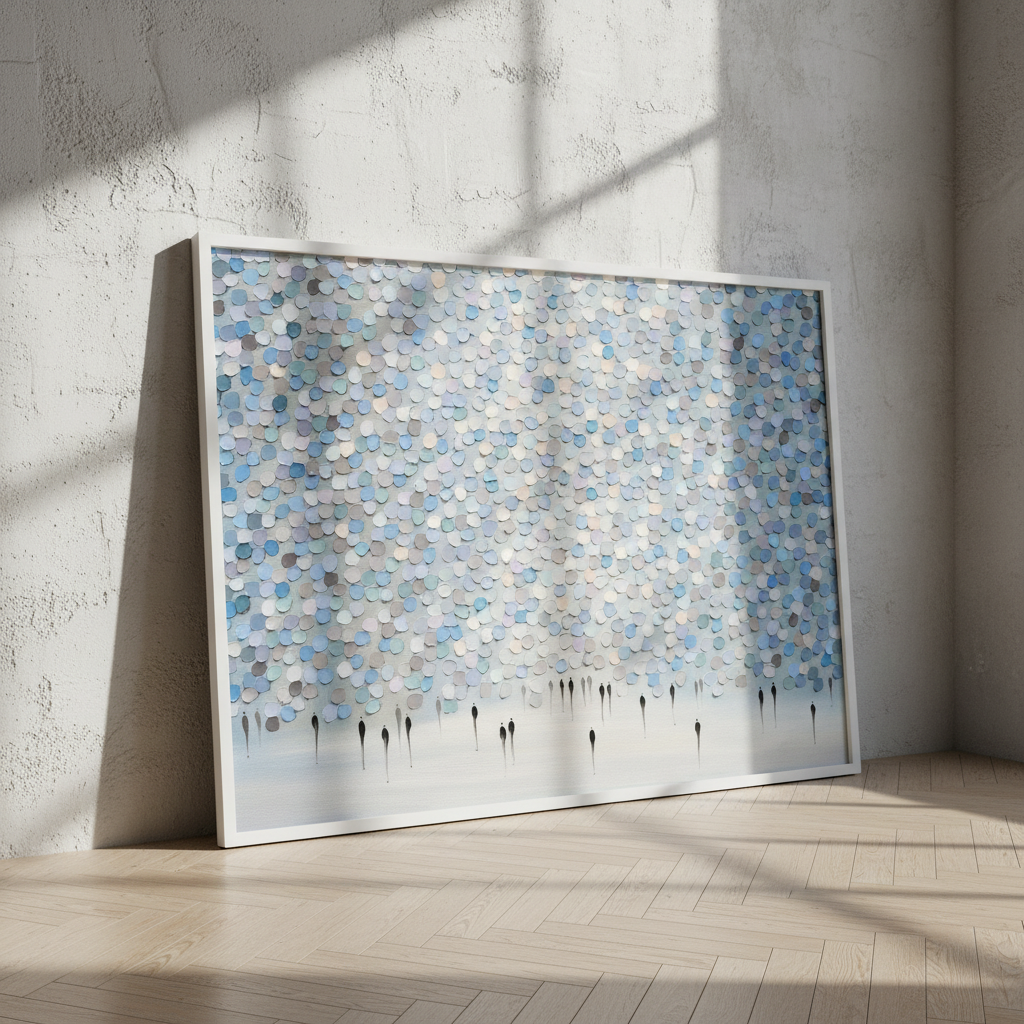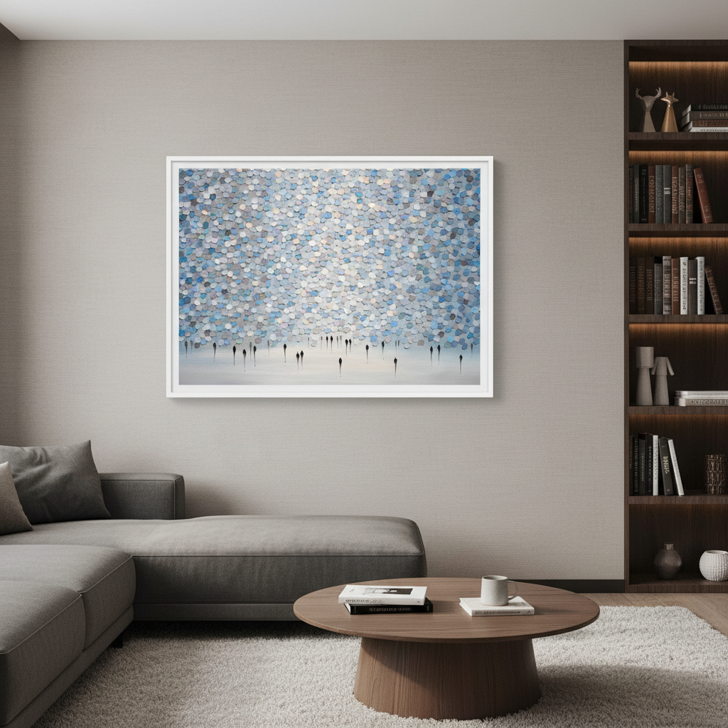 Veil of Drizzled Dreams showcases an expertly composed abstract composition featuring fluid circular patterns in sophisticated shades of blue and gray against a pristine white canvas. The layered, organic forms create a sense of movement and depth, evoking the ephemeral quality of mist or rainfall. This contemporary piece by Ekaterina Ermilkina demonstrates masterful control of colour harmony and spatial balance, making it an ideal selection for modern interiors seeking refined artistic sophistication without overwhelming visual complexity.