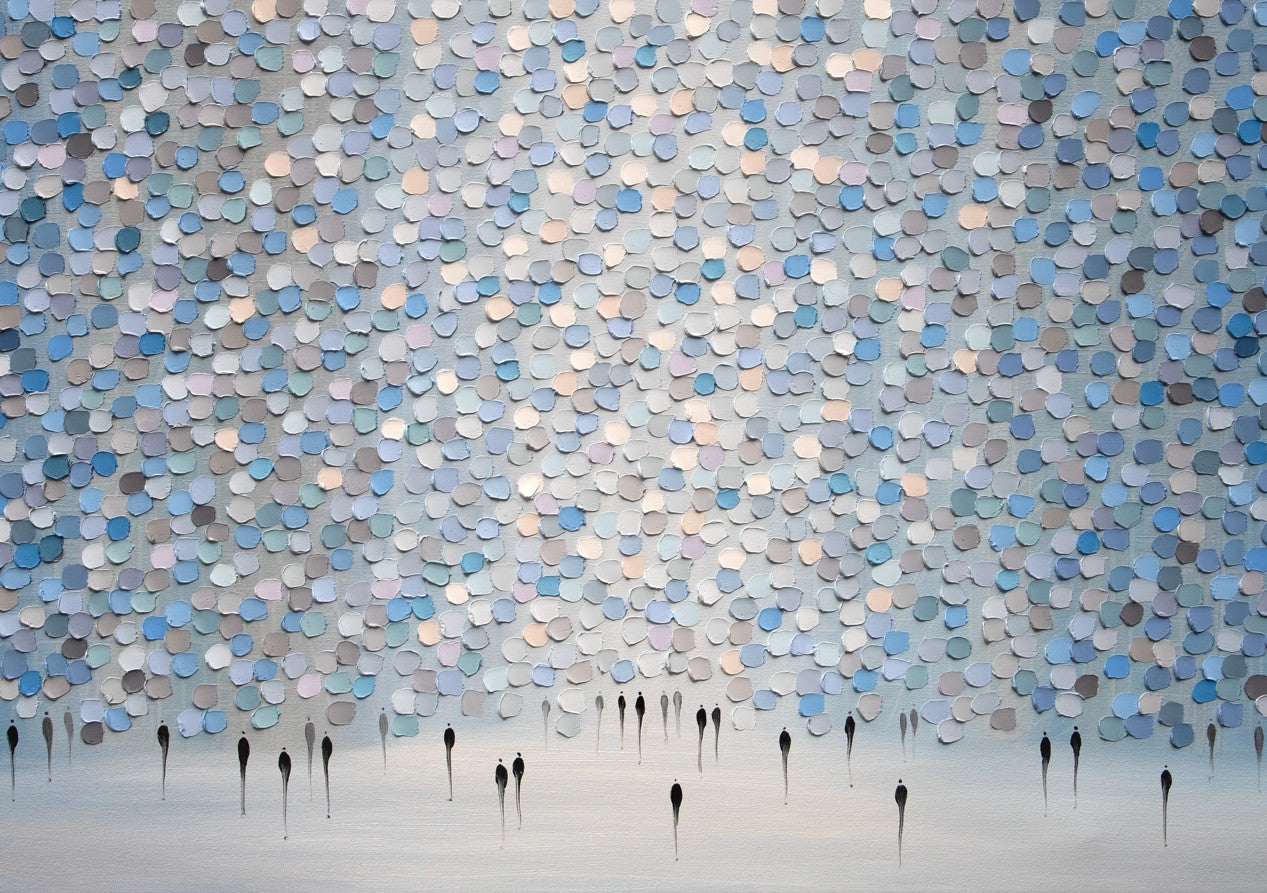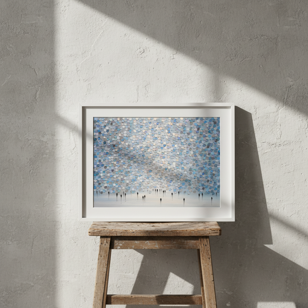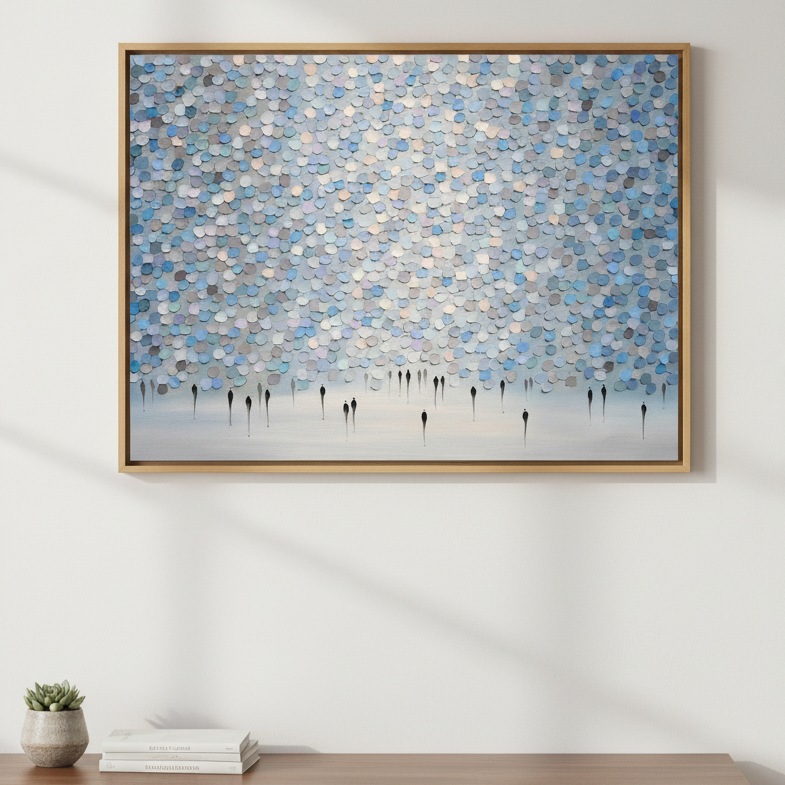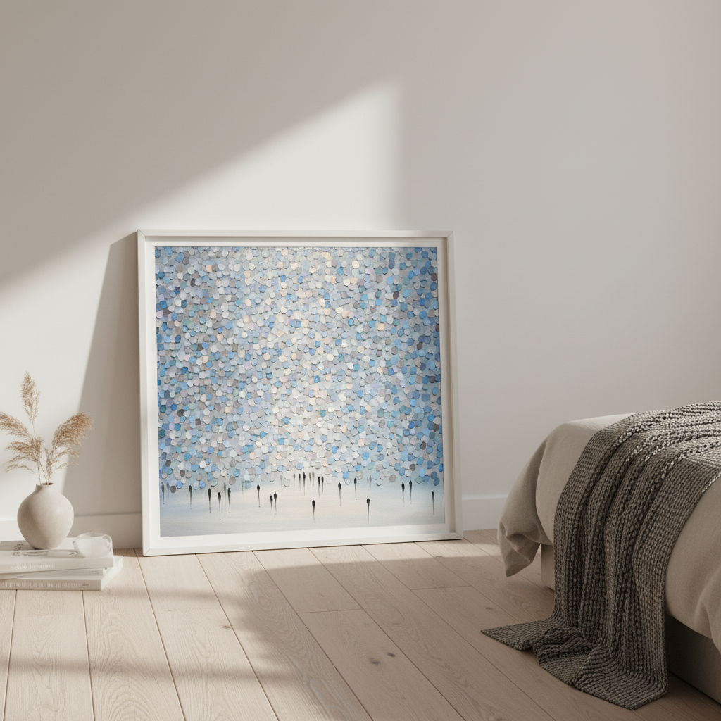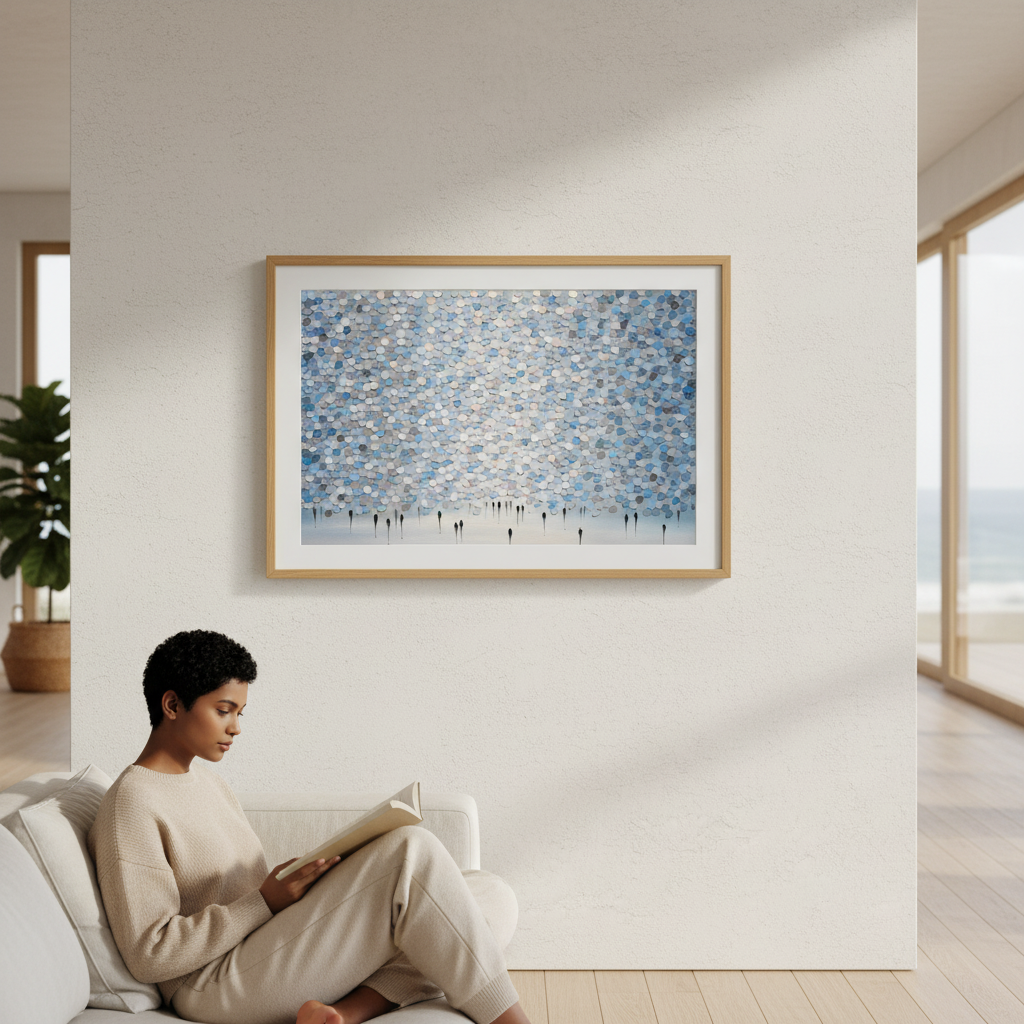 Veil of Drizzled Dreams showcases an expertly composed abstract composition featuring fluid circular patterns in sophisticated shades of blue and gray against a pristine white canvas. The layered, organic forms create a sense of movement and depth, evoking the ephemeral quality of mist or rainfall. This contemporary piece by Ekaterina Ermilkina demonstrates masterful control of colour harmony and spatial balance, making it an ideal selection for modern interiors seeking refined artistic sophistication without overwhelming visual complexity.