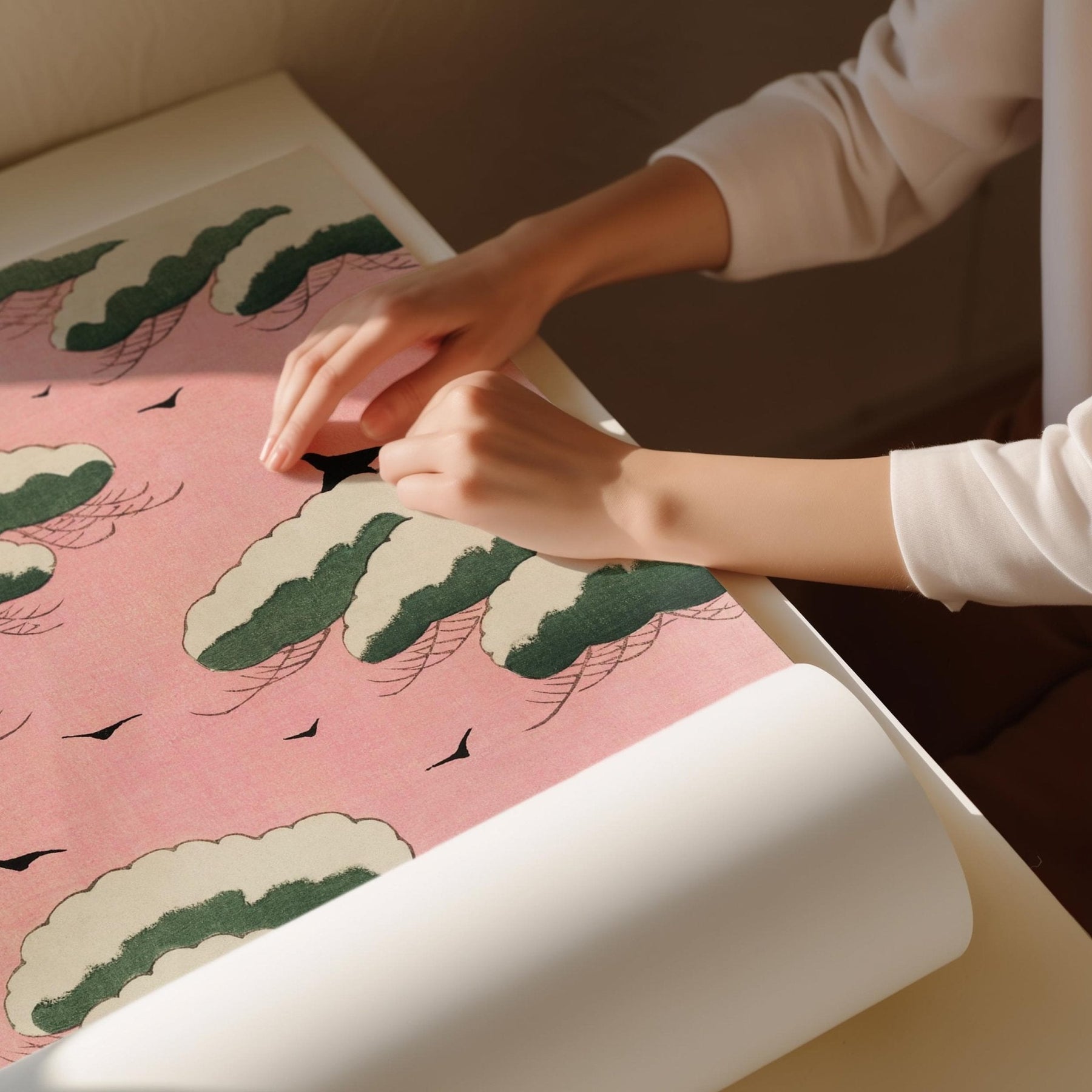 Elevate your space with the serene beauty of the Pink Sky By Bijutsu Sekai Wall Art. This stunning poster features a dreamy pink and white color palette, with graceful birds soaring over fluffy clouds, creating a sense of tranquility and freedom in any room. Perfect for adding a touch of whimsy and elegance to your home decor, this piece is sure to captivate and inspire all who behold it. Bring a touch of nature's beauty indoors with this enchanting wall art.