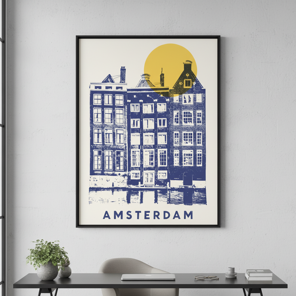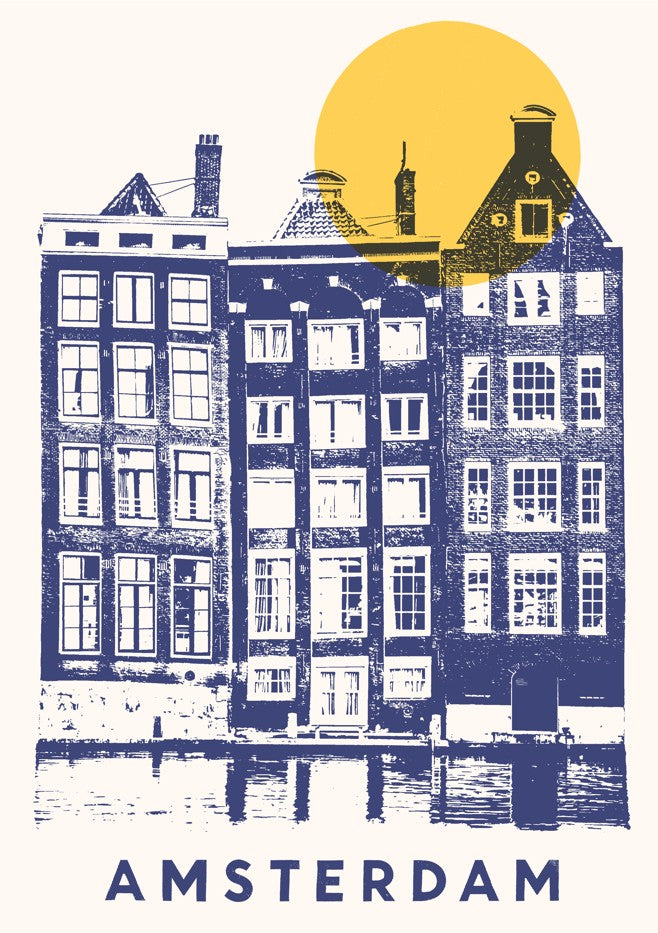 Discover the charm of Amsterdam's iconic canal houses in this delightful illustration by Florent Bodart. A cheerful yellow sun bathes the picturesque scene in warm, inviting light, capturing the essence of this beloved European destination. Perfect for adding a splash of colour and wanderlust to any room, this print brings the magic of Amsterdam's waterways and historic architecture straight to your walls. Ideal for travel enthusiasts, art lovers, and anyone seeking to brighten their space with a touch of continental flair.
