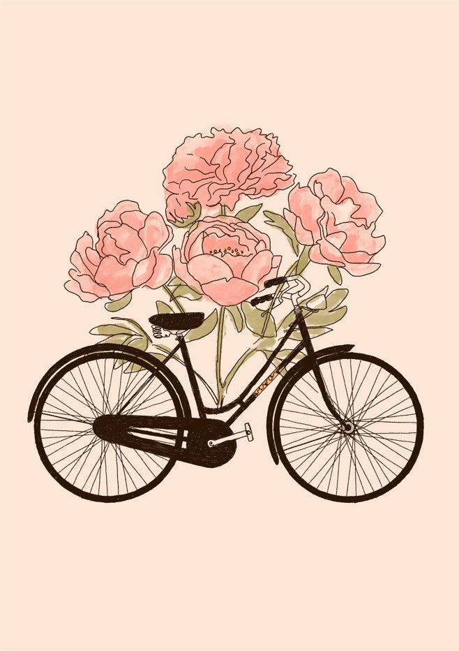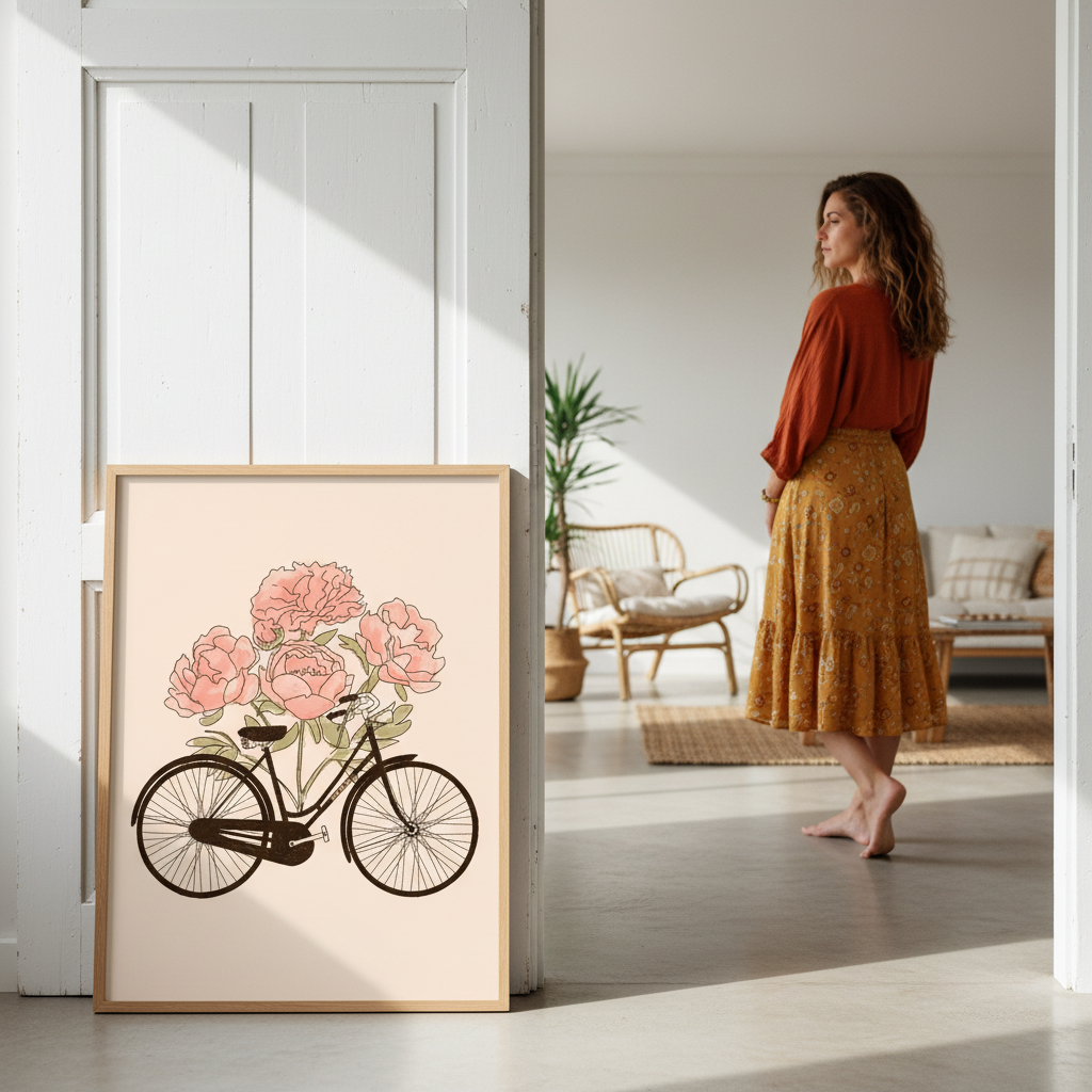 Pedal into romance with this charming vintage bicycle illustration featuring delicate pink blooms against a soft beige canvas. Perfect for adding a whimsical, European-inspired touch to any room, this piece captures the carefree spirit of cycling through flower-filled streets. Ideal for gallery walls, bedrooms, or spaces craving a dash of nostalgic charm and botanical beauty.