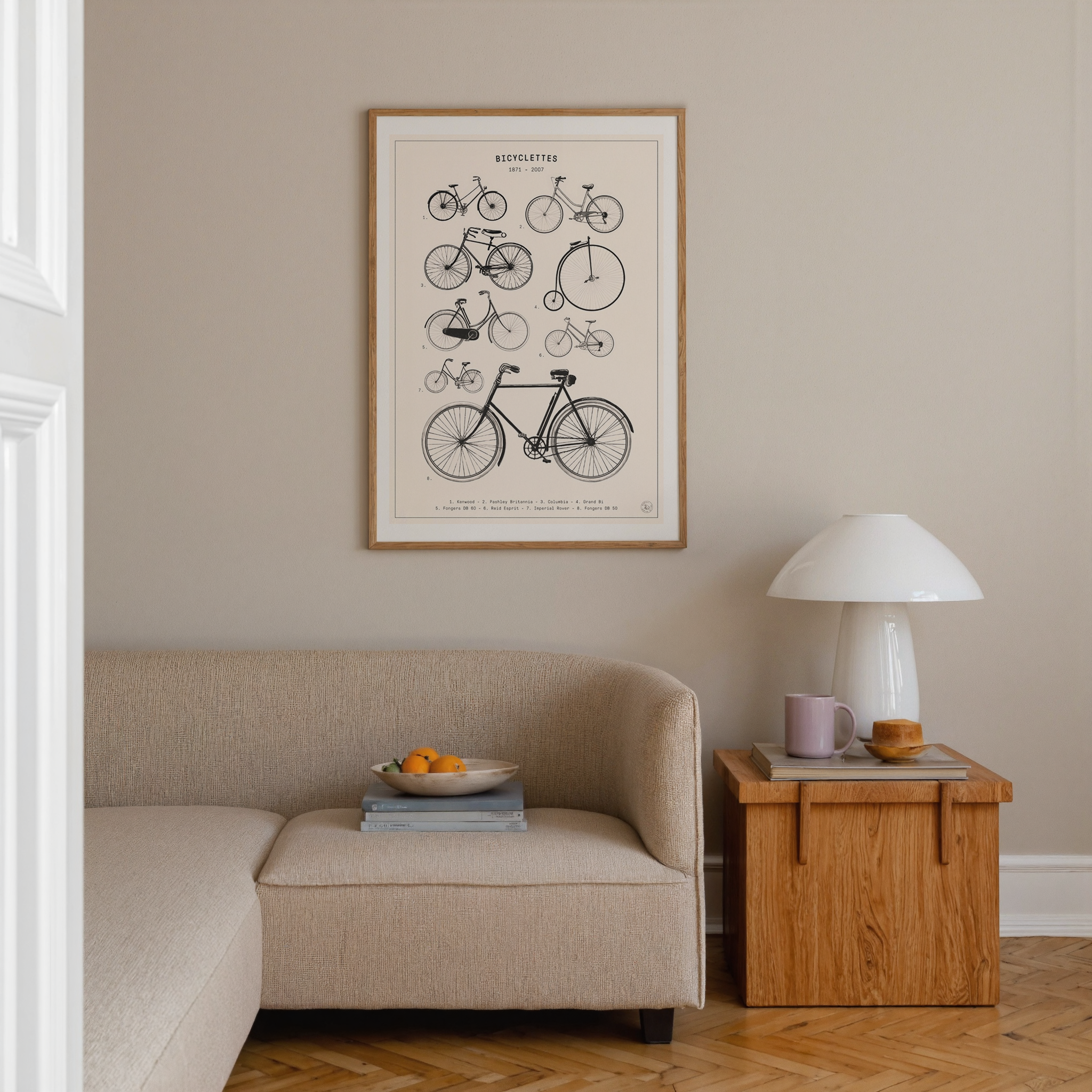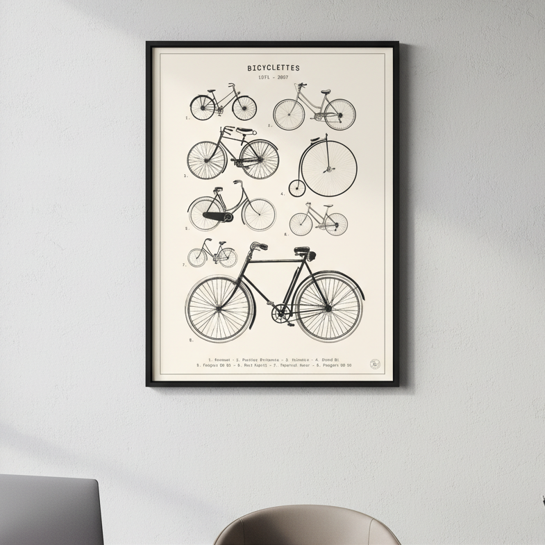 Pedal through history with this charming illustration showcasing the evolution of bicycle design across 136 years! From vintage penny-farthings to modern speedsters, Florent Bodart's "Bicyclettes" captures the delightful transformation of everyone's favourite two-wheeled companion. Set against a crisp white background, this cream-toned artwork celebrates cycling culture with a whimsical touch—perfect for adding nostalgic charm to any room. Whether you're a cycling enthusiast or simply love design history, this piece brings playful personality and timeless appeal to your walls.