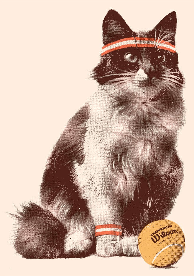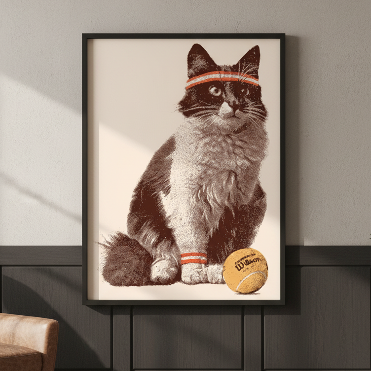 Meet the purr-fect match for tennis lovers and cat enthusiasts alike! This charming illustration features an adorable feline sporting a sporty headband, ready to serve up some serious cuteness. Against a soothing beige backdrop, the playful cat clutches a bright tennis ball, capturing that competitive spirit with a whimsical twist. Ideal for adding a dash of personality to any room, this artwork celebrates the fun side of the game. Whether you're a tennis fan, a cat lover, or simply someone who appreciates quirky, feel-good art, this piece brings joy and character to your space.
