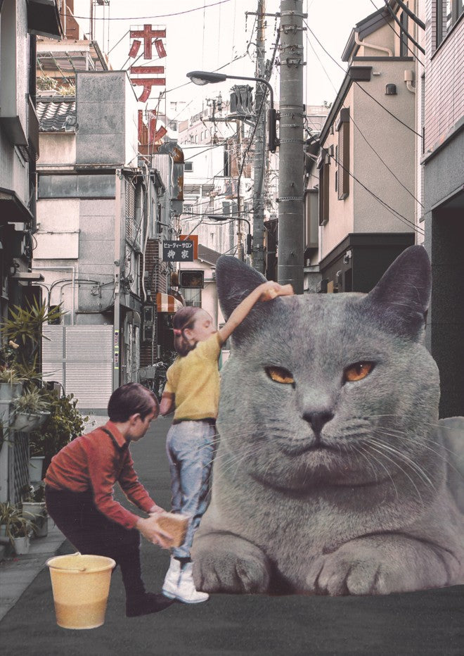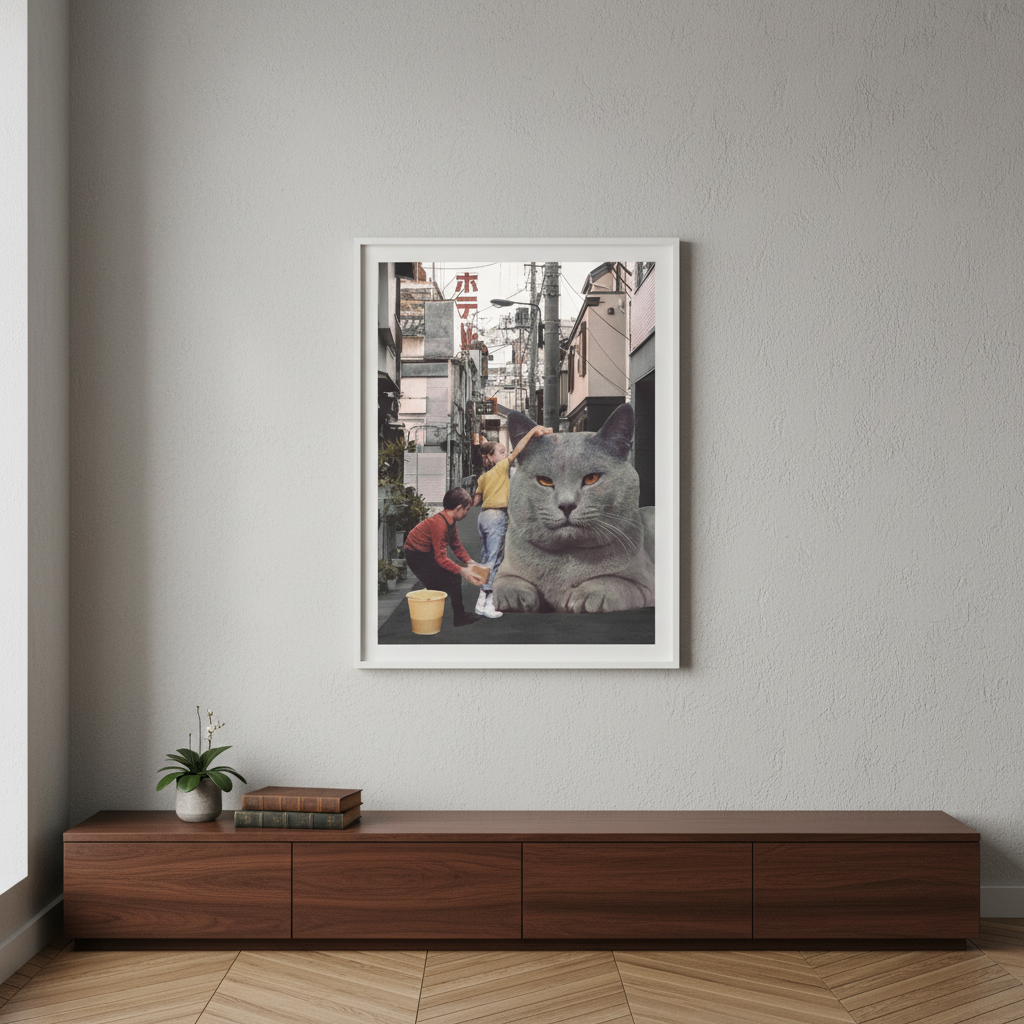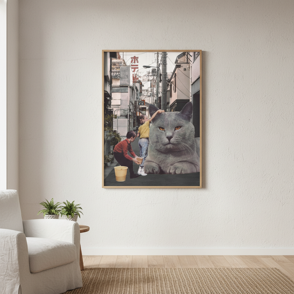 Discover the whimsical charm of this delightful artwork featuring two children gleefully washing an oversized feline friend amidst the bustling Tokyo streets. Created by artist Florent Bodart, this playful piece captures a moment of pure joy and imagination, blending urban energy with childlike wonder. Perfect for adding a touch of quirky humour and artistic flair to any space, this print celebrates the magic that happens when creativity meets everyday city life. A conversation starter that brings smiles to both kids and adults alike.