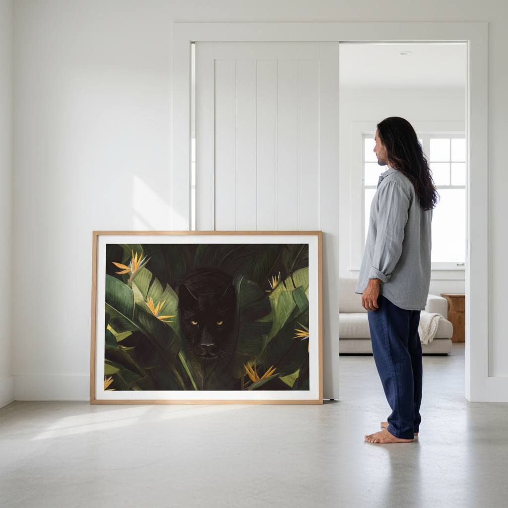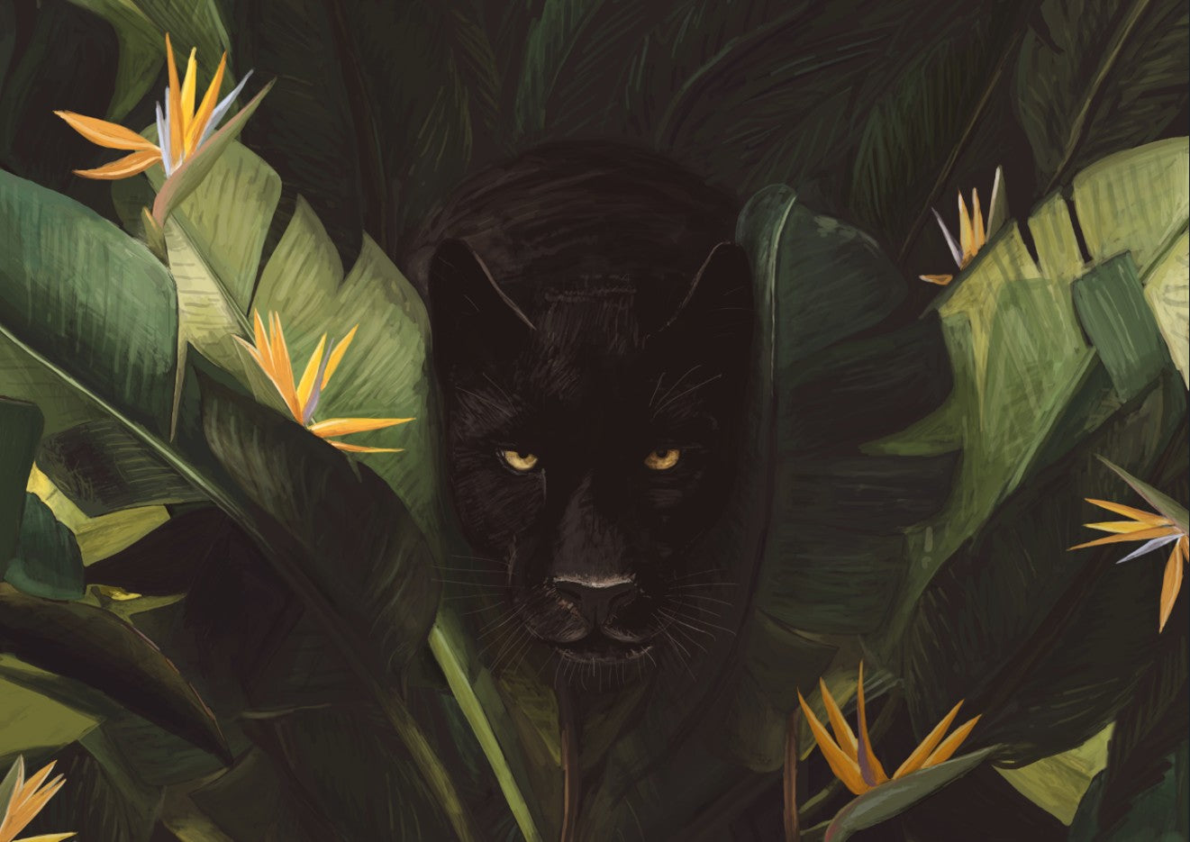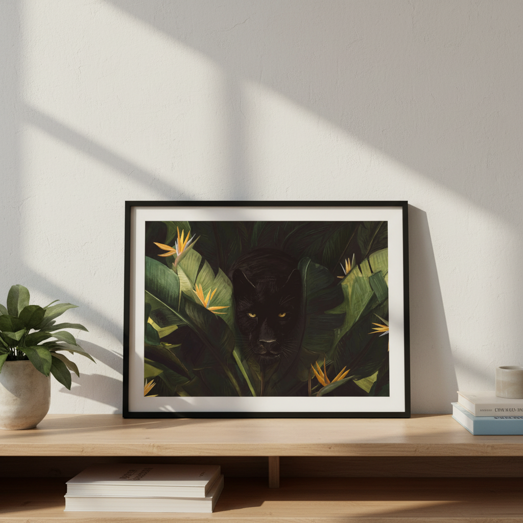 Discover the wild side of your décor with this stunning artwork featuring a sleek black panther mysteriously peering through lush tropical foliage and vibrant birds of paradise flowers. Florent Bodart's playful composition brings the jungle to life, blending exotic flora with feline intrigue. Perfect for adding a touch of adventure and natural beauty to any room, this piece captures the magic of the wild in a way that's both bold and whimsical. A conversation starter that celebrates nature's most captivating creatures.