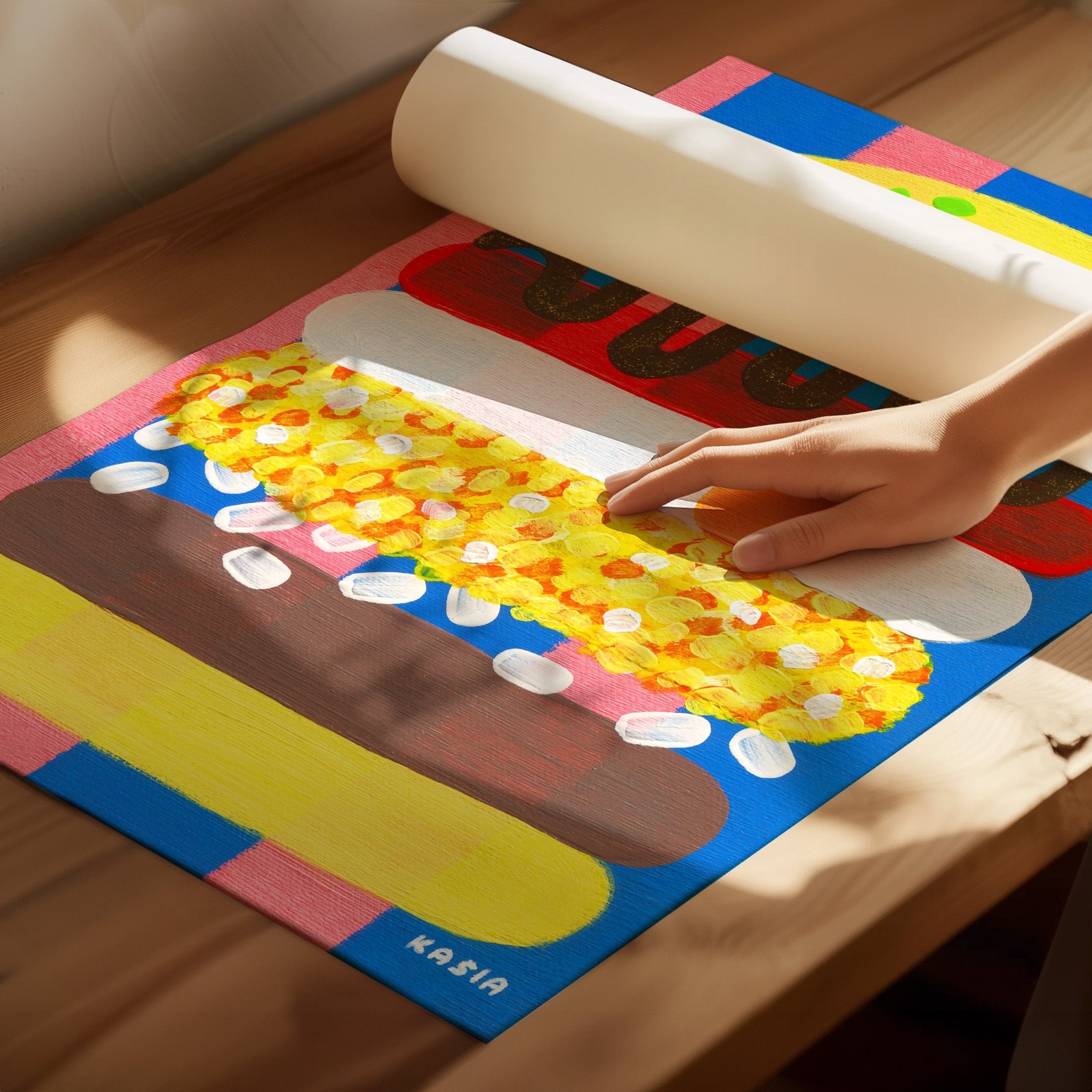 Elevate your space with this vibrant four-piece illustration set by acclaimed artist Kasia Sykus. Each print celebrates the artistry of burger culture through bold, contemporary designs that inject personality into any room. Perfect for kitchens, living areas, or bedrooms, these playful compositions combine artistic sophistication with approachable humour. The cohesive collection works beautifully as a gallery wall or distributed throughout your home. Ideal for food enthusiasts and art lovers alike, this set transforms ordinary walls into conversation-starting focal points while maintaining professional aesthetic appeal.