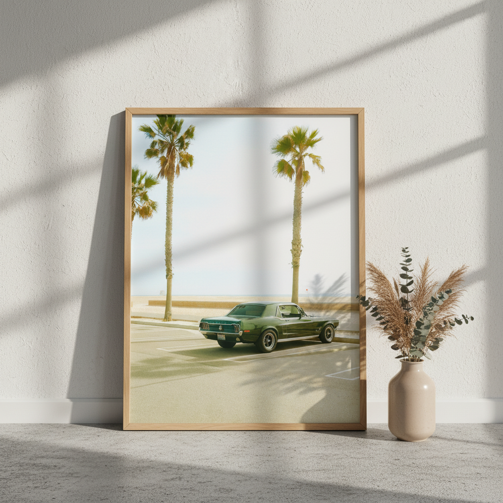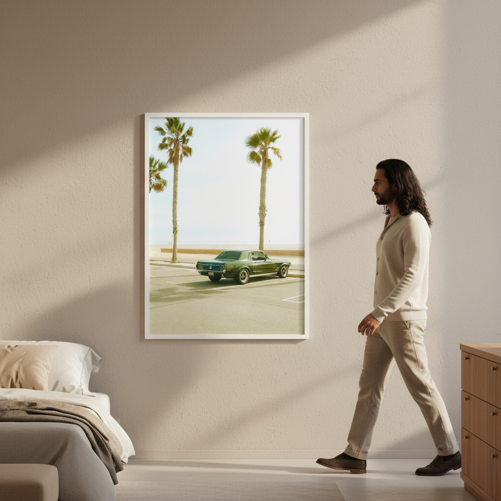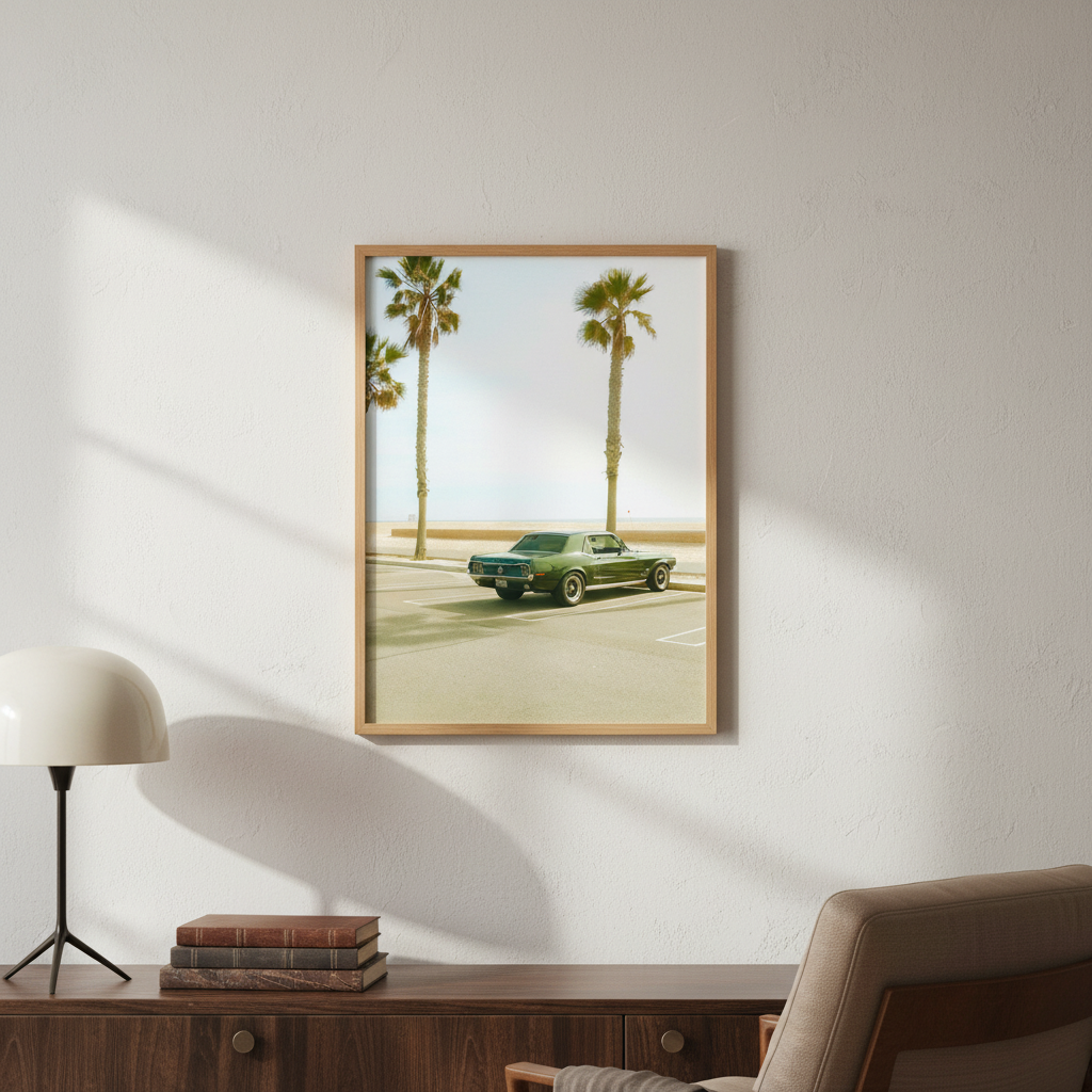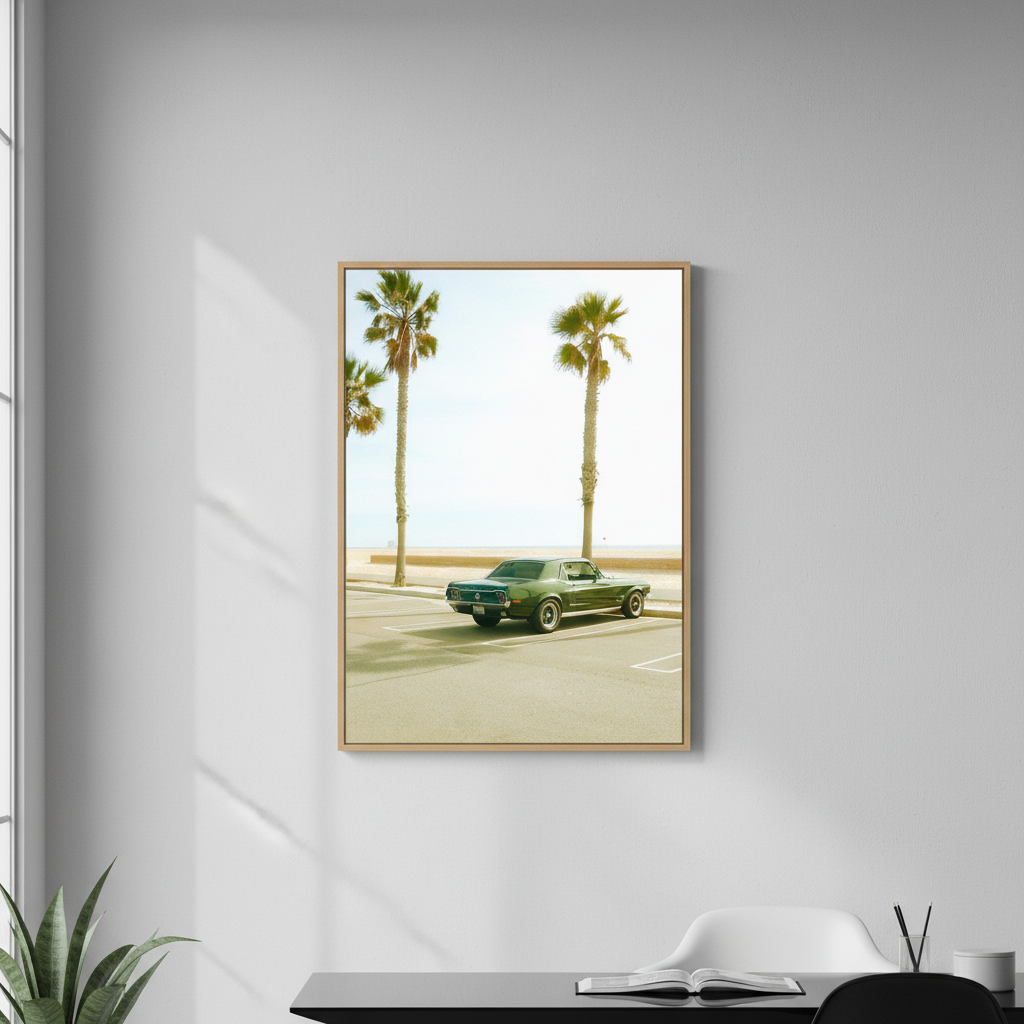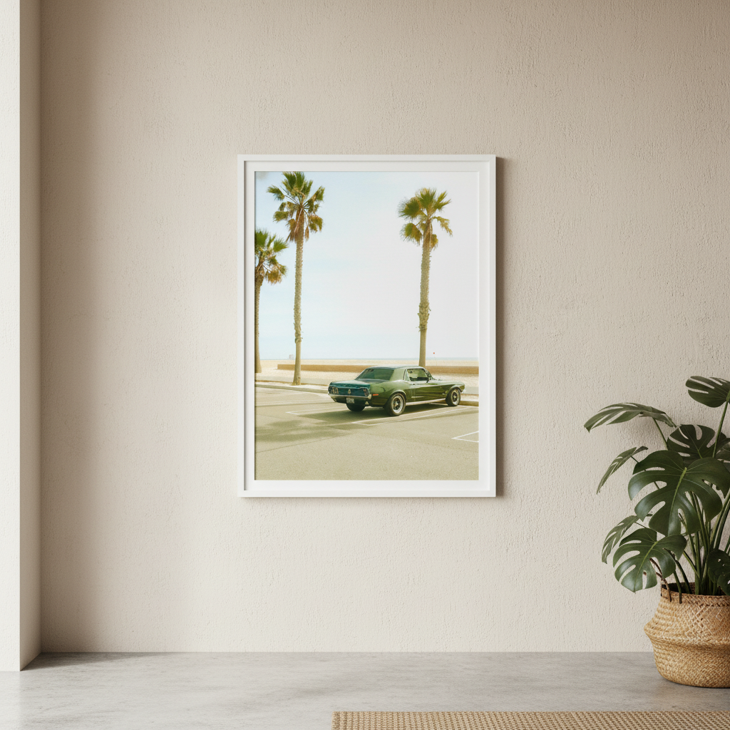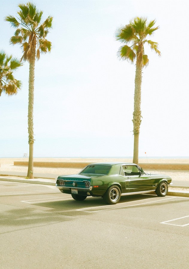 Beach Day by Gelica Peralta captures a nostalgic moment frozen in time—a vintage green automobile positioned along a scenic coastal route, framed by swaying palms that evoke tropical tranquility. This artwork masterfully blends automotive heritage with landscape aesthetics, creating a compelling visual narrative that transports viewers to a leisurely seaside escape. The composition balances the geometric precision of the classic vehicle against the organic flow of natural elements, resulting in a sophisticated piece that appeals to collectors of automotive art and vintage-inspired décor. Perfect for spaces seeking character and timeless appeal.