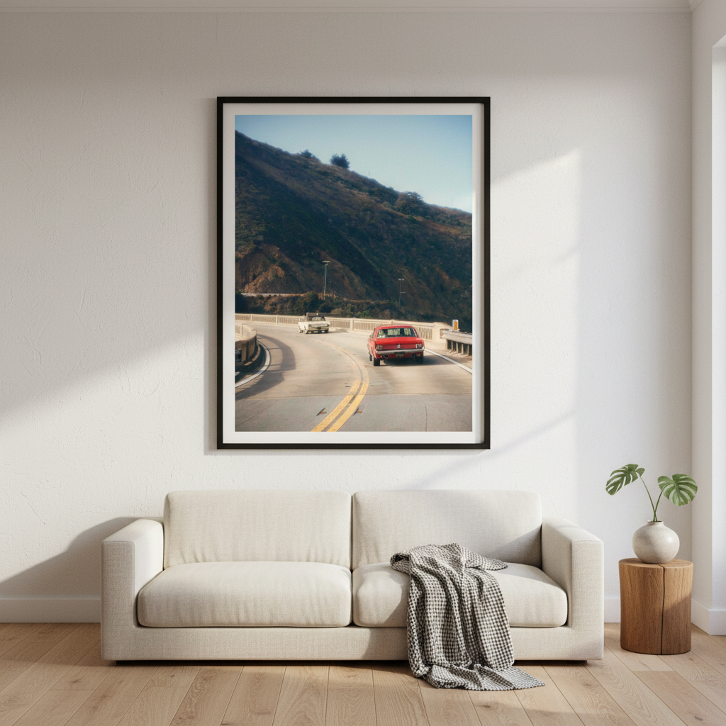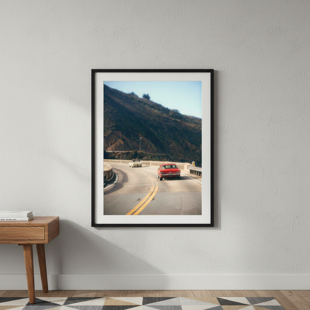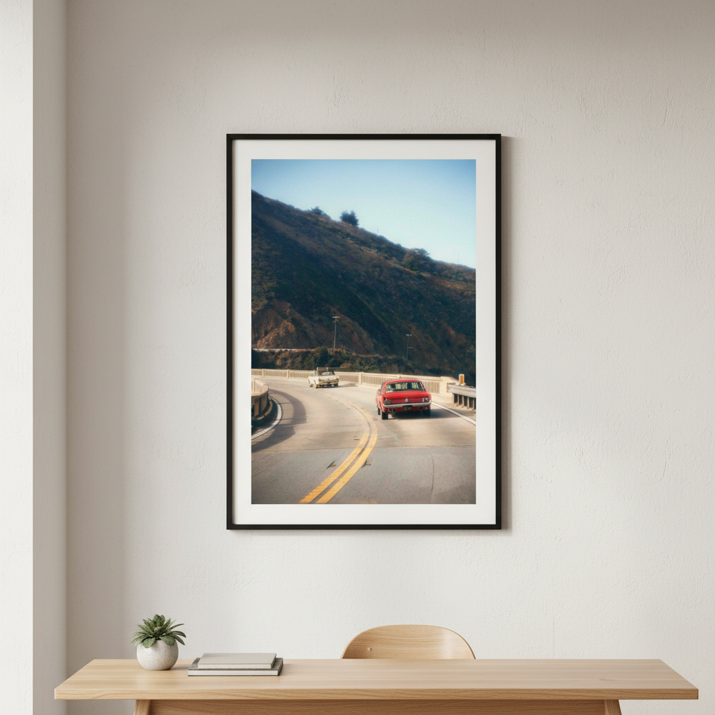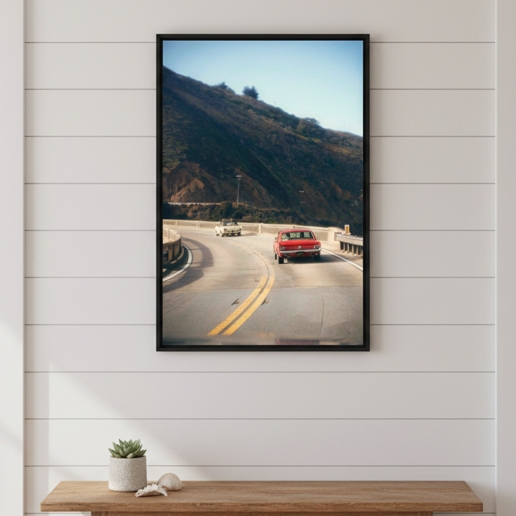 Cruisin' by Gelica Peralta captures the exhilaration of open-road adventure through dynamic composition and vivid colour. This striking artwork depicts a crimson vehicle navigating serpentine mountain passes, evoking the freedom and thrill of journey. The layered landscape—from foreground motion to distant peaks—creates compelling depth, while the artist's masterful use of contrast draws the eye through the scene. Perfect for automotive enthusiasts and travel lovers, this piece transforms any space into a gallery celebrating movement, exploration, and the romance of the drive.