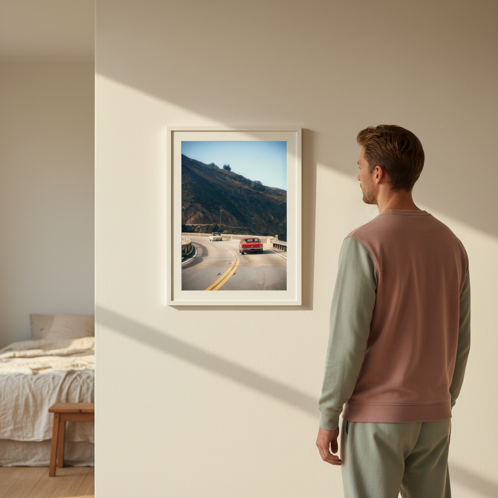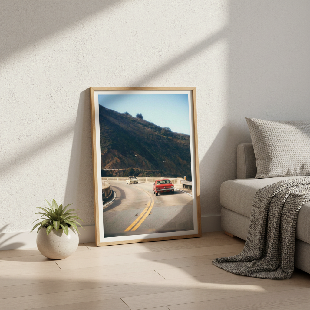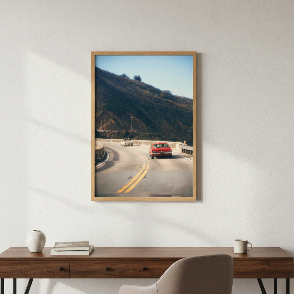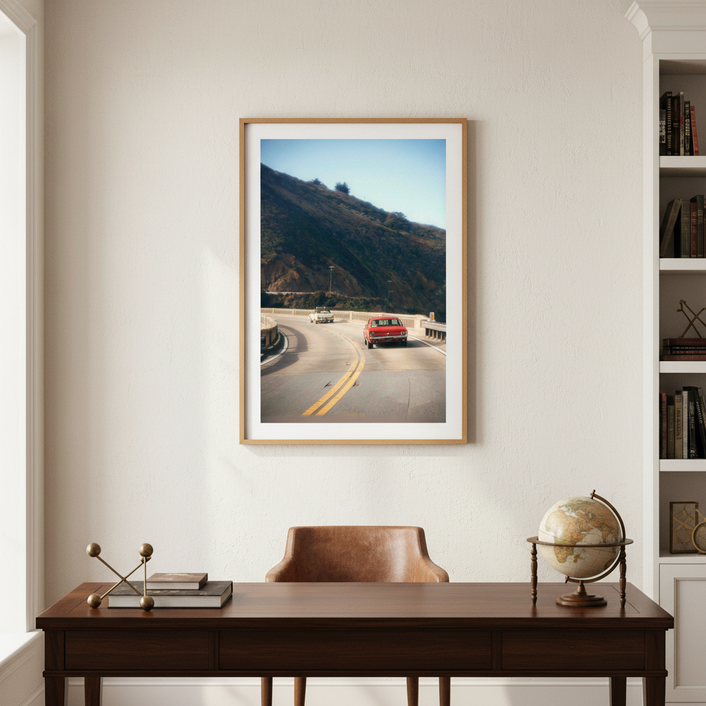 Cruisin' by Gelica Peralta captures the exhilaration of open-road adventure through dynamic composition and vivid colour. This striking artwork depicts a crimson vehicle navigating serpentine mountain passes, evoking the freedom and thrill of journey. The layered landscape—from foreground motion to distant peaks—creates compelling depth, while the artist's masterful use of contrast draws the eye through the scene. Perfect for automotive enthusiasts and travel lovers, this piece transforms any space into a gallery celebrating movement, exploration, and the romance of the drive.