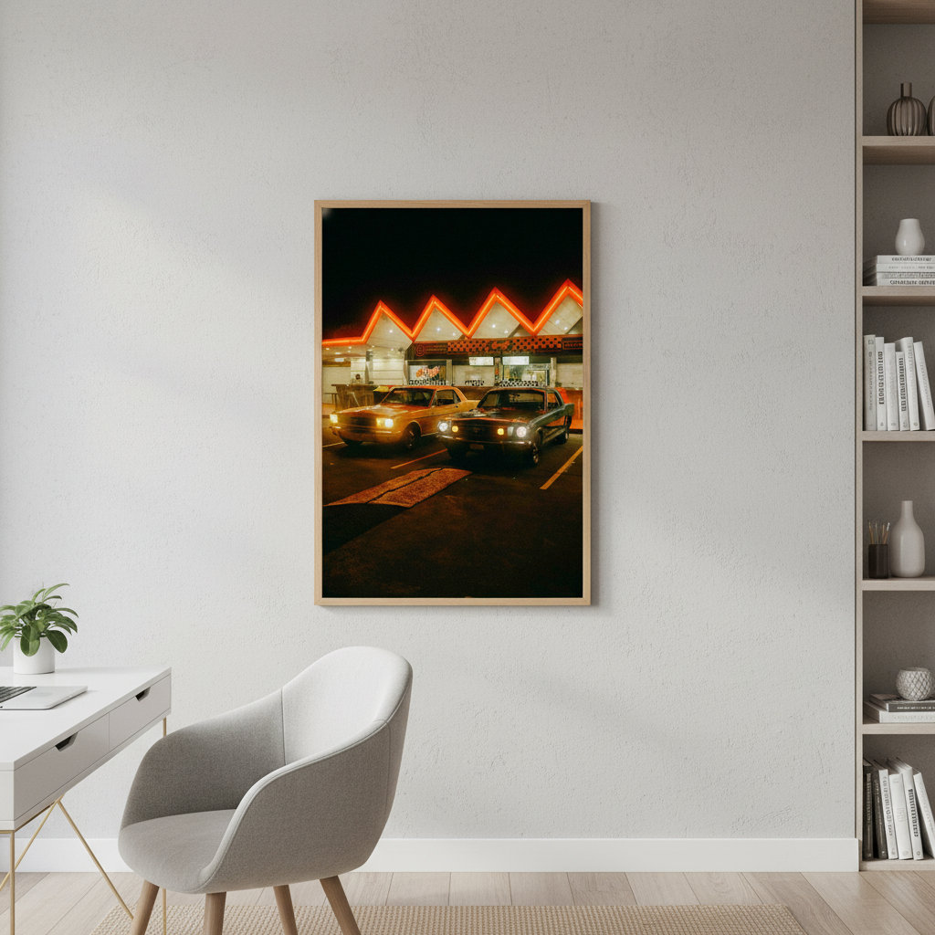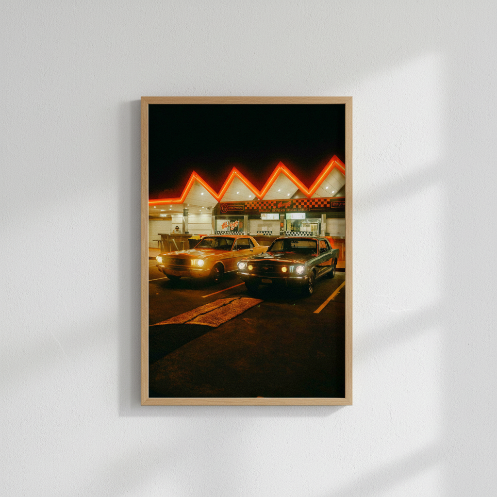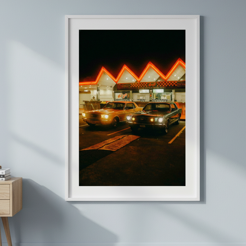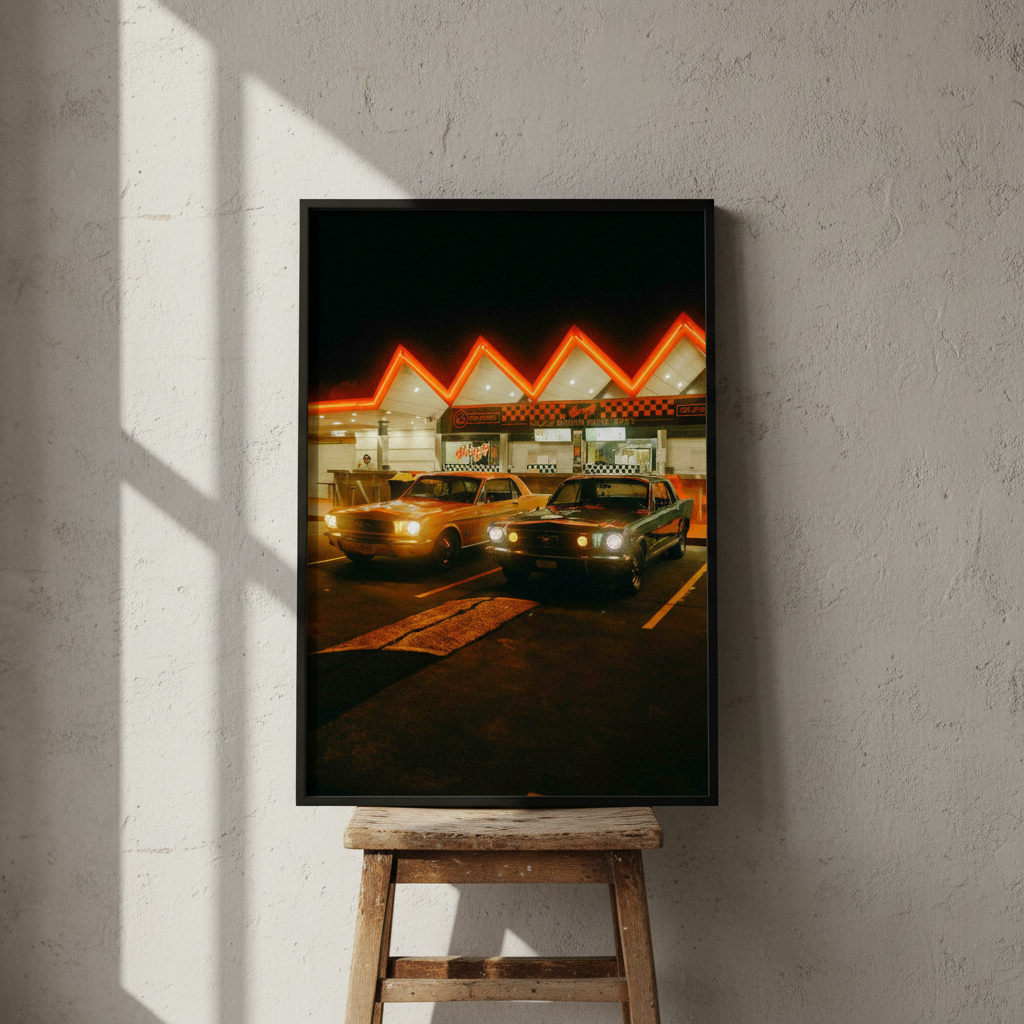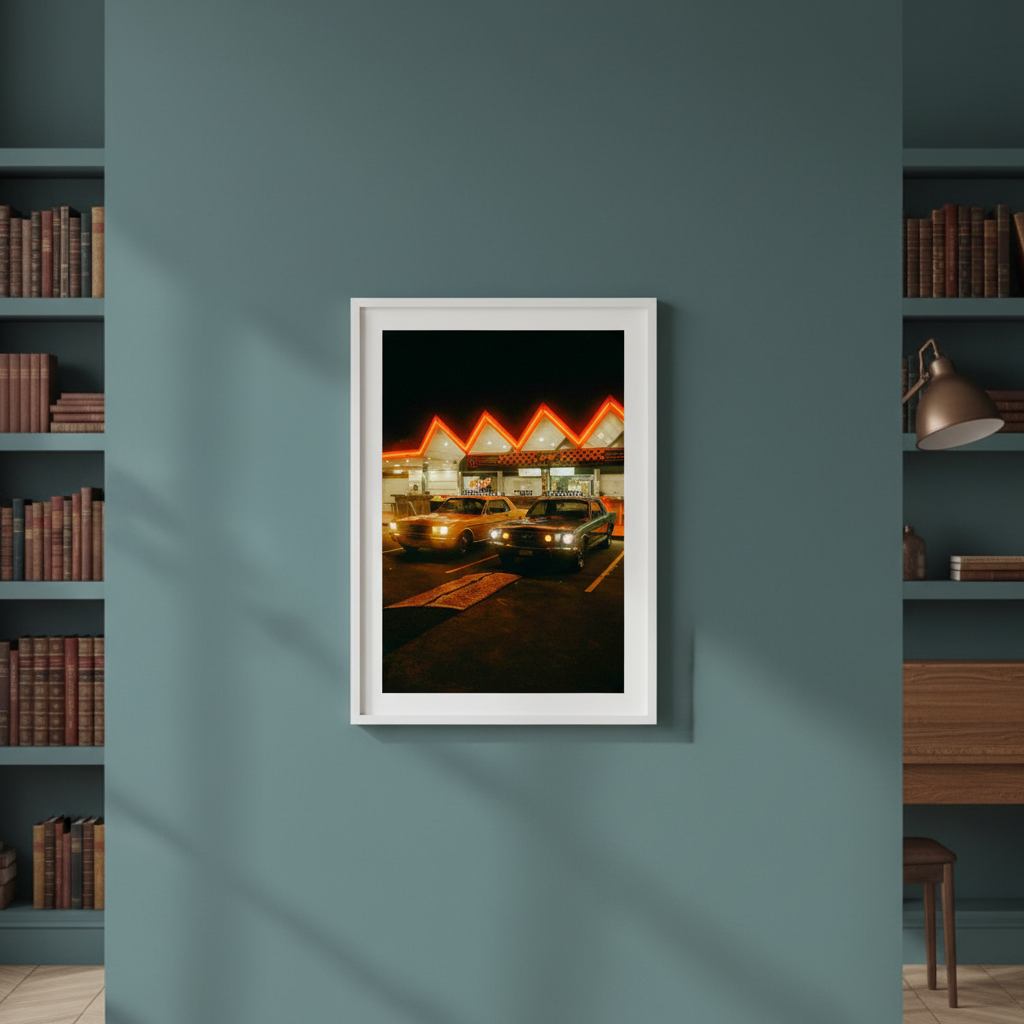 Pit Stop by Gelica Peralta captures a quintessential moment of urban nightlife through striking visual composition. This artwork depicts two vintage automobiles positioned before an illuminated building, their classic silhouettes contrasted against the warm glow of neon signage. The piece evokes nostalgia whilst celebrating the aesthetic appeal of retro vehicles and architectural character. Gelica Peralta's execution emphasizes atmospheric lighting and period detail, making this an ideal selection for collectors who appreciate automotive history and contemporary art that bridges vintage and modern sensibilities.
