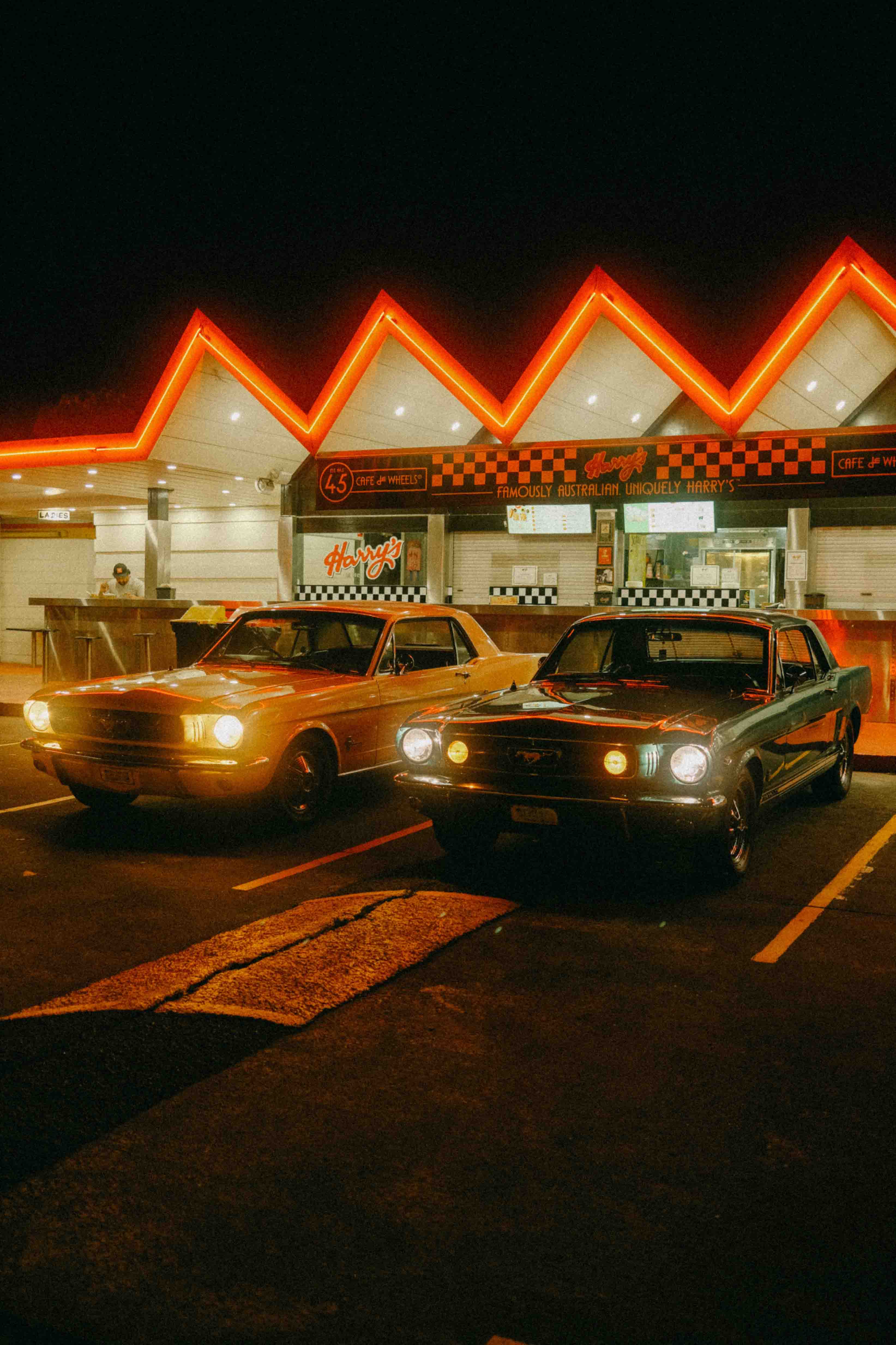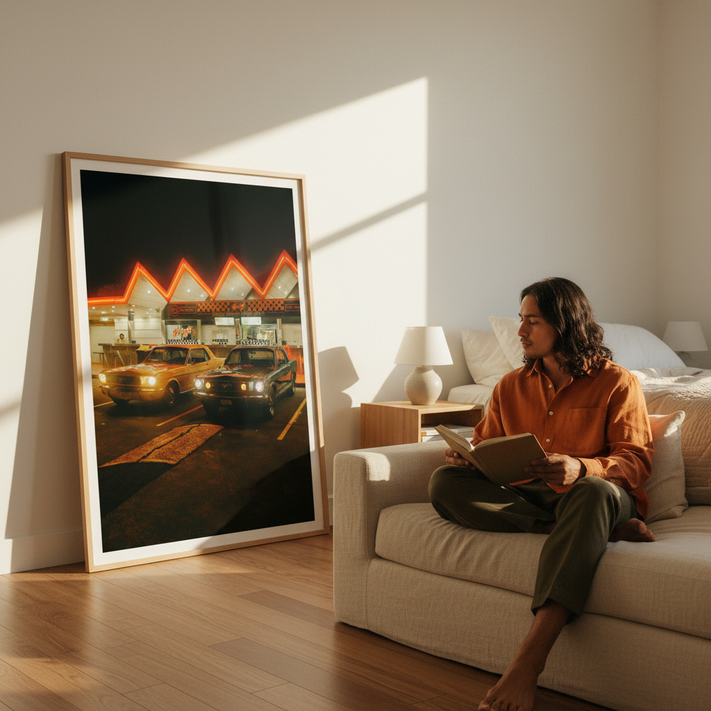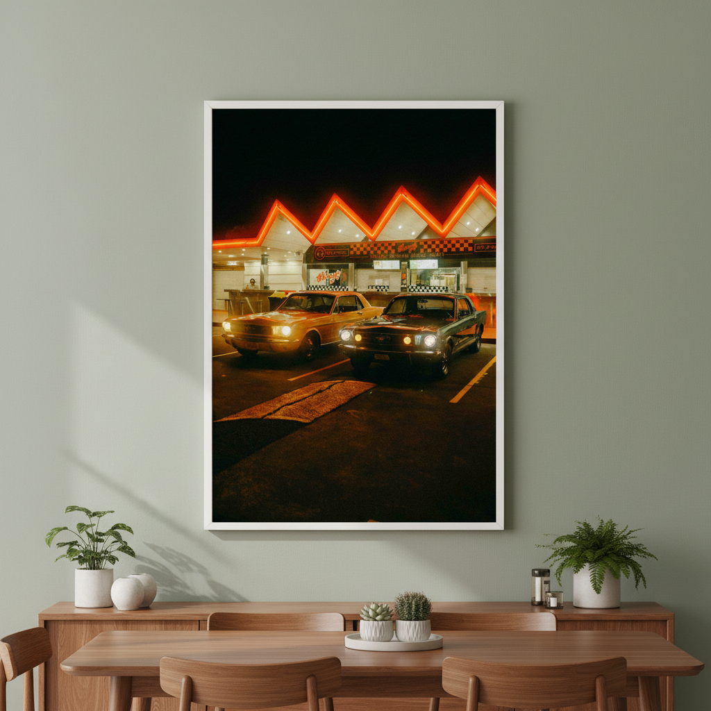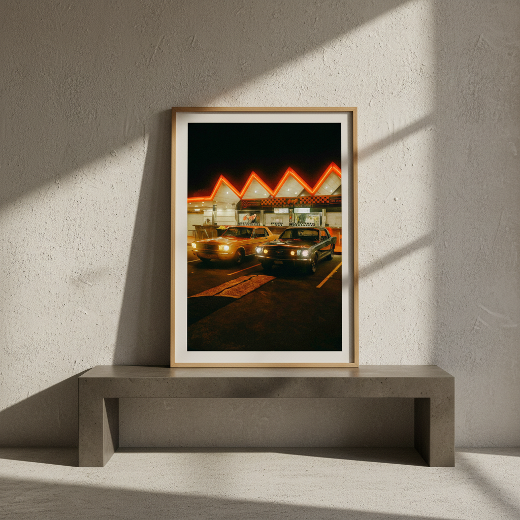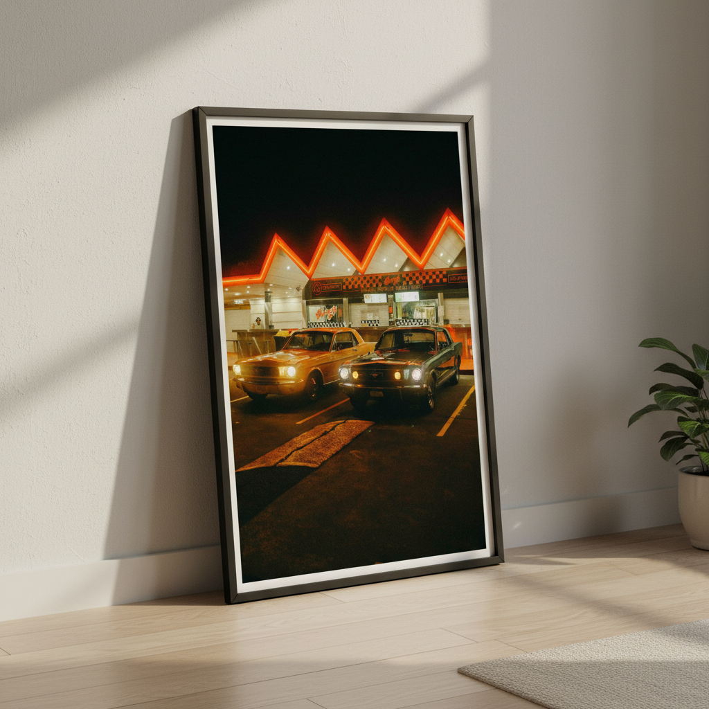 Pit Stop by Gelica Peralta captures a quintessential moment of urban nightlife through striking visual composition. This artwork depicts two vintage automobiles positioned before an illuminated building, their classic silhouettes contrasted against the warm glow of neon signage. The piece evokes nostalgia whilst celebrating the aesthetic appeal of retro vehicles and architectural character. Gelica Peralta's execution emphasizes atmospheric lighting and period detail, making this an ideal selection for collectors who appreciate automotive history and contemporary art that bridges vintage and modern sensibilities.