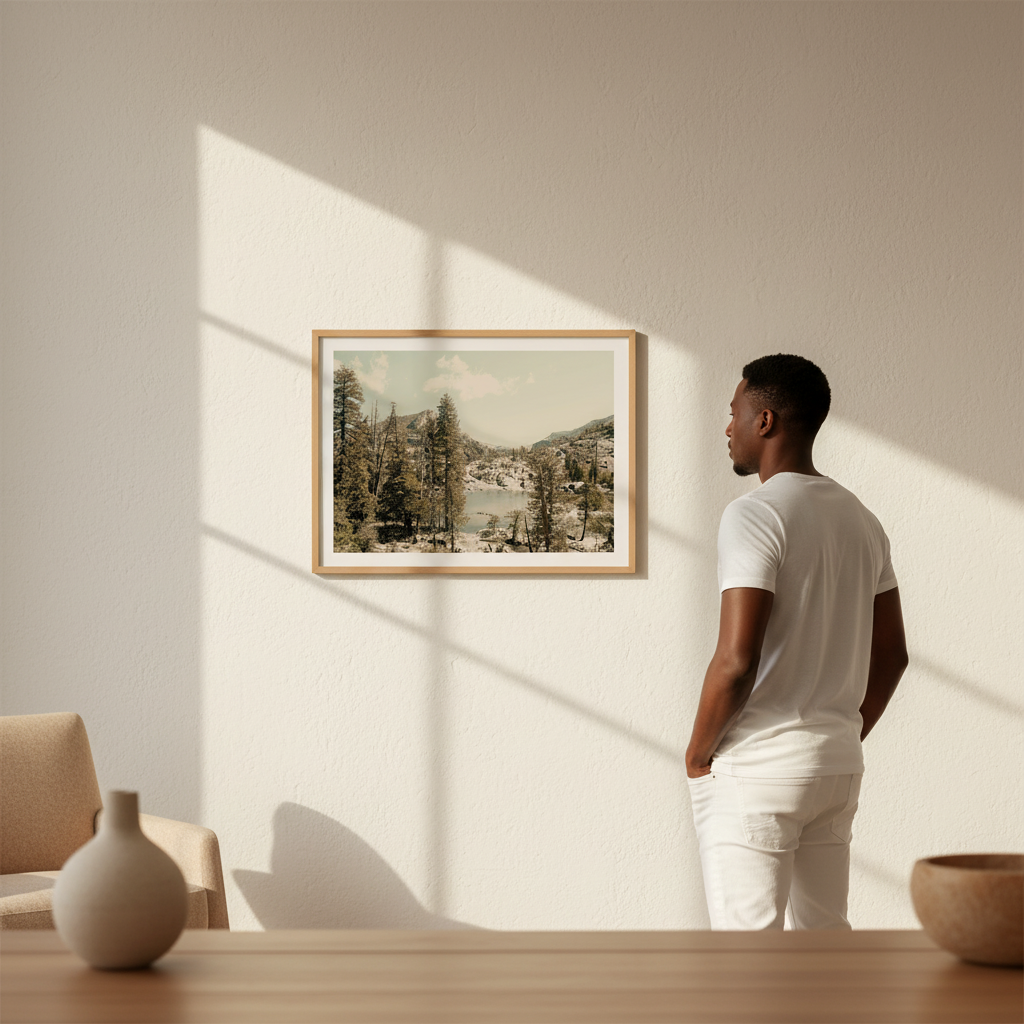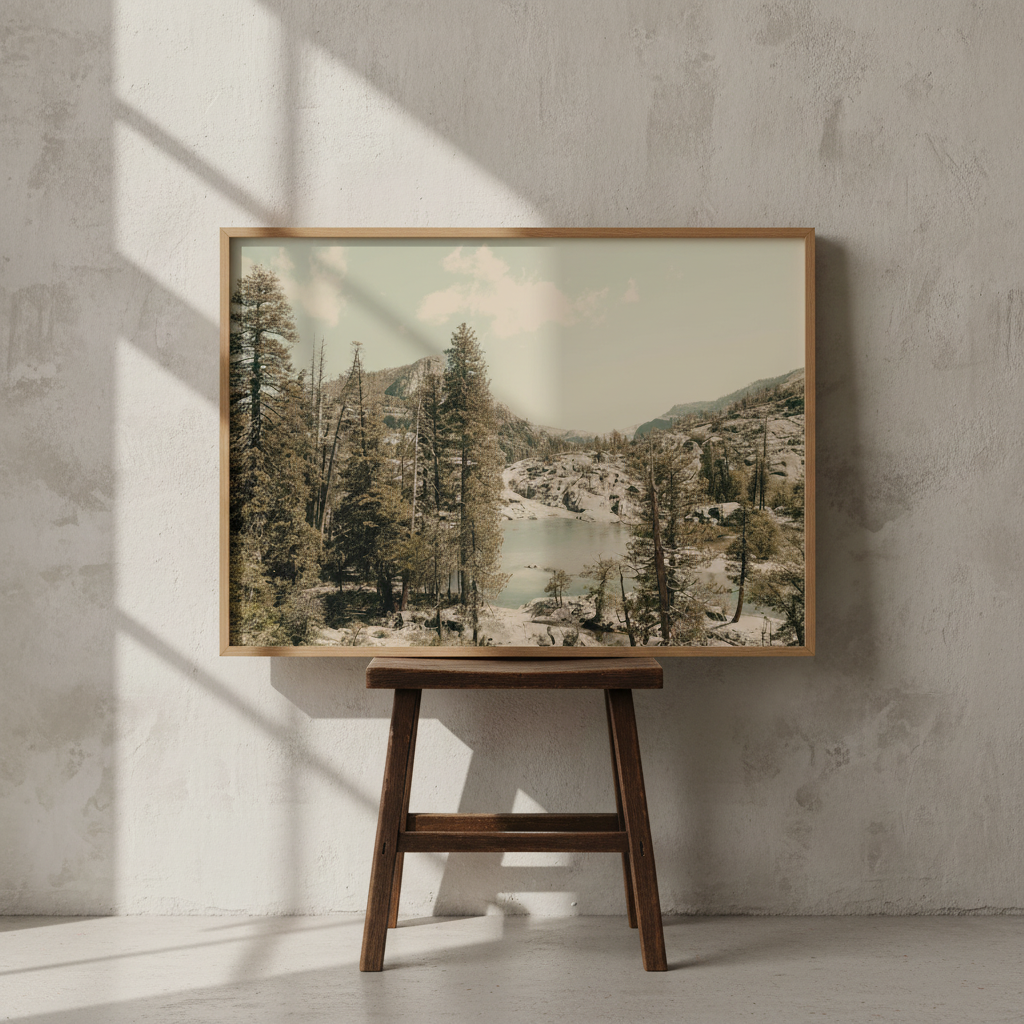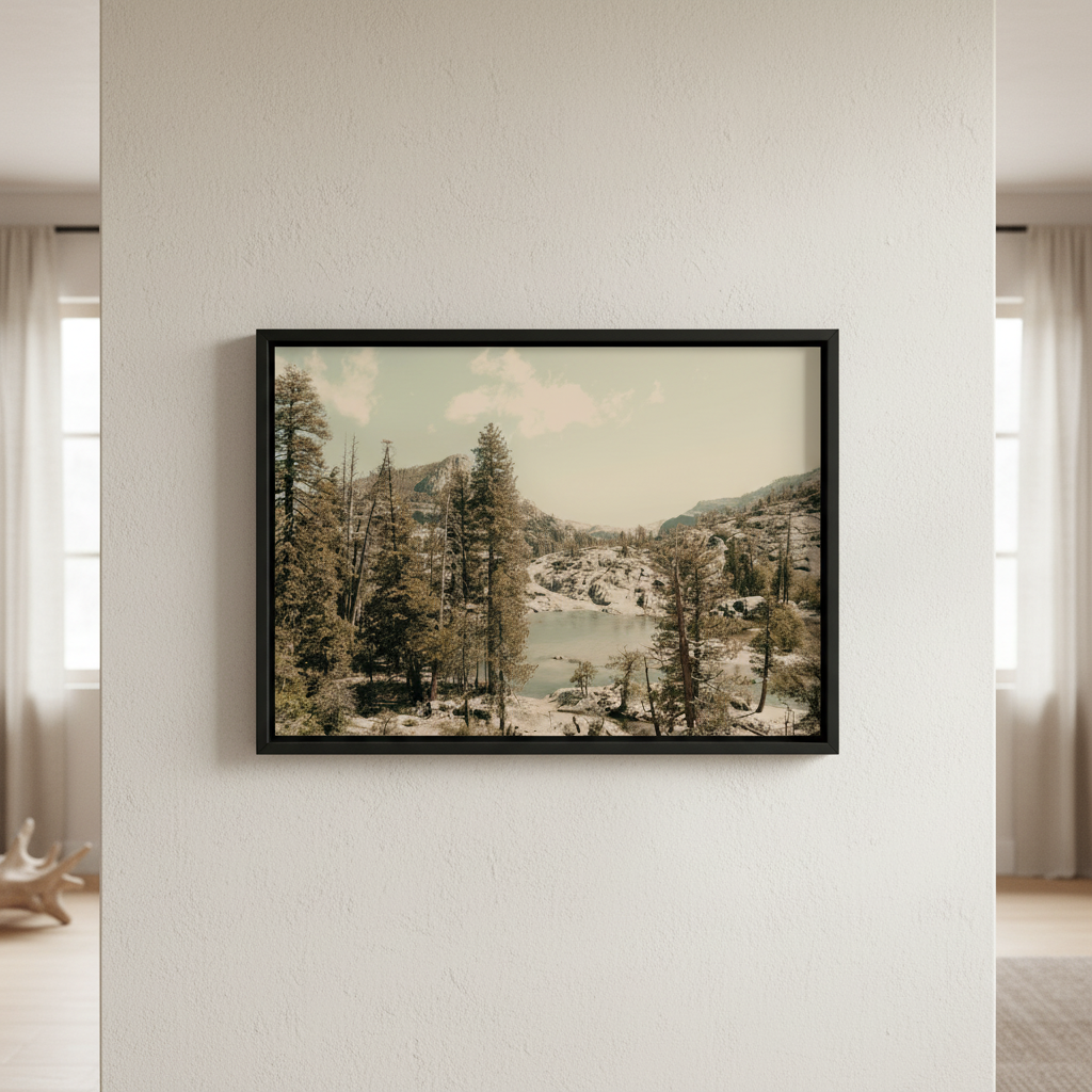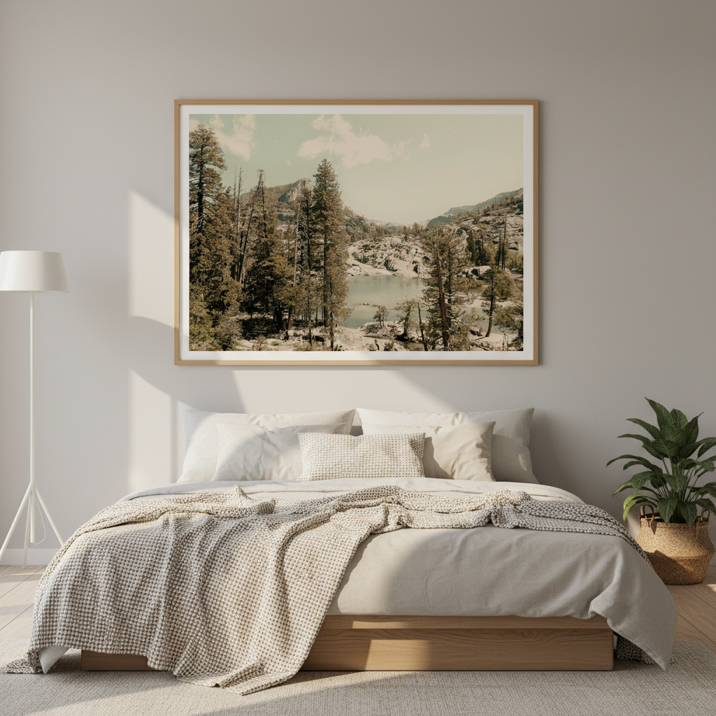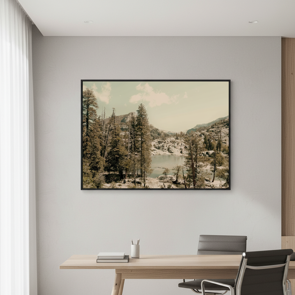 Escape to your own peaceful retreat with this stunning landscape artwork. "Alone in Solitude" captures a serene lake nestled between towering mountains and lush forest, inviting you to pause and breathe. Perfect for creating a calming focal point in any room, this piece by Hope Bainbridge brings nature's quiet beauty straight to your walls. Transform your space into a sanctuary where you can unwind and reconnect with the great outdoors—no hiking boots required!