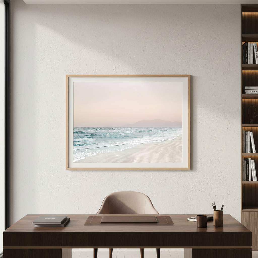 Escape to the shore with this dreamy coastal artwork featuring gentle ocean waves rolling beneath a soft, pastel-hued sky. Perfect for creating a serene seaside retreat in any room, this piece captures the peaceful magic of evenings by the beach. The soothing colour palette and tranquil composition bring a touch of coastal charm and relaxation to your walls, ideal for bedrooms, living spaces, or anywhere you want to drift away to your happy place.
