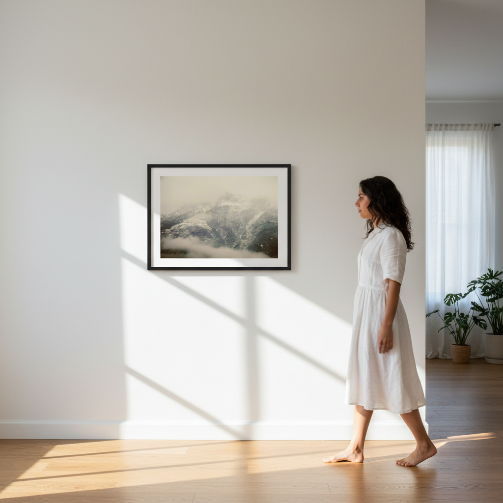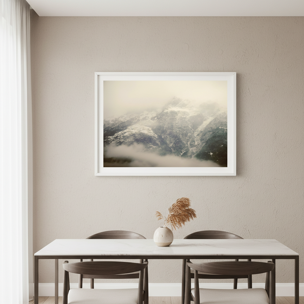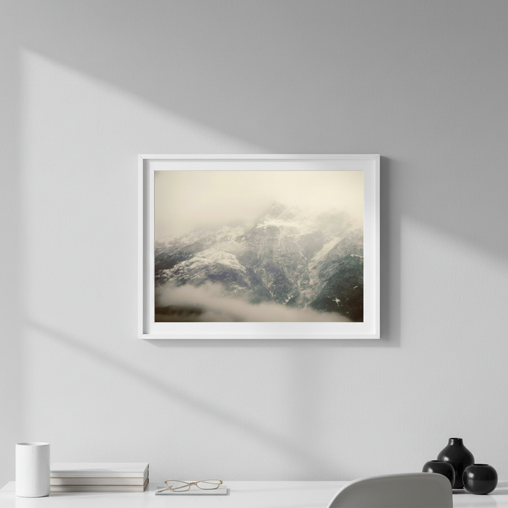Lose yourself in the moody magic of a snow-capped mountain range playing peek-a-boo with rolling fog. This stunning artwork captures that dreamy moment when nature decides to keep some secrets, shrouding majestic peaks in a veil of mist. Perfect for adding a touch of wanderlust and atmospheric intrigue to any room, "Mountain Mist" by Hope Bainbridge transforms your wall into a window to misty alpine landscapes. Whether you're a mountain lover or simply crave that cosy, contemplative vibe, this piece brings serene sophistication with a hint of mystery.