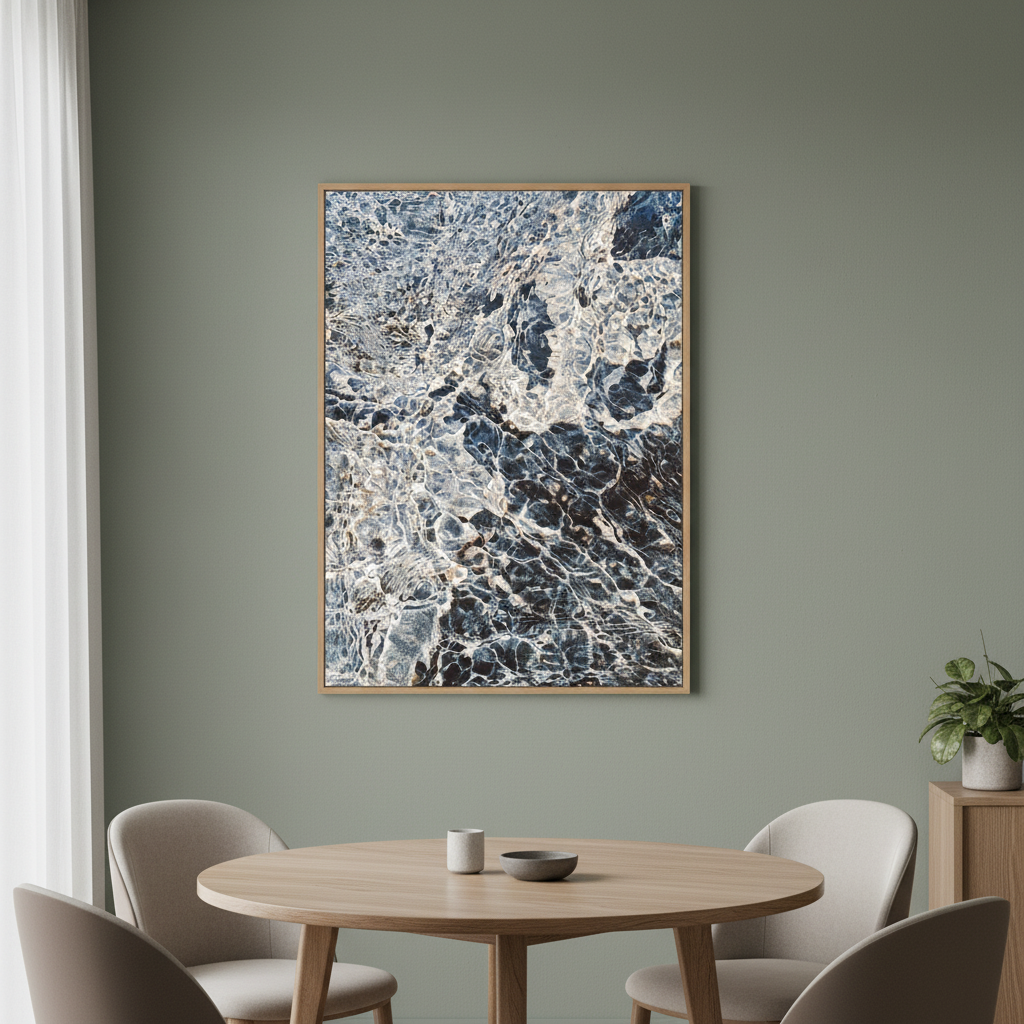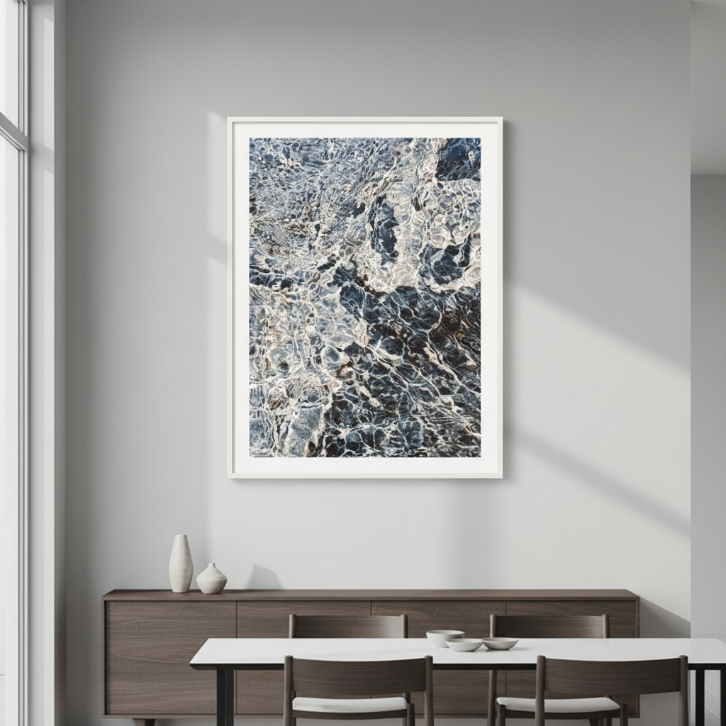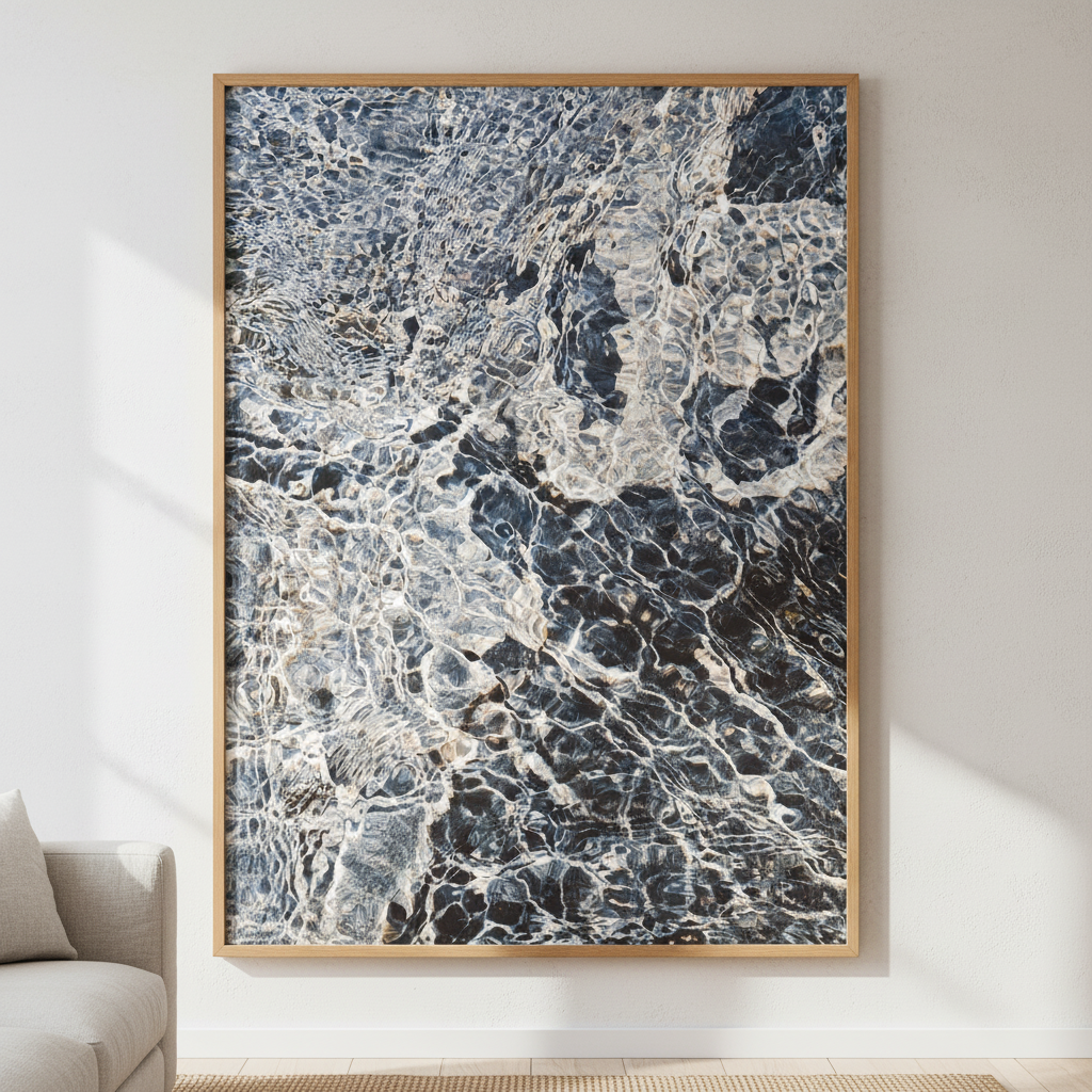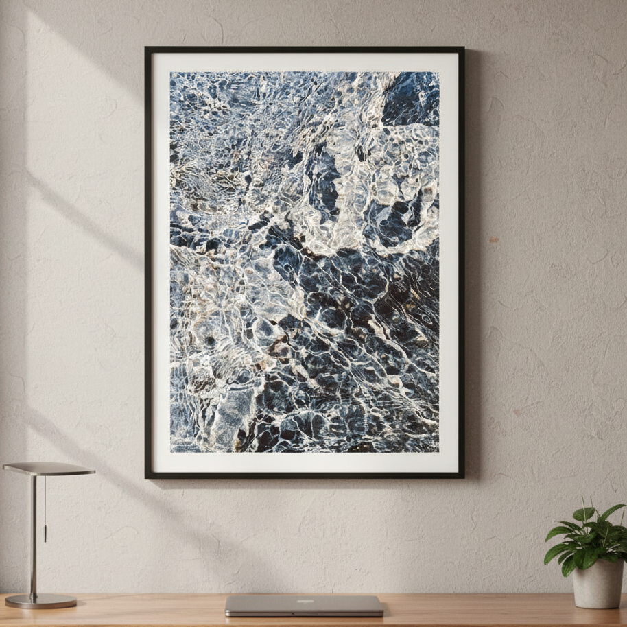 Ripples in Time captures the mesmerizing dance of light and shadow across weathered stone. This stunning artwork by Hope Bainbridge reveals nature's intricate handiwork—swirling patterns in charcoal and slate that seem to shift with every glance. Perfect for adding depth and visual intrigue to any room, this piece invites you to pause and discover something new each time you look. A conversation starter that brings timeless elegance with a touch of mystery to your walls.