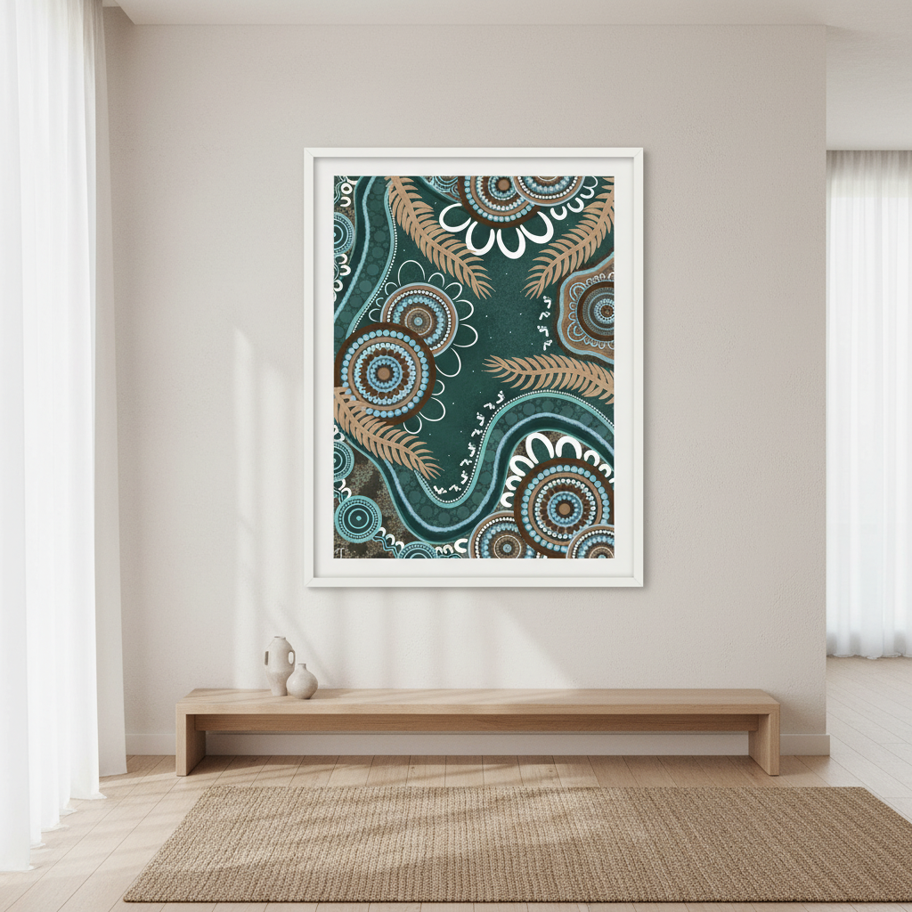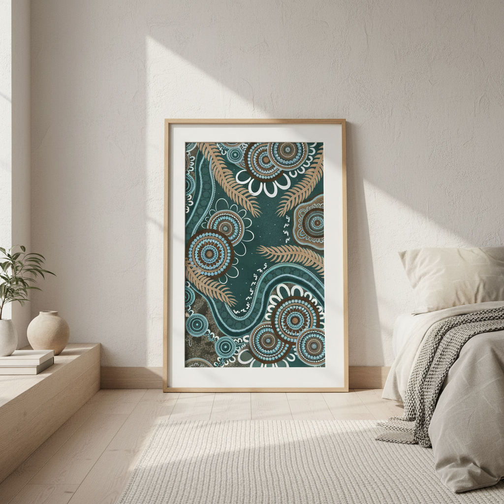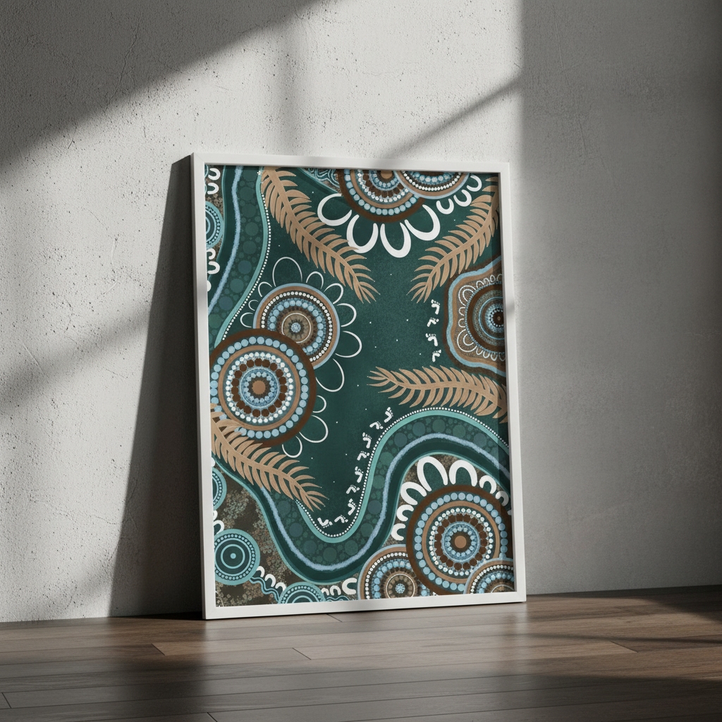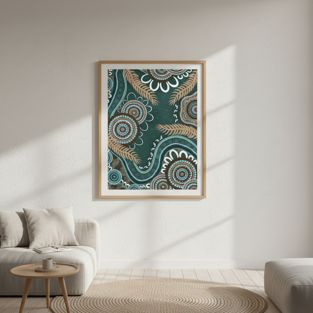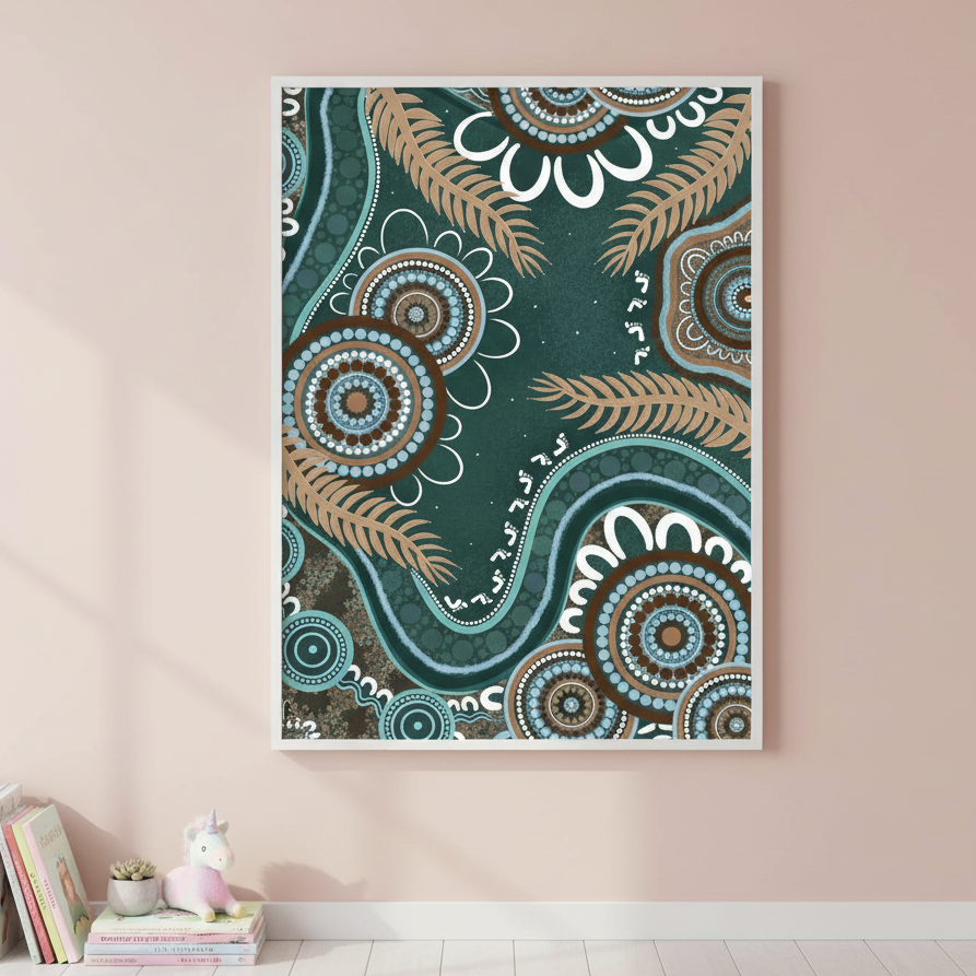 Bungil by Kirralee Costelloe showcases a sophisticated patterned fabric featuring organic circular motifs and delicate leaf-like elements set against a rich teal backdrop. This design seamlessly blends contemporary aesthetics with natural inspiration, making it an ideal choice for upholstery, cushions, or statement wall installations. The interplay of geometric and botanical forms creates visual depth while maintaining a refined, cohesive appearance. Perfect for those seeking to introduce colour and pattern with understated elegance.