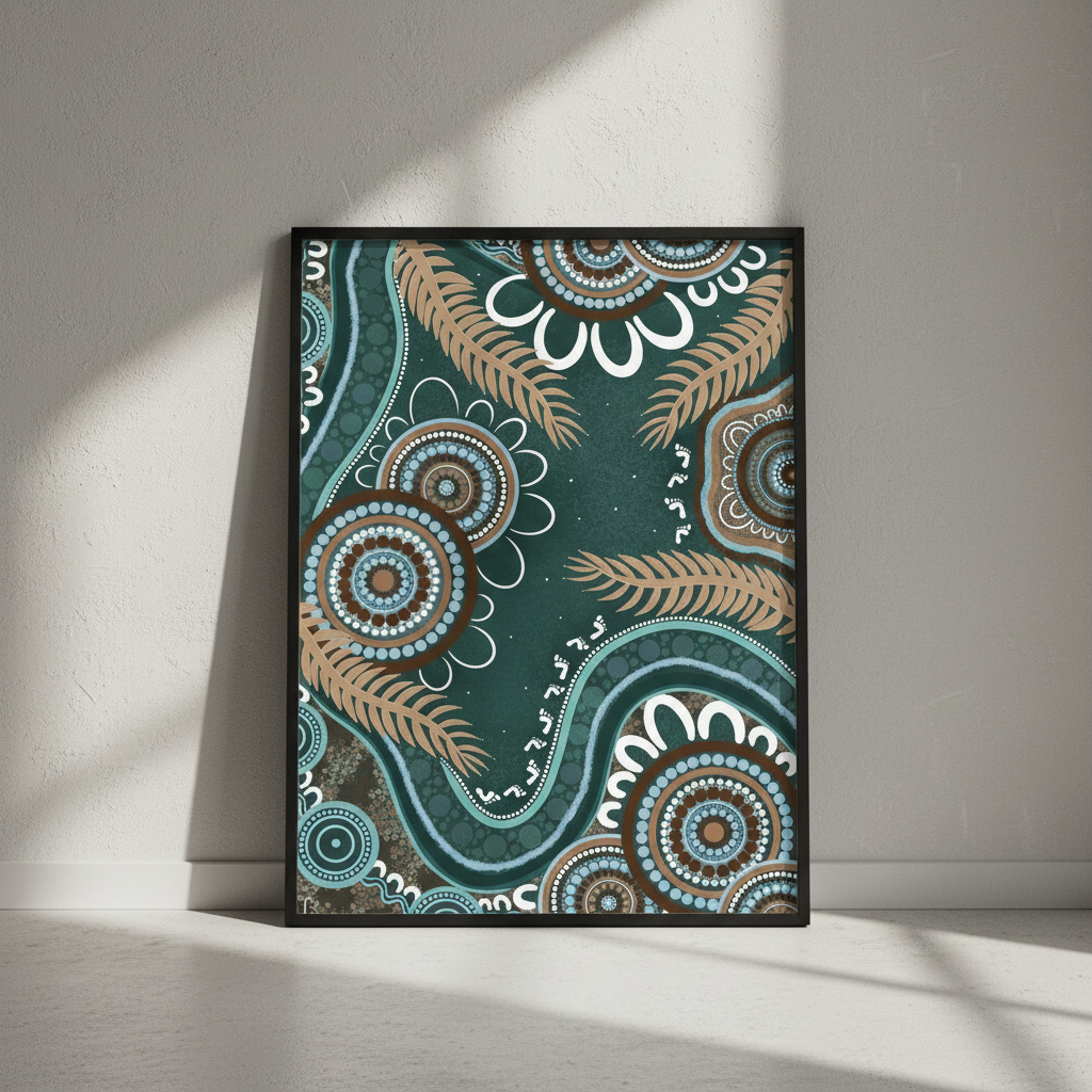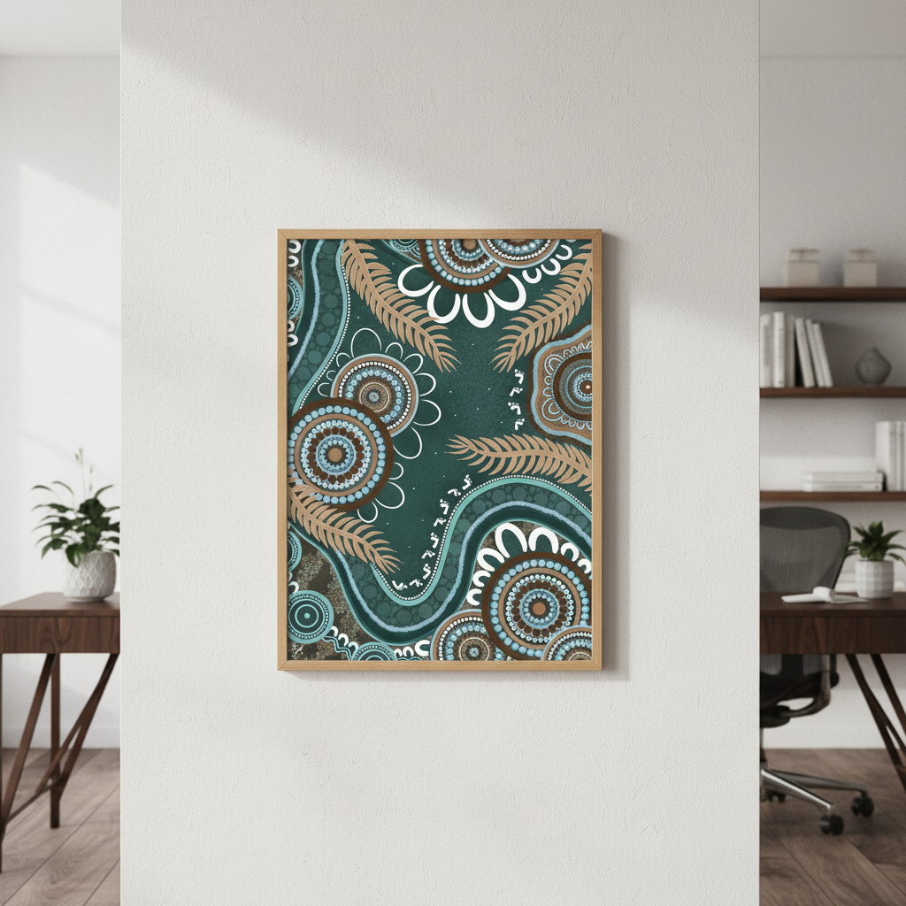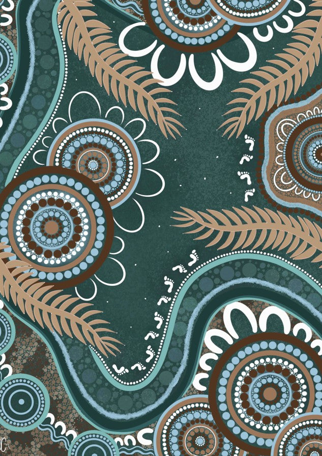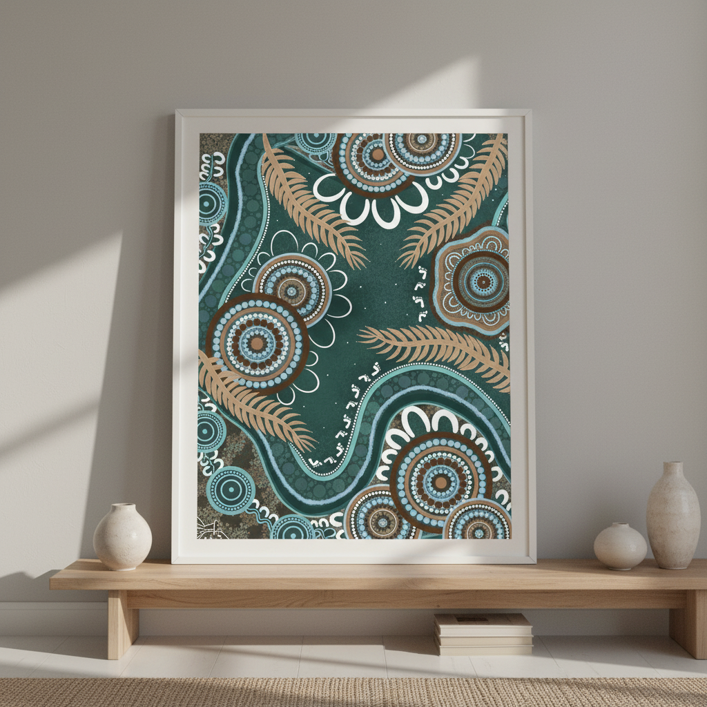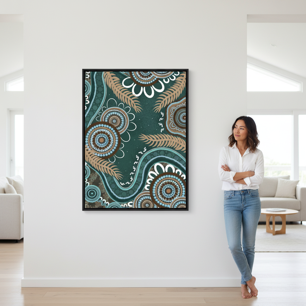 Bungil by Kirralee Costelloe showcases a sophisticated patterned fabric featuring organic circular motifs and delicate leaf-like elements set against a rich teal backdrop. This design seamlessly blends contemporary aesthetics with natural inspiration, making it an ideal choice for upholstery, cushions, or statement wall installations. The interplay of geometric and botanical forms creates visual depth while maintaining a refined, cohesive appearance. Perfect for those seeking to introduce colour and pattern with understated elegance.