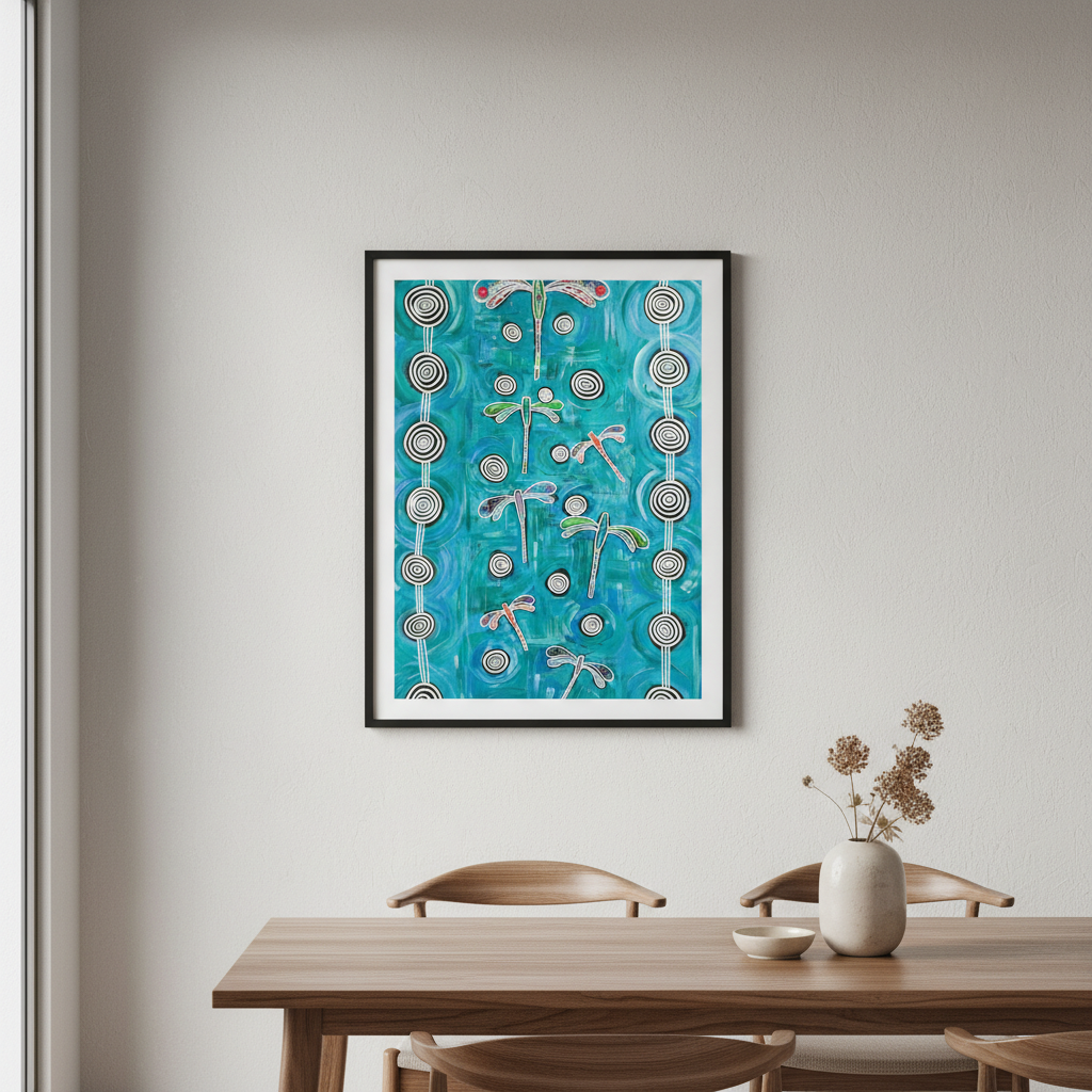 An artistic depiction of dragonflies on a blue background with circular patterns, this stunning print captures the delicate beauty of nature. Printed on high-quality 240gsm matte art paper, each piece showcases vibrant detail and colour depth.