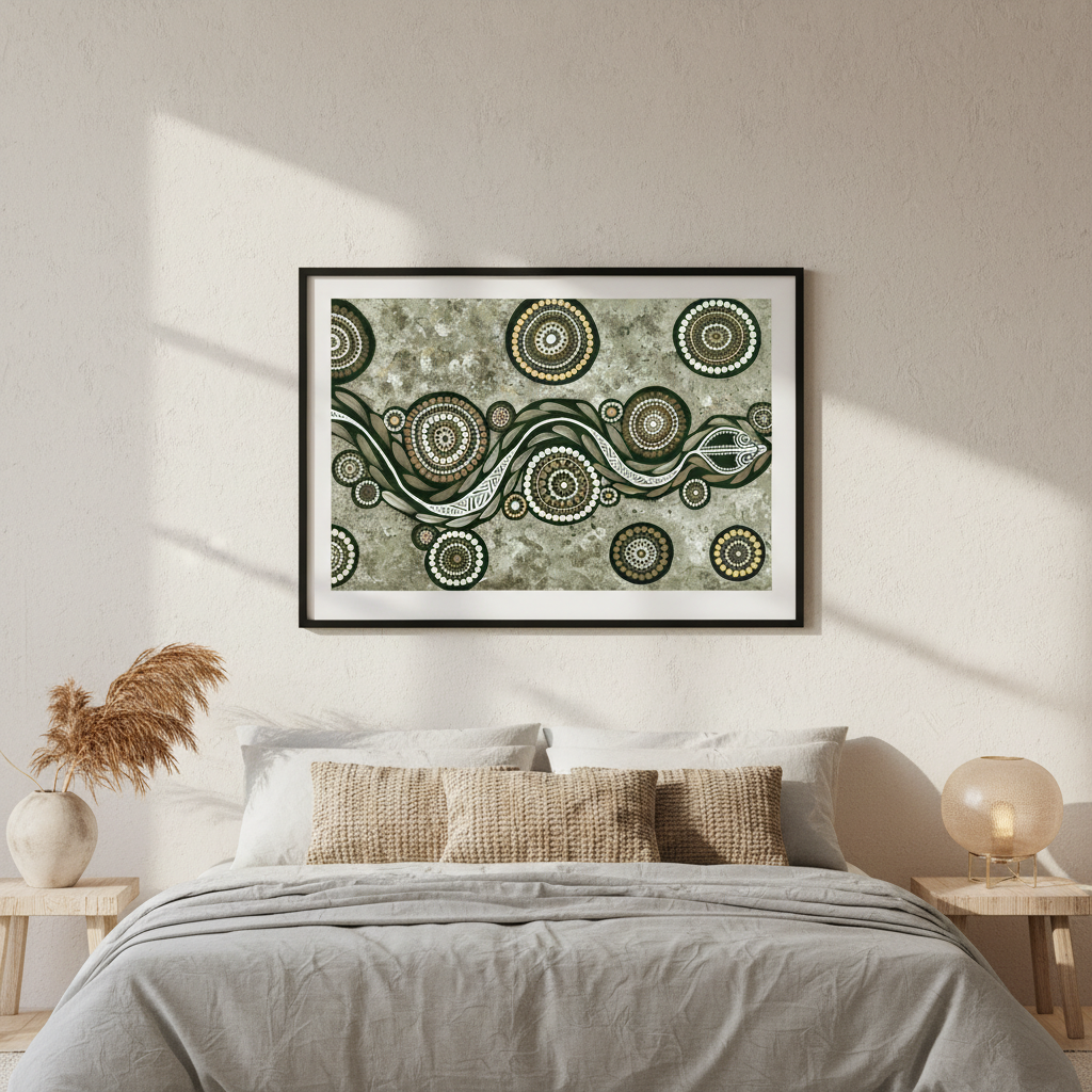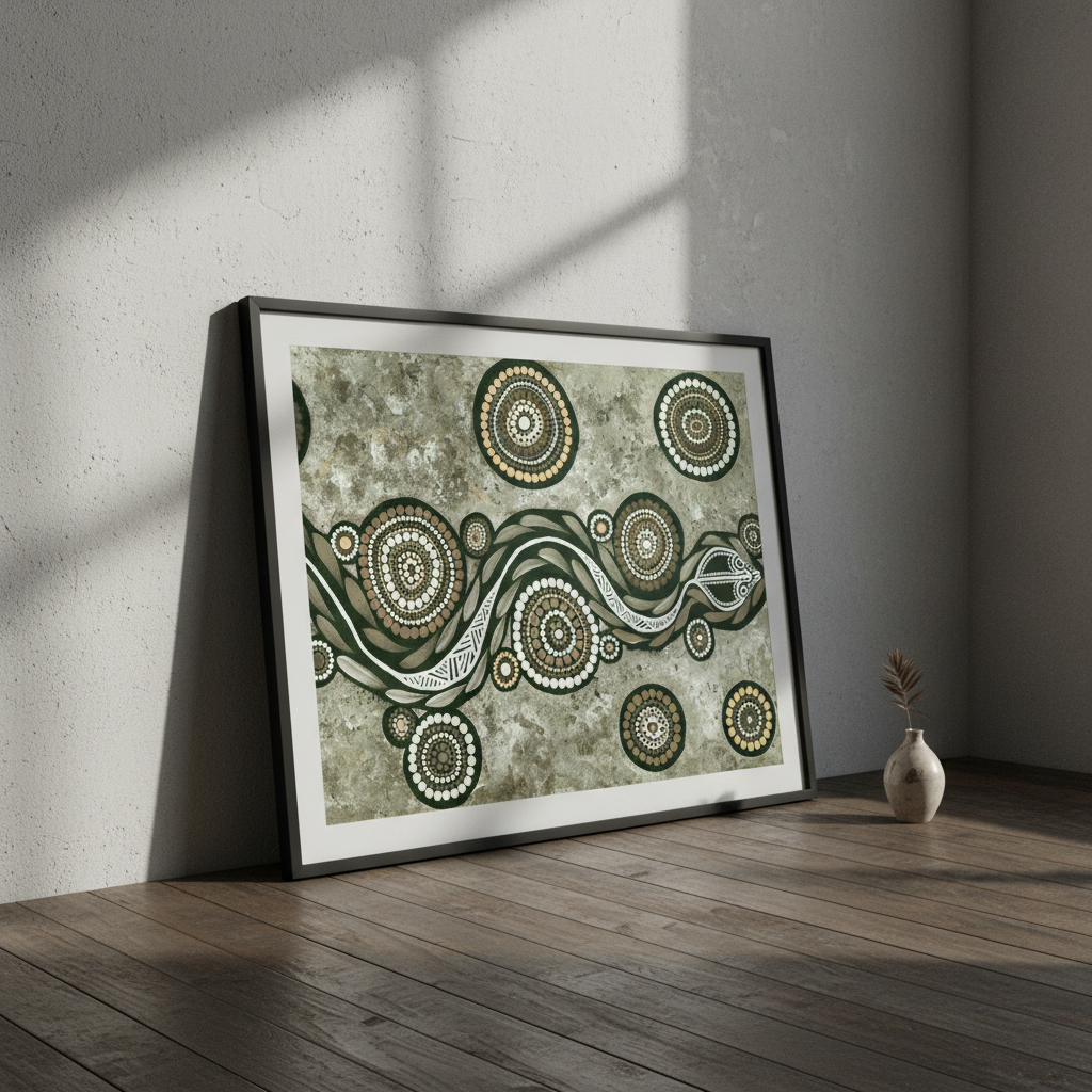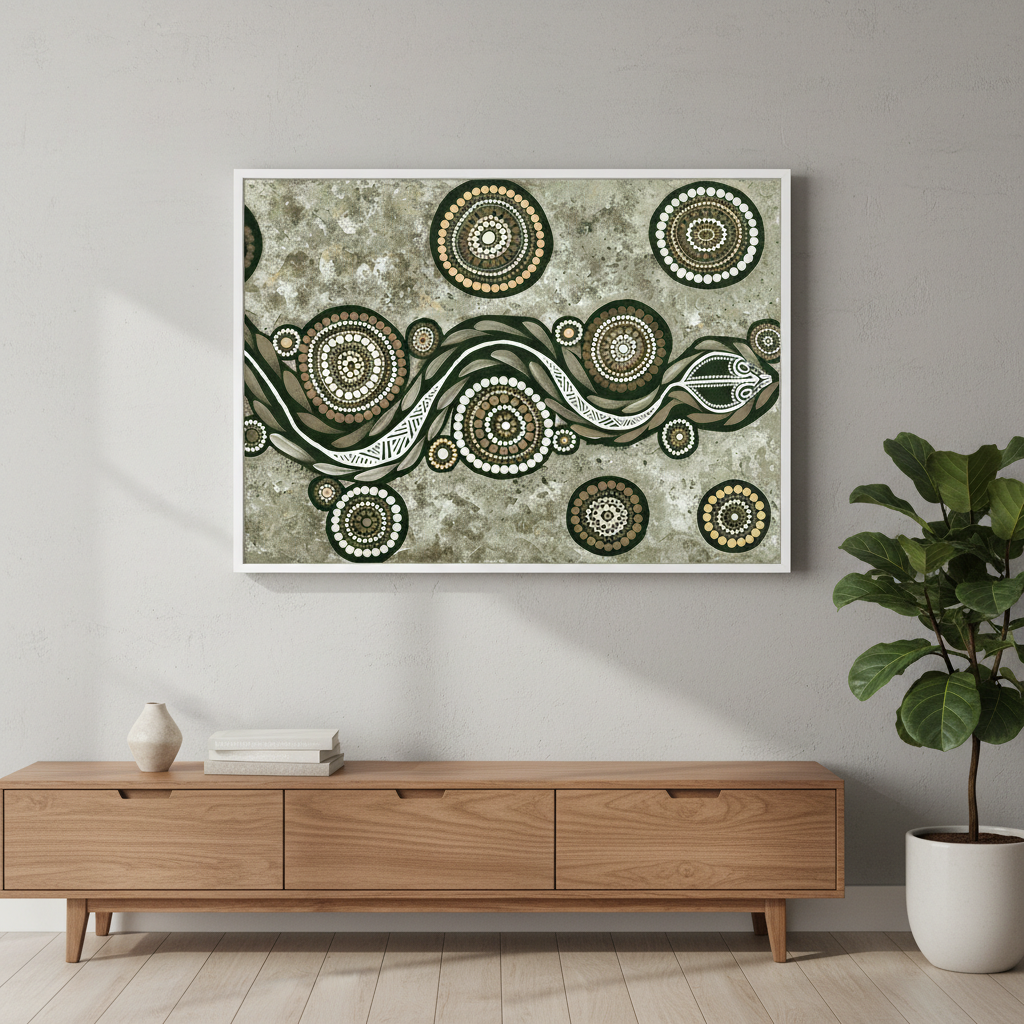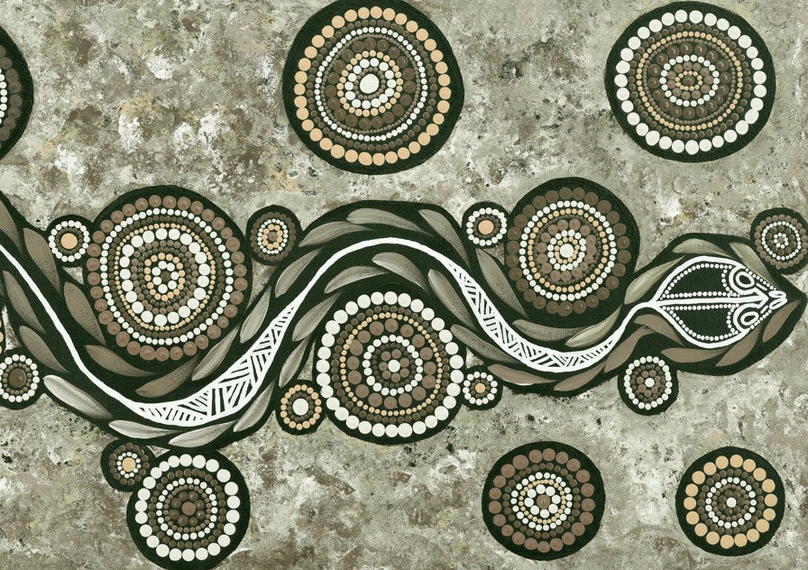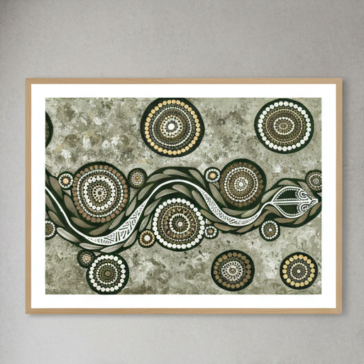 This striking artwork features an artistic depiction of a snake adorned with circular patterns set against a textured background, showcasing Emma Rigney's distinctive earth green tone palette. A captivating piece that brings natural elegance to any space.