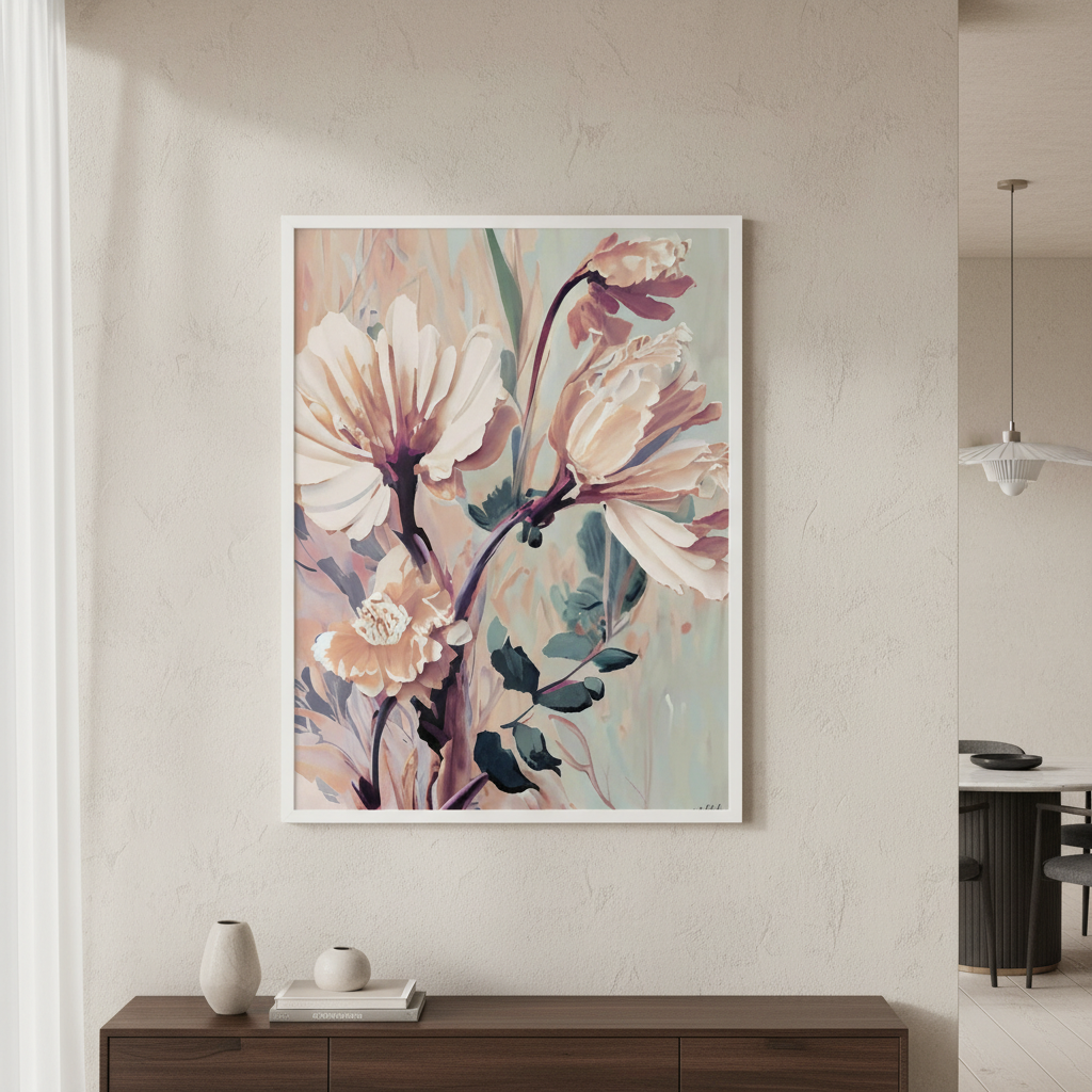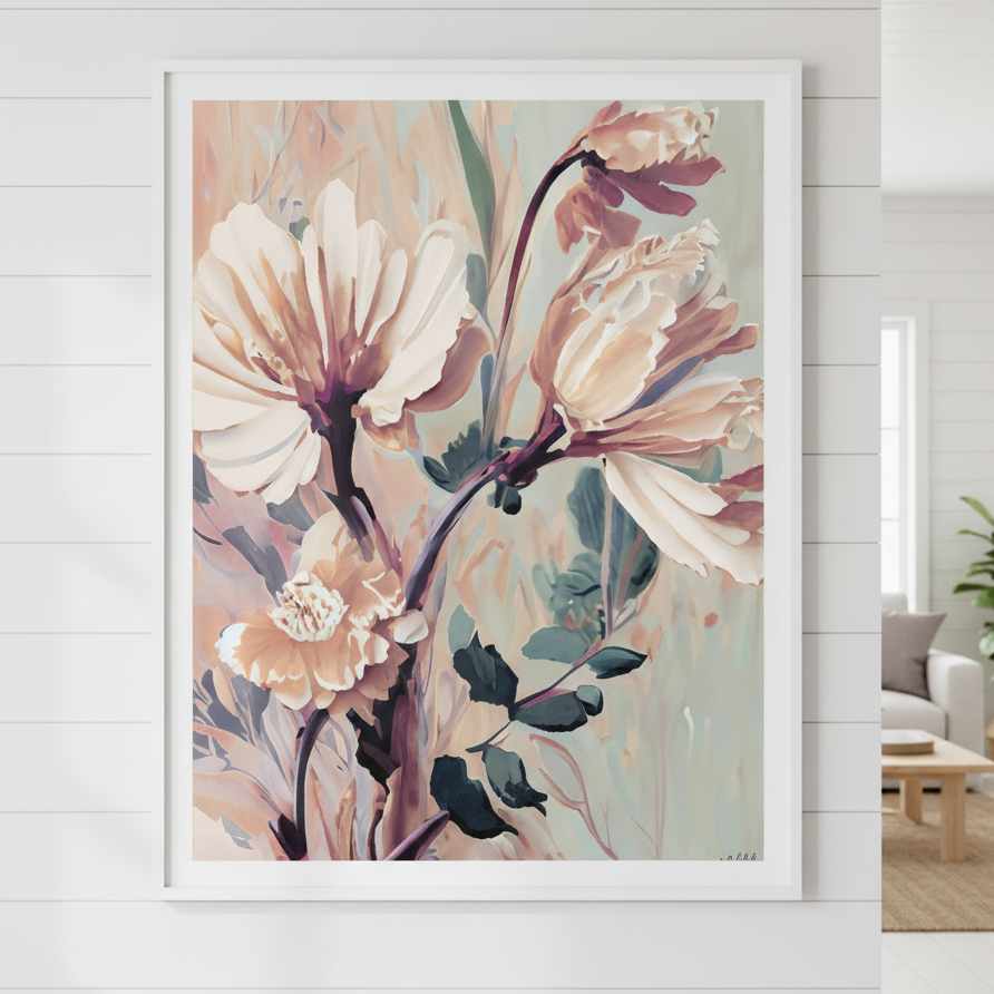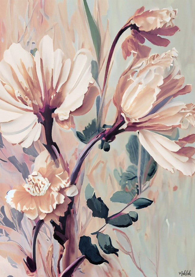 Florals by Inkheart Designs captures the delicate beauty of nature through thoughtfully composed botanical artwork. This piece features soft pink blooms complemented by verdant foliage, rendered against a serene light backdrop that enhances the composition's elegance. The artistic rendering balances botanical accuracy with aesthetic refinement, making it an ideal choice for spaces requiring sophisticated floral accents. Perfect for creating a calming focal point in contemporary or traditional interiors, this design brings organic warmth without overwhelming the visual landscape.
