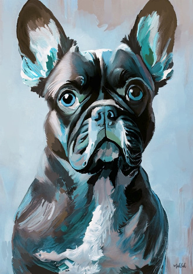 Frenchie by Inkheart Designs captures a vibrant French Bulldog rendered in bold, expressive brushstrokes against a dynamic, stylized backdrop. This contemporary artwork celebrates the breed's distinctive charm through a sophisticated colour palette that brings personality and movement to any space. Perfect for dog lovers and modern art enthusiasts, this piece combines artistic flair with genuine affection for its subject, making it an engaging focal point that sparks conversation and adds character to your interior.