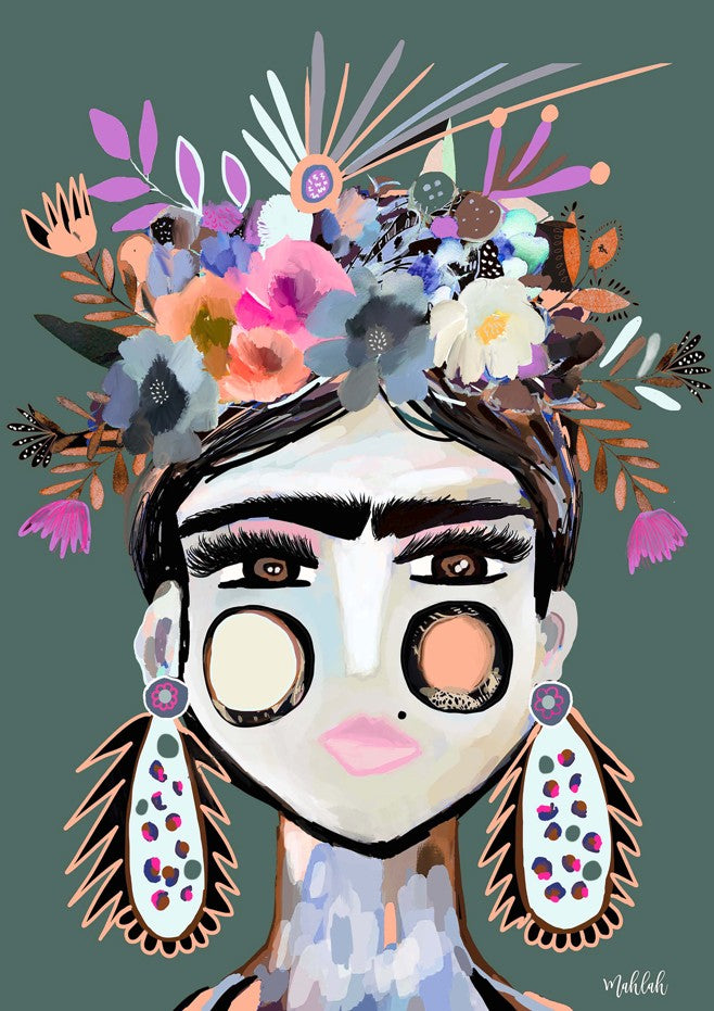 Funky Frida by Inkheart Designs captures bold artistic expression through an imaginative illustration merging portraiture with natural elements. The composition features a stylized face rendered against a dramatic dark backdrop, adorned with intricate floral motifs and delicate feathers that add dimension and movement. This piece celebrates contemporary art with a bohemian edge, blending surrealism with botanical imagery. Perfect for those seeking statement wall art that sparks conversation and reflects a sophisticated appreciation for unconventional design. An ideal choice for creative spaces, galleries, or anywhere demanding visual impact and artistic authenticity.