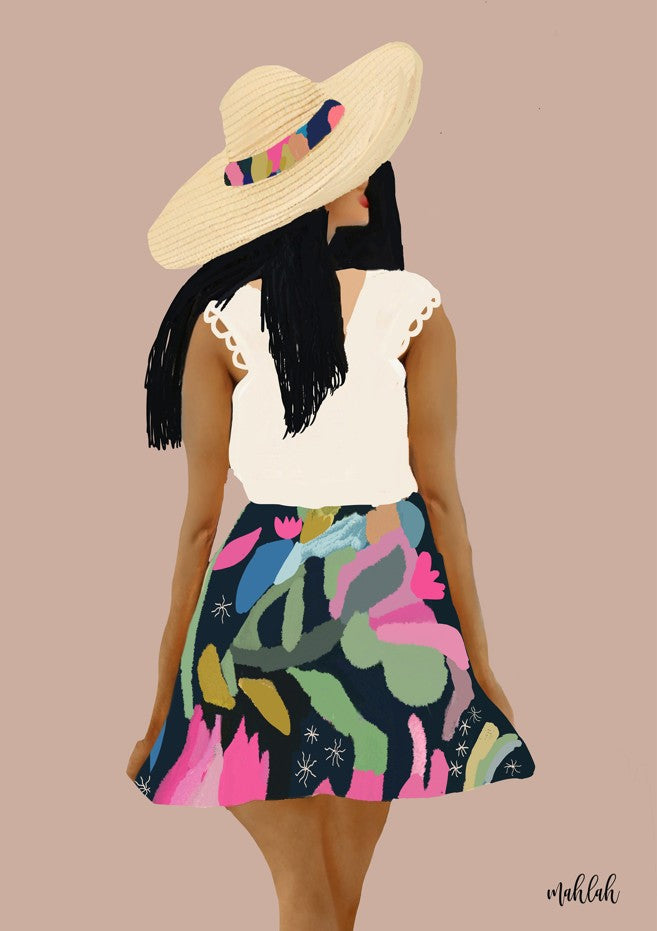 Girl in a Skirt by Inkheart Designs captures a vibrant moment of effortless style. This illustration features a woman in a crisp white top paired with a striking multicoloured skirt, anchored by a classic straw hat against a serene beige backdrop. The composition balances bold pattern work with neutral tones, creating visual interest without overwhelming the eye. Perfect for adding contemporary flair to any space, this piece celebrates fashion-forward thinking and artistic expression. An ideal choice for those seeking wall art that combines sophistication with playful colour.