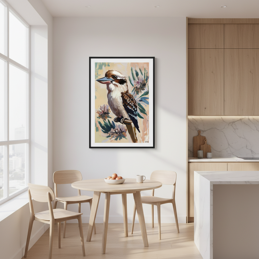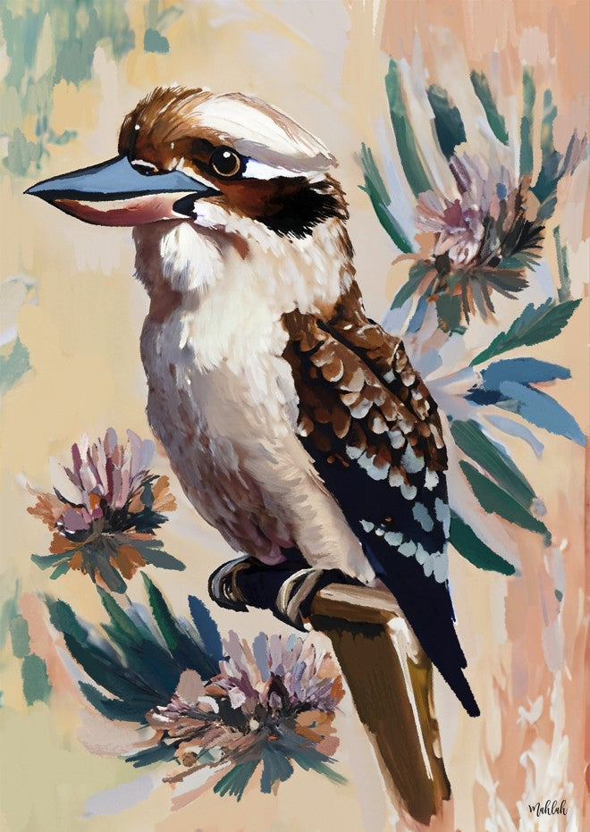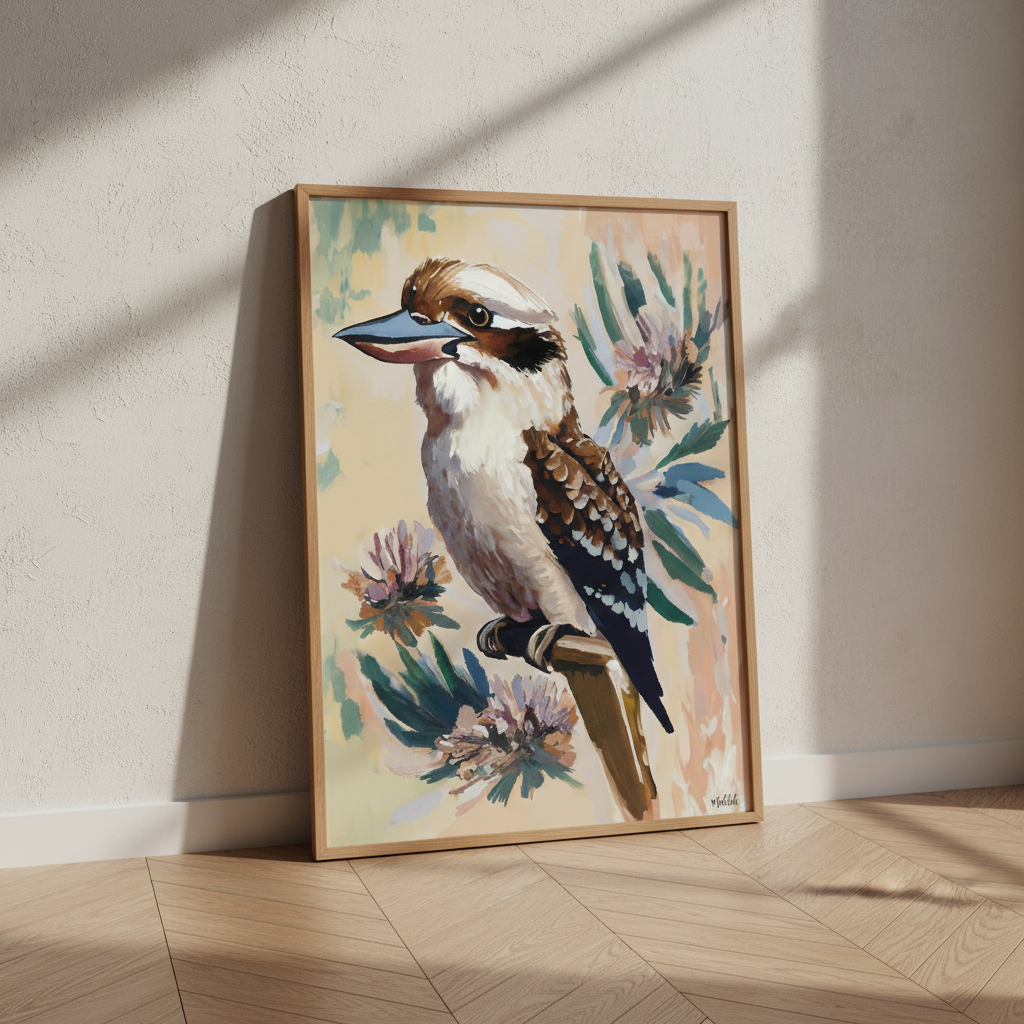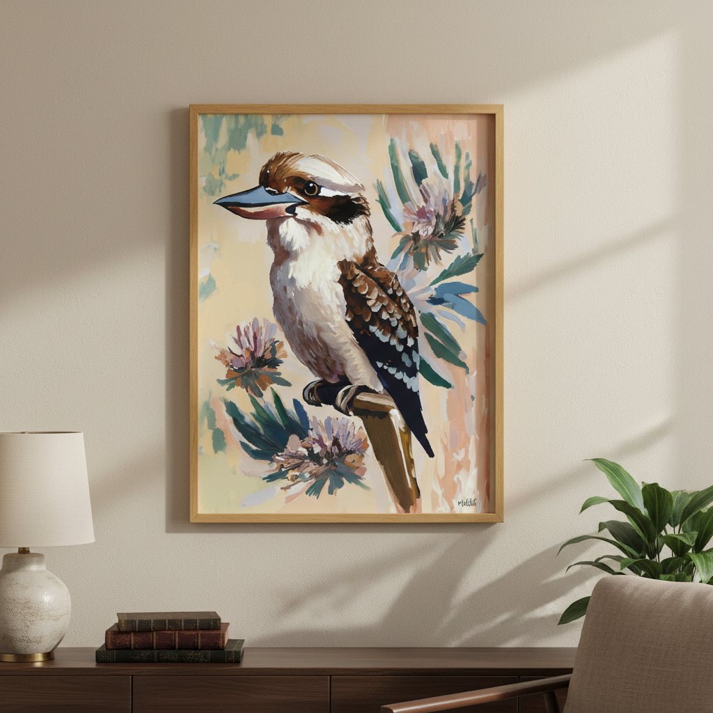 Kook by Inkheart Designs captures the distinctive character of Australia's iconic kookaburra in a striking artistic composition. This painting features the bird rendered with meticulous detail, set against a lush floral backdrop that adds depth and visual interest. The interplay between the kookaburra's natural markings and the surrounding botanical elements creates a balanced, sophisticated piece. Perfect for those seeking to bring native Australian wildlife and natural beauty into their interior spaces, this artwork celebrates the country's unique fauna with artistic flair and professional execution.