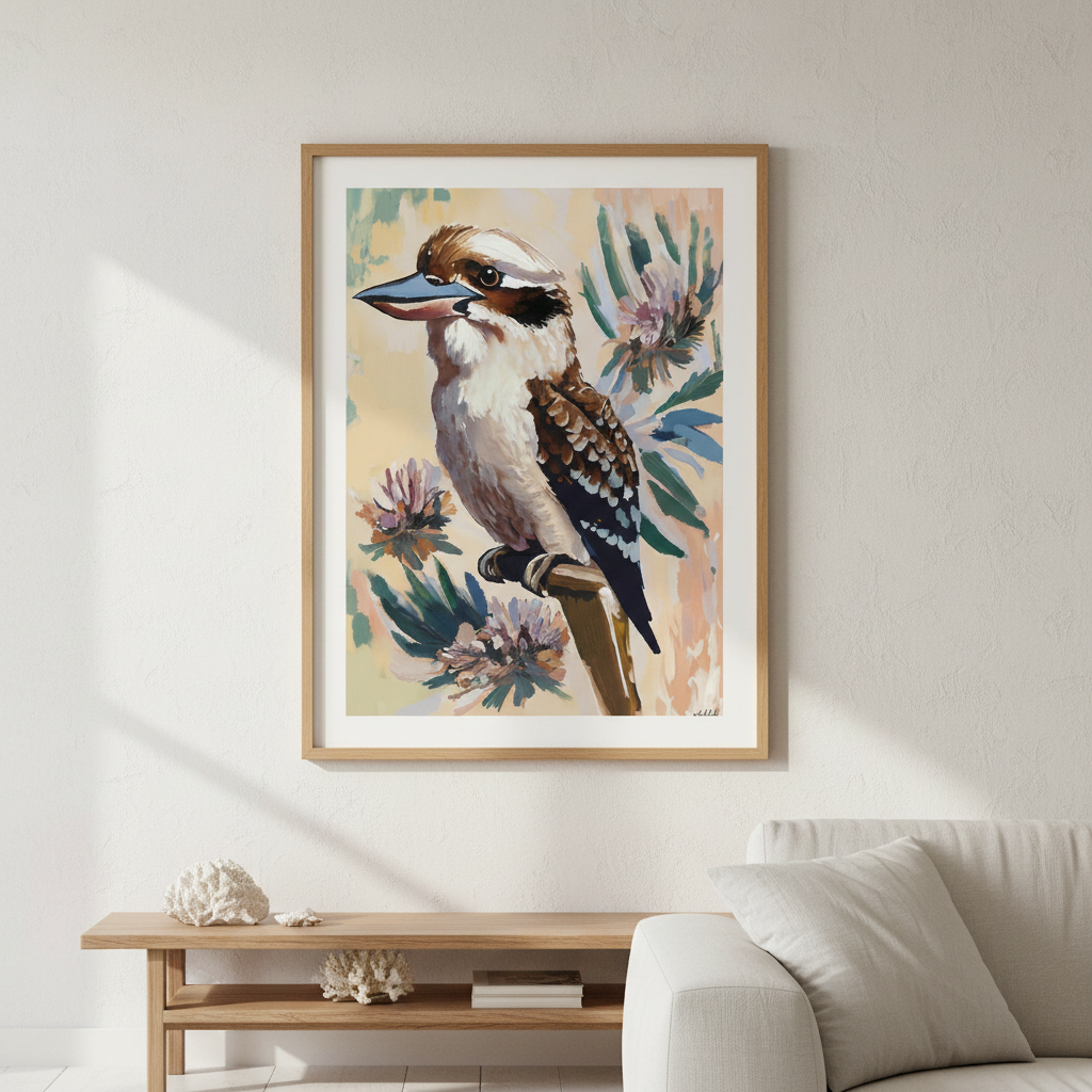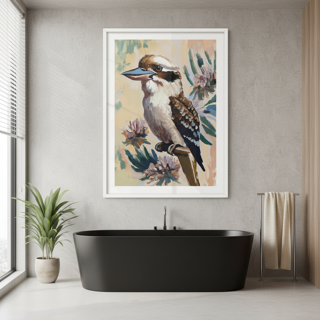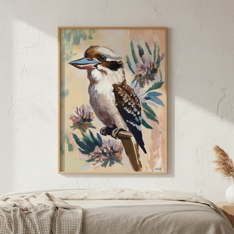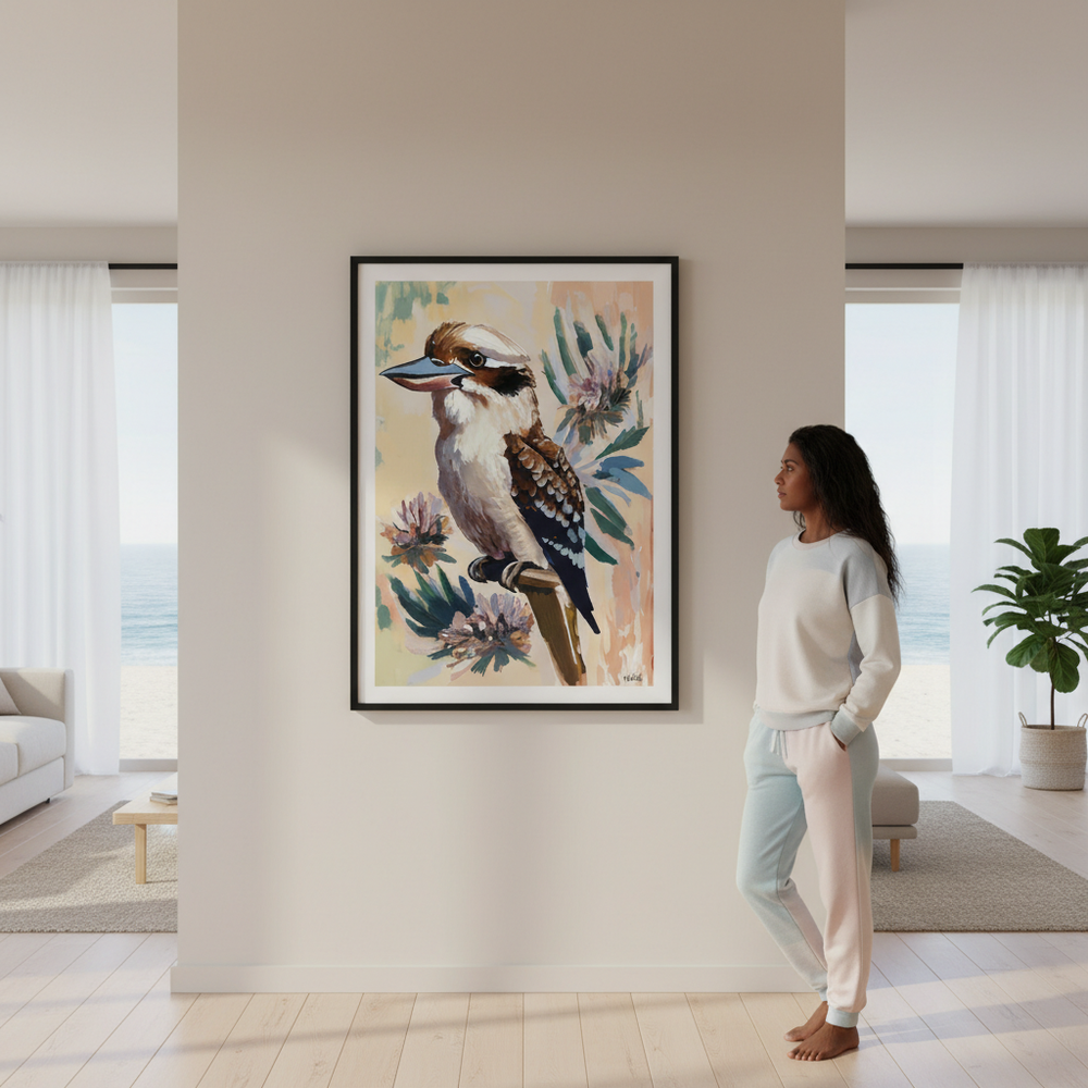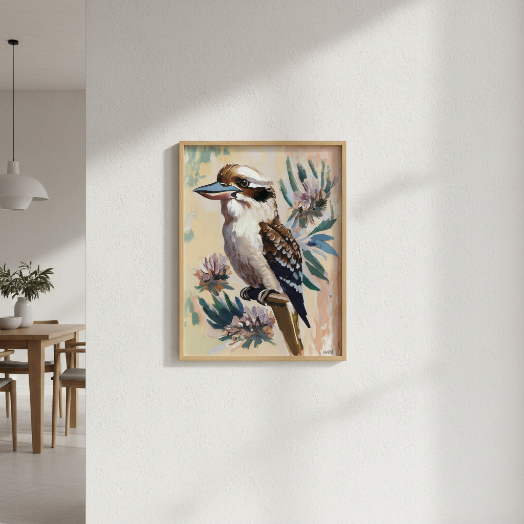 Kook by Inkheart Designs captures the distinctive character of Australia's iconic kookaburra in a striking artistic composition. This painting features the bird rendered with meticulous detail, set against a lush floral backdrop that adds depth and visual interest. The interplay between the kookaburra's natural markings and the surrounding botanical elements creates a balanced, sophisticated piece. Perfect for those seeking to bring native Australian wildlife and natural beauty into their interior spaces, this artwork celebrates the country's unique fauna with artistic flair and professional execution.