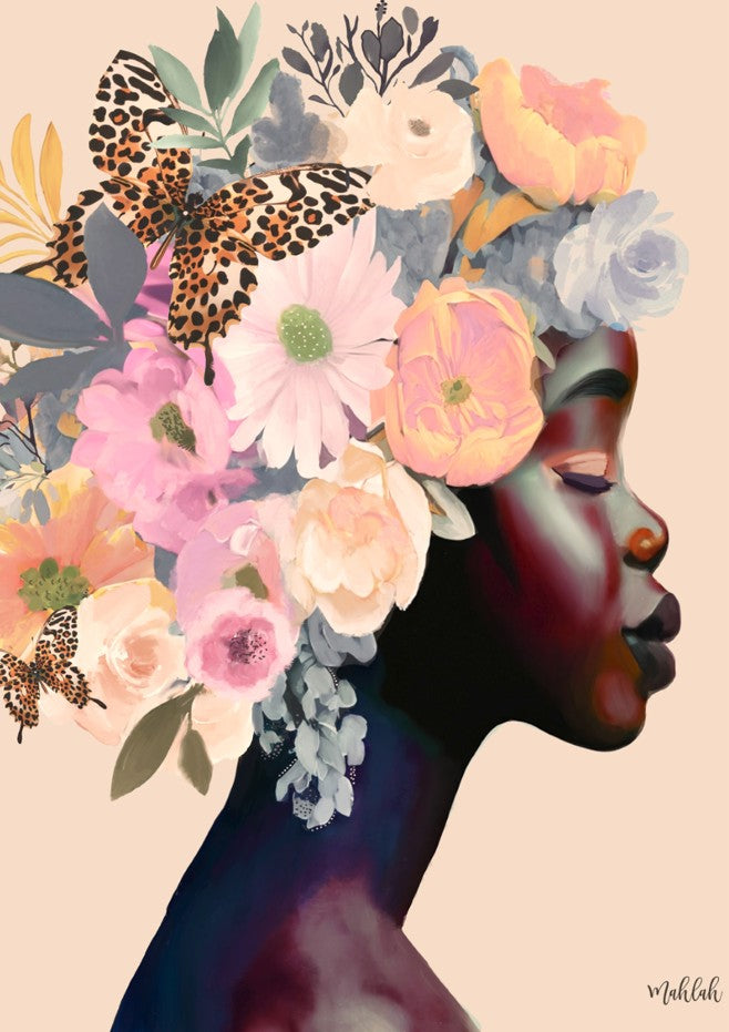 Lady B by Inkheart Designs captures an elegant artistic vision with its sophisticated profile illustration. This piece features a woman's silhouette adorned with delicate florals and graceful butterflies, rendered in soft, muted tones against a warm beige canvas. The composition balances botanical elements with portraiture, creating a contemplative and refined aesthetic. Perfect for adding a touch of artistic sophistication to any interior space, this design celebrates femininity through nature-inspired imagery. An ideal choice for those seeking meaningful wall art that combines classical elegance with contemporary artistic sensibility.