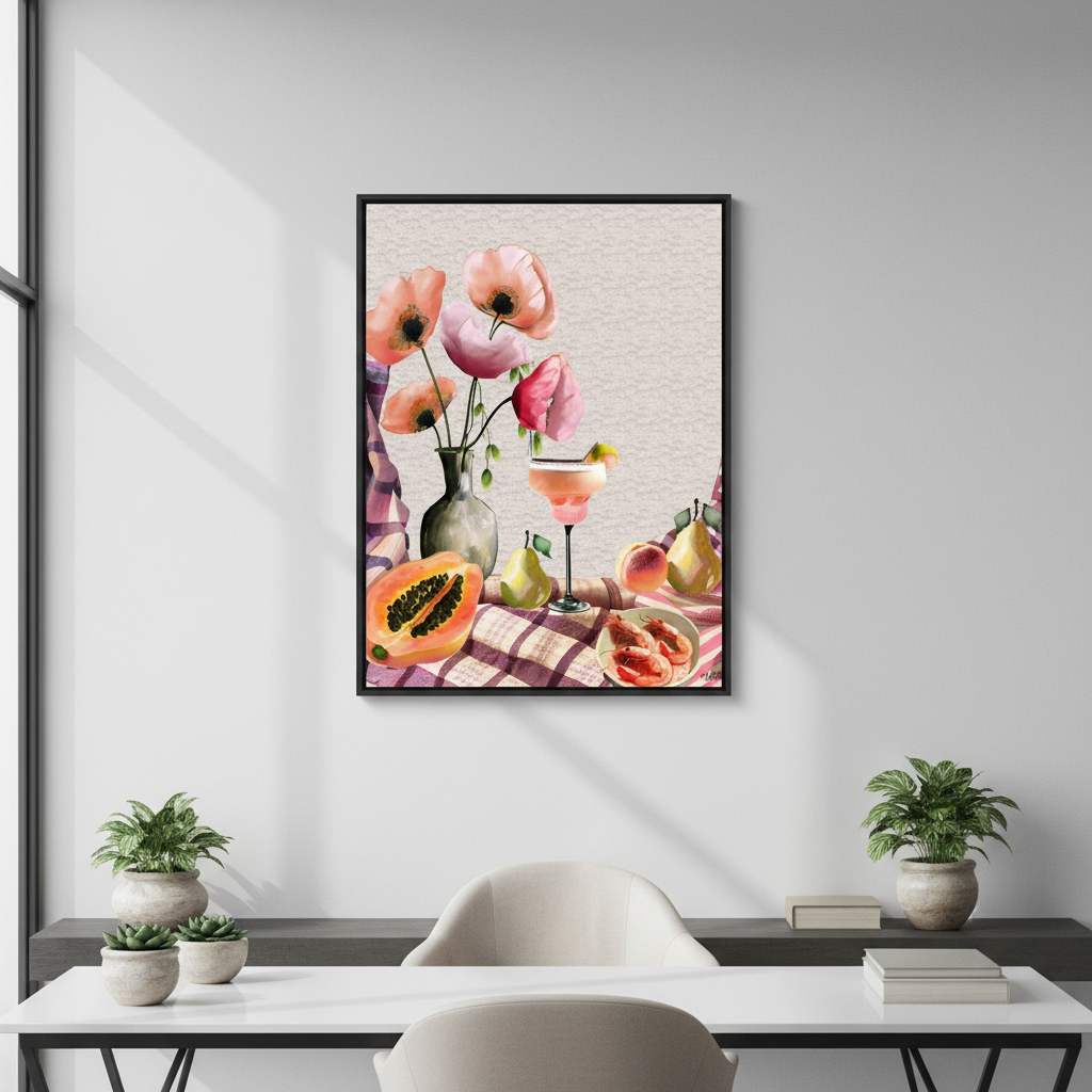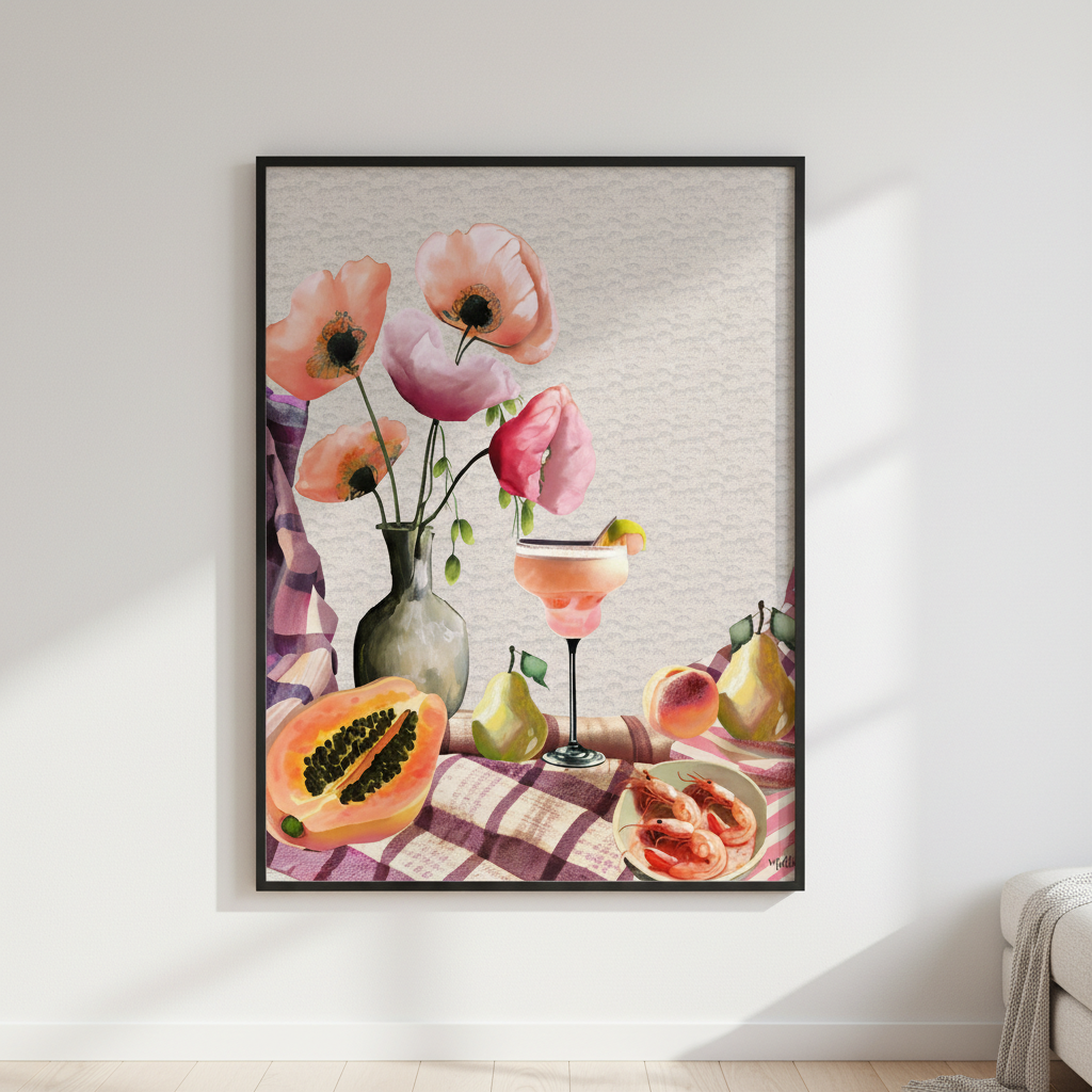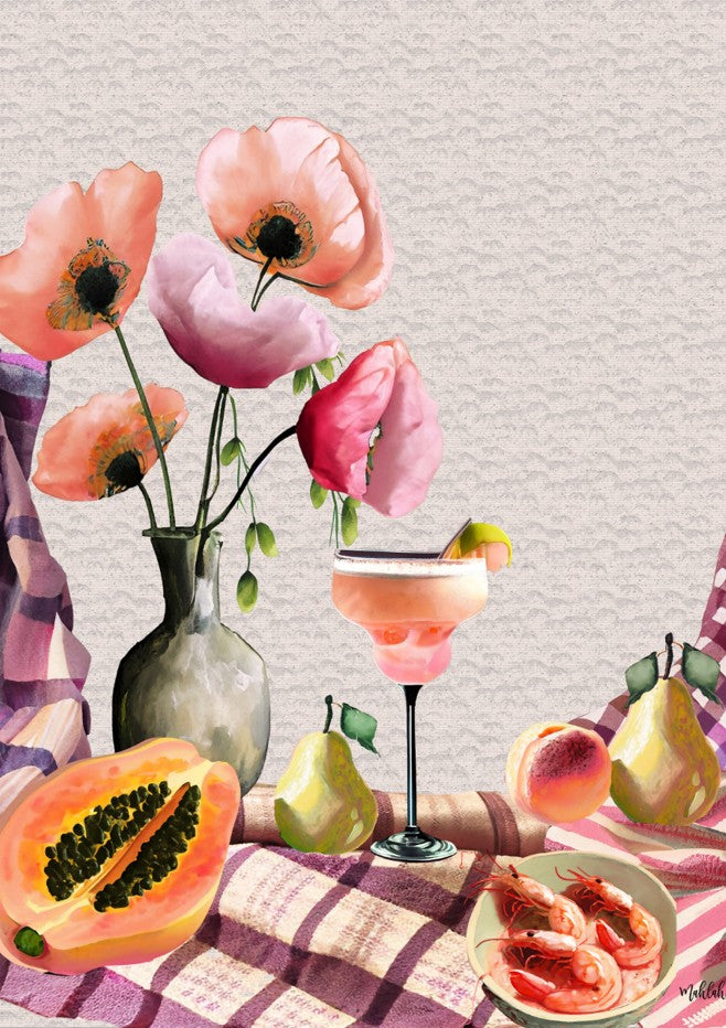 Elevate your table presentation with this sophisticated luncheon design by Inkheart Designs. Featuring an expertly composed scene of fresh flowers, seasonal fruit, and a perfectly crafted cocktail arranged on a classic checkered tablecloth, this piece captures the essence of refined entertaining. The balanced composition and attention to detail make it an ideal choice for those seeking to add a touch of culinary elegance to their dining space or kitchen décor. A timeless addition that celebrates the art of thoughtful hospitality.