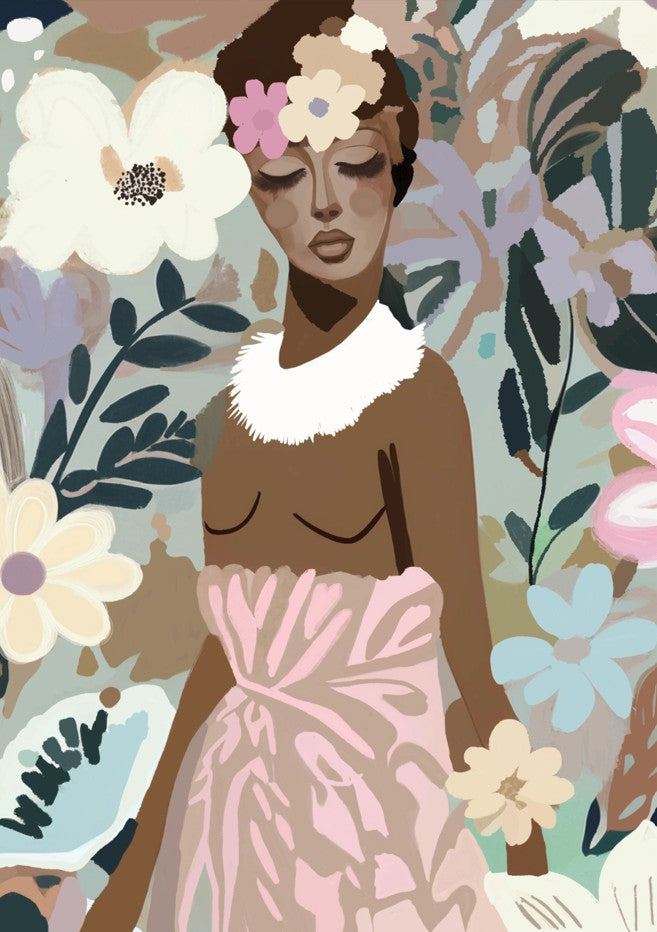 Madrid by Inkheart Designs captures an elegant portrait of a woman set against a lush botanical backdrop. Delicate flowers and verdant foliage frame the subject, creating a sophisticated interplay between figure and nature. This illustration merges portraiture with floral elements, delivering a refined aesthetic that complements contemporary and eclectic interiors. The composition balances intricate detail with artistic restraint, making it an ideal choice for those seeking wall art that combines figurative elegance with organic beauty.