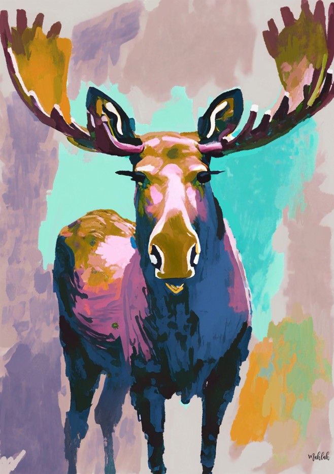 Moose by Inkheart Designs captures wildlife artistry through vibrant colour and contemporary abstraction. This striking piece features a detailed moose rendered in rich, dynamic hues set against an imaginative abstract backdrop. The composition balances naturalistic subject matter with modern artistic expression, creating visual interest that complements both traditional and contemporary interiors. Ideal for art enthusiasts seeking statement wall décor that combines animal imagery with bold, expressive design elements.