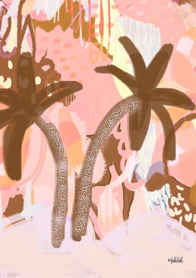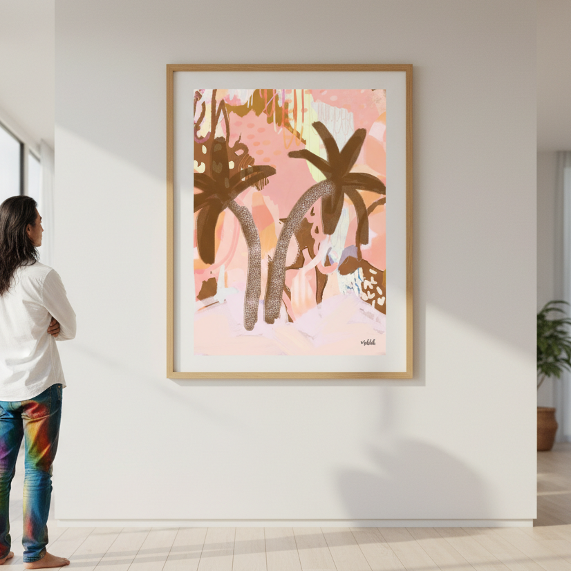 Myriad Palms captures the essence of tropical elegance through a sophisticated blend of botanical illustration and contemporary abstract art. This striking piece features intricately rendered palm trees set against a vibrant, layered background that shifts between warm and cool tones, creating visual depth and movement. Inkheart Designs masterfully balances naturalistic detail with artistic expression, making this work ideal for modern interiors seeking character and conversation. Perfect for living spaces, creative studios, or anywhere you want to introduce warmth and artistic sophistication to your walls.