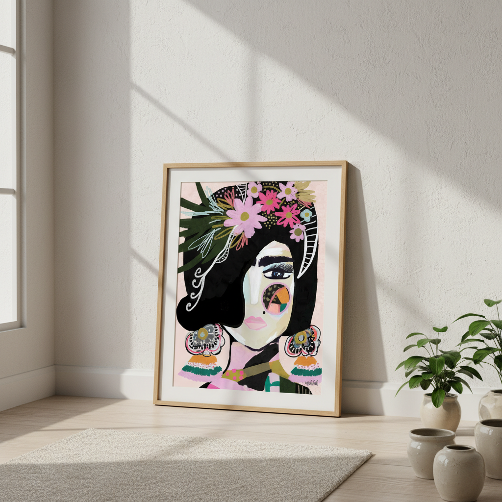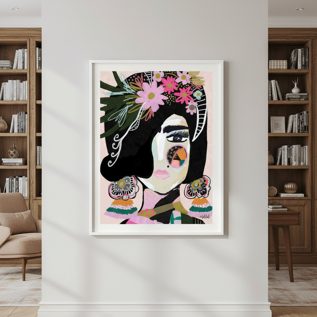 Offbeat Frida by Inkheart Designs celebrates artistic expression through a vibrant illustration merging portraiture with botanical and abstract elements. Set against a striking pink backdrop, this piece features a woman's face rendered in bold, unconventional strokes alongside delicate florals and geometric shapes. The composition balances figurative and decorative elements, creating visual intrigue that appeals to those who appreciate contemporary art with personality. Perfect for spaces seeking statement-making wall décor that combines cultural inspiration with modern artistic sensibility.