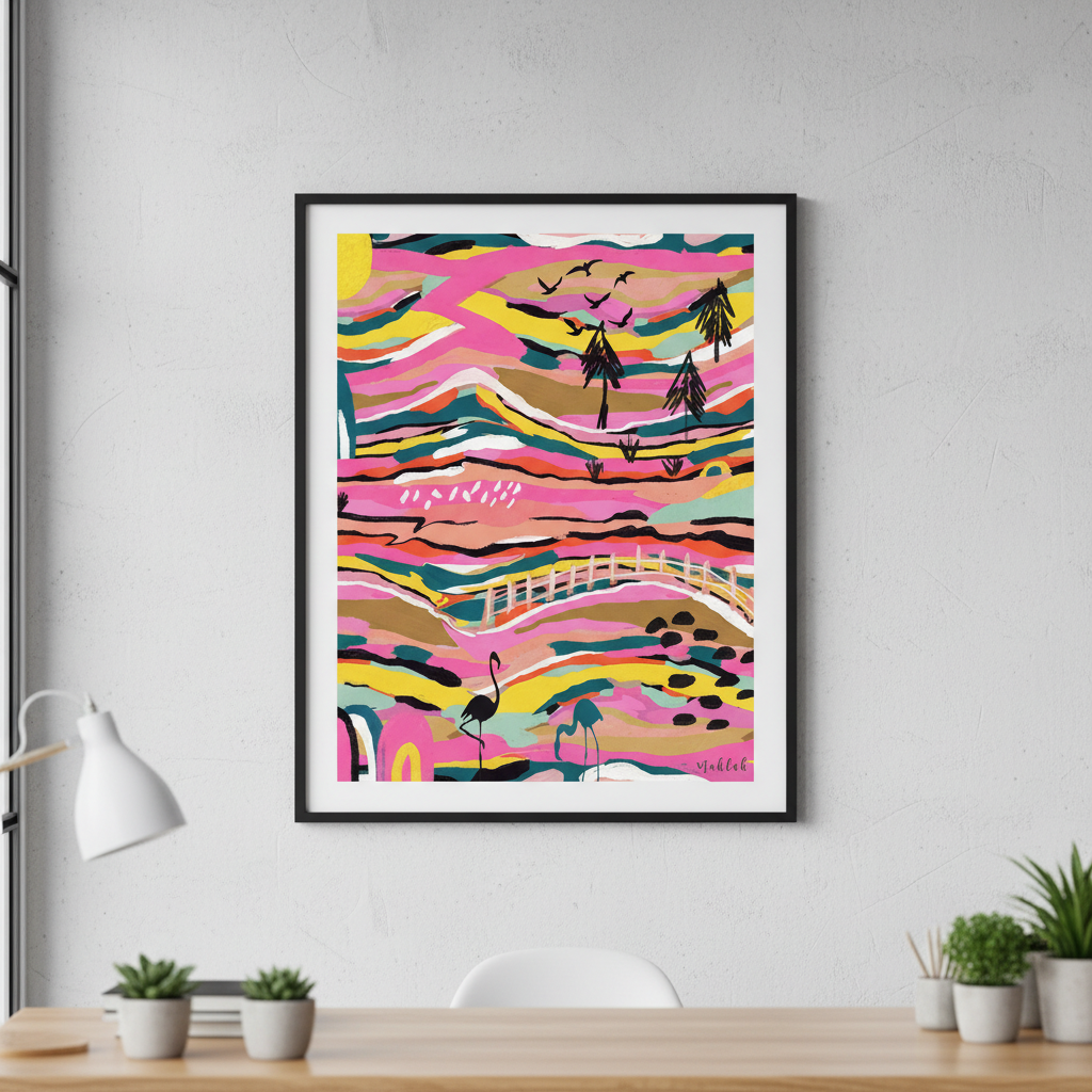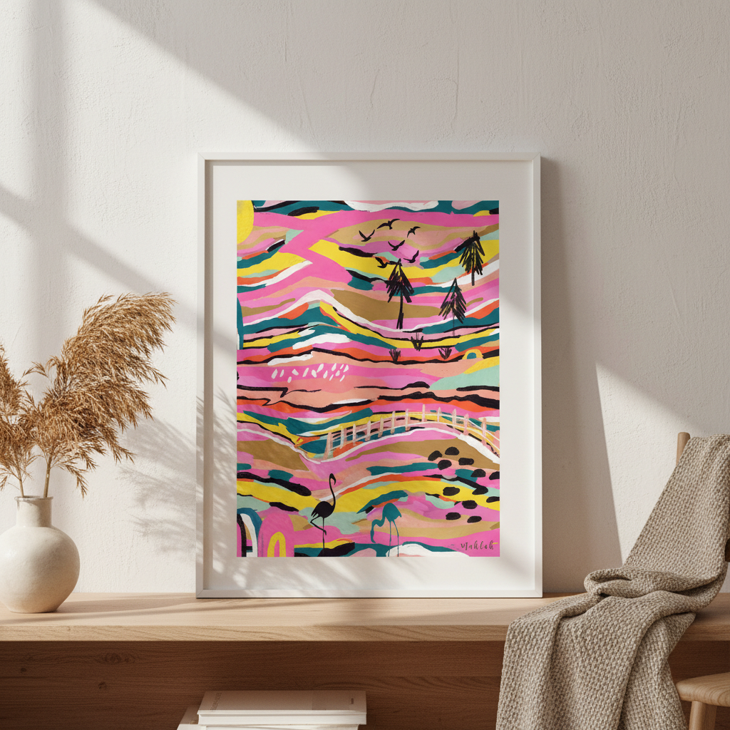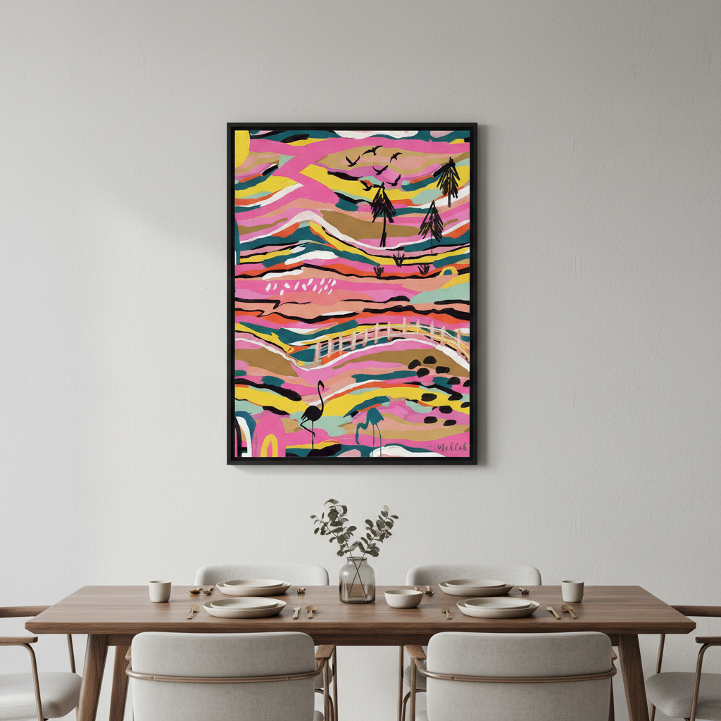 Paradise by Inkheart Designs captures a vibrant escape through bold, abstract imagery. This striking composition merges natural elements—graceful flamingos, lush trees, and an architectural bridge—into a cohesive landscape that defies conventional representation. The interplay of saturated hues creates visual depth and movement, transforming any space into a gallery-worthy focal point. Ideal for contemporary interiors seeking artistic sophistication and conversation-starting appeal.