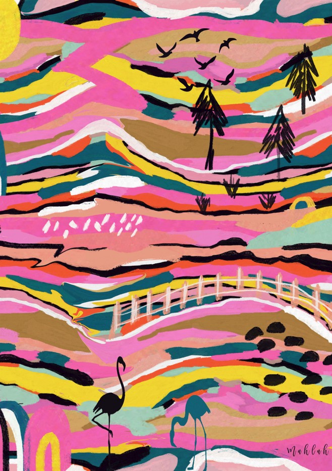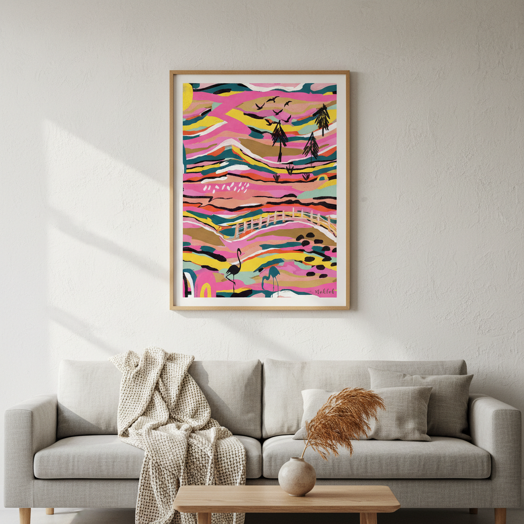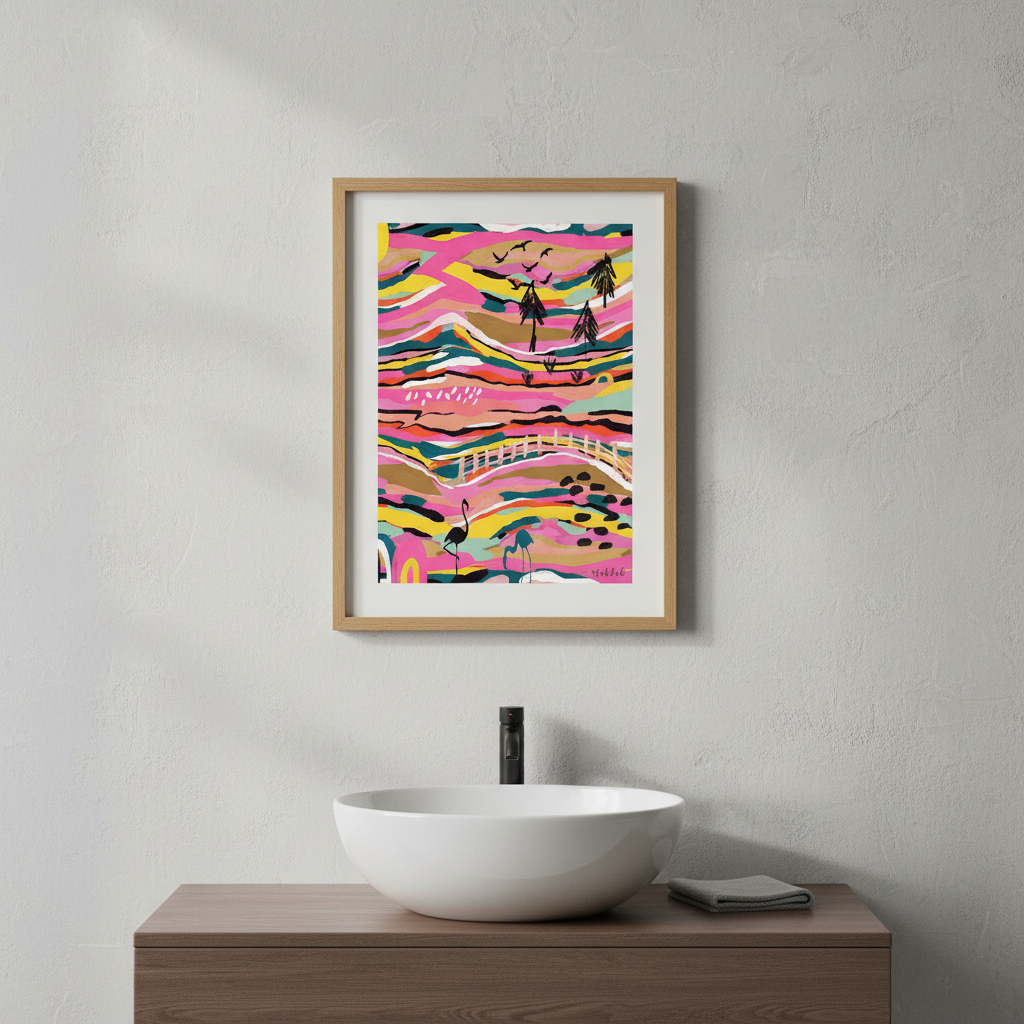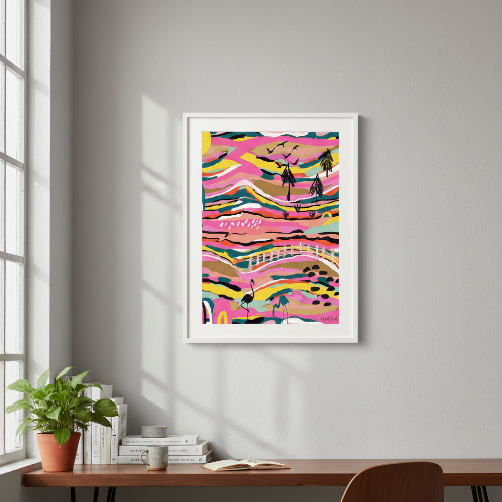 Paradise by Inkheart Designs captures a vibrant escape through bold, abstract imagery. This striking composition merges natural elements—graceful flamingos, lush trees, and an architectural bridge—into a cohesive landscape that defies conventional representation. The interplay of saturated hues creates visual depth and movement, transforming any space into a gallery-worthy focal point. Ideal for contemporary interiors seeking artistic sophistication and conversation-starting appeal.
