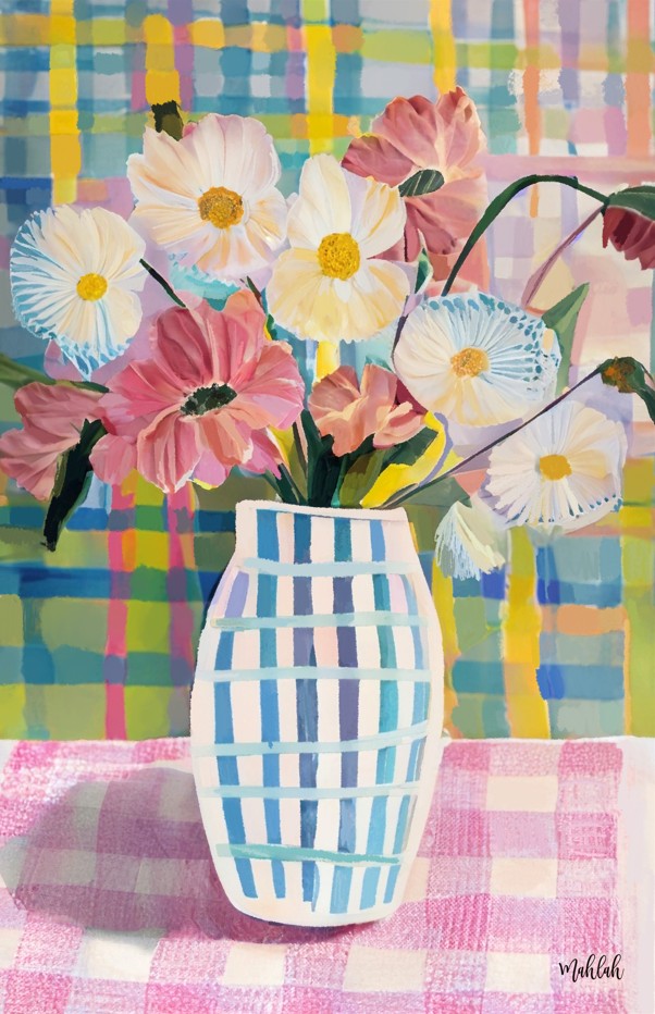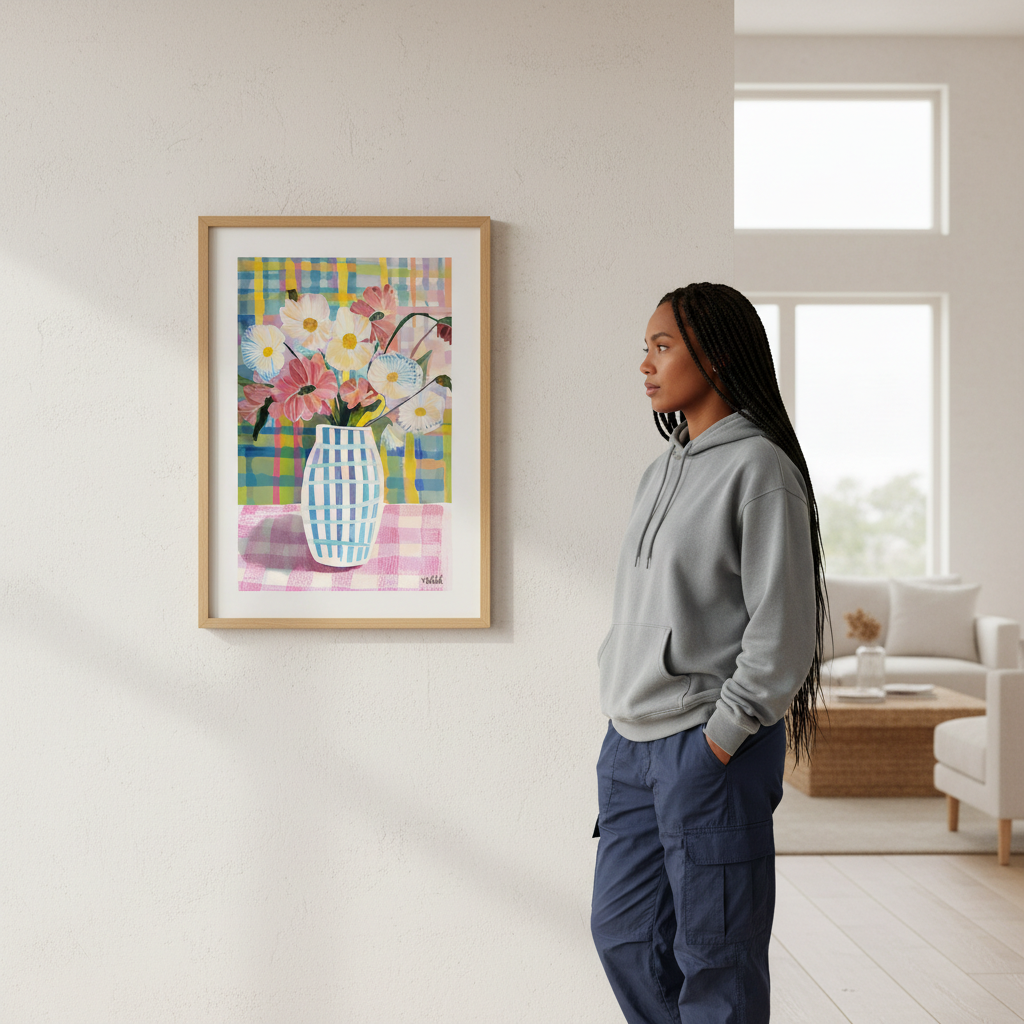 Pastel Flowers by Inkheart Designs brings sophisticated charm to any interior space. This striking artwork features a vibrant floral arrangement displayed in a colorful vase, set against layered geometric patterns—a checkered tablecloth and plaid background that create visual depth and contemporary appeal. The soft pastel palette combines with bold pattern mixing for a modern aesthetic that complements both minimalist and eclectic décor schemes. Perfect for adding personality to living rooms, bedrooms, or creative workspaces, this piece demonstrates masterful composition and colour coordination that elevates wall décor beyond the ordinary.