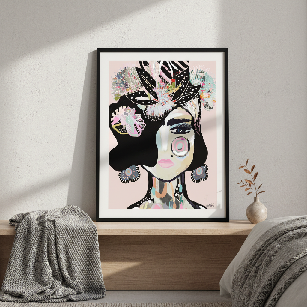 Pastel Frida by Inkheart Designs celebrates artistic expression through a striking illustration of a stylized face adorned with intricate, colorful patterns set against a soft pink backdrop. This contemporary artwork merges portraiture with decorative detail, creating a visually dynamic piece that draws inspiration from cultural iconography. The harmonious blend of vibrant hues and geometric embellishments makes this an ideal choice for spaces seeking character and creative flair. Perfect for galleries, studios, or any interior that values bold artistic statements and thoughtful design.