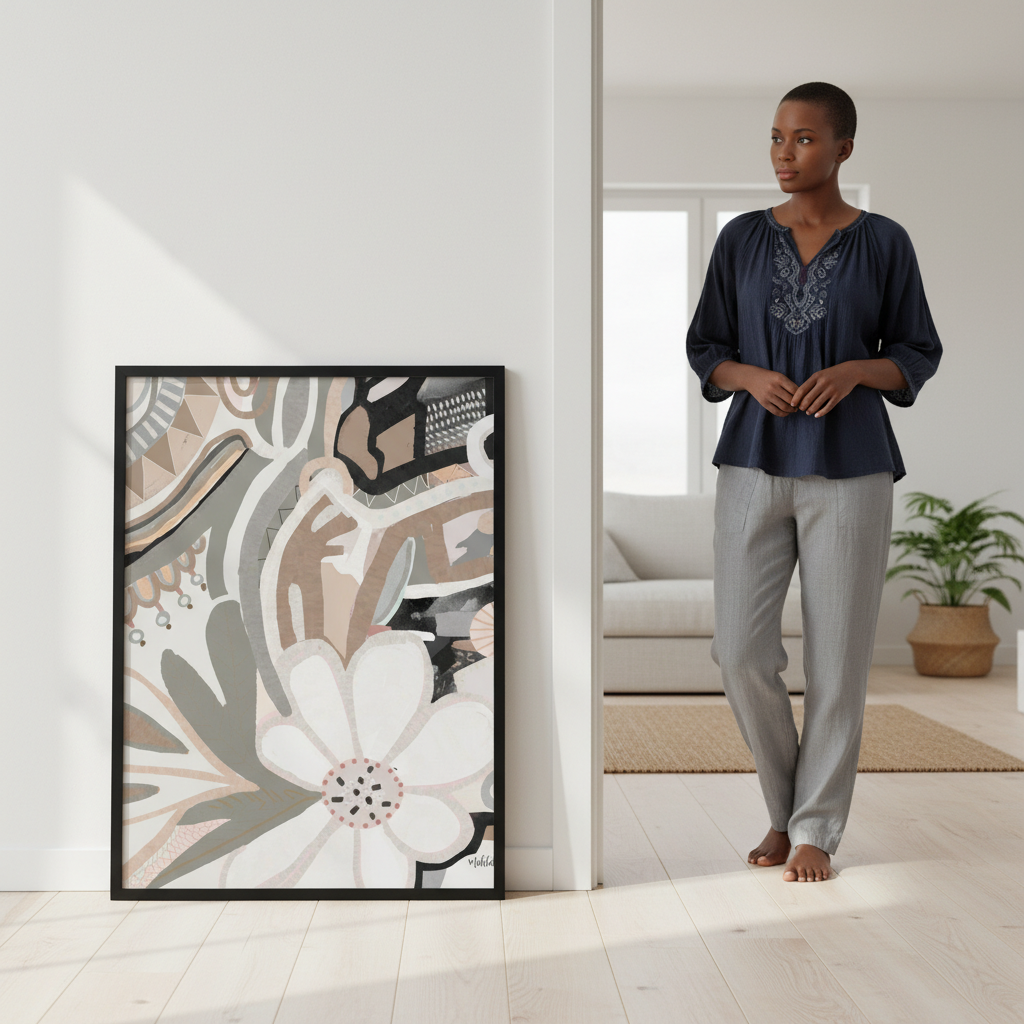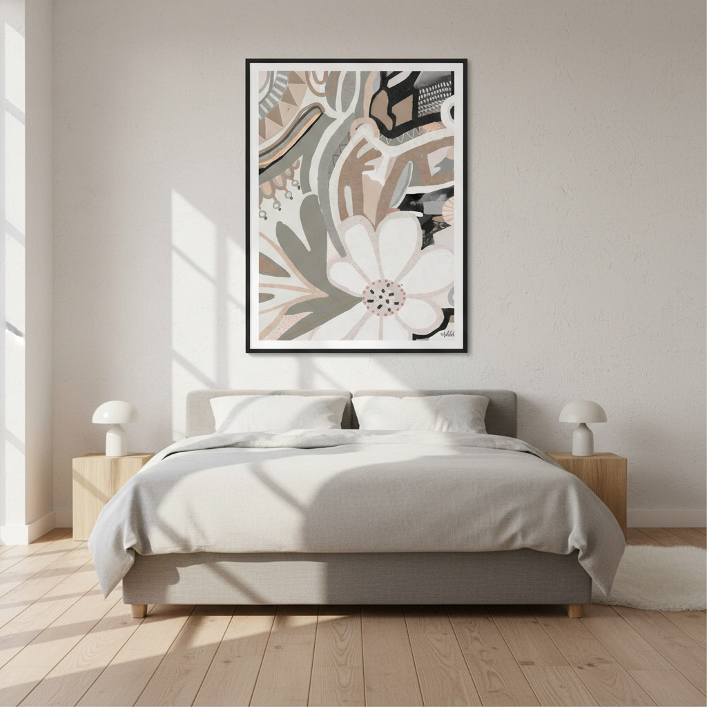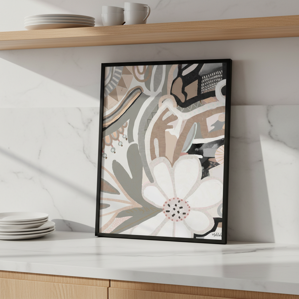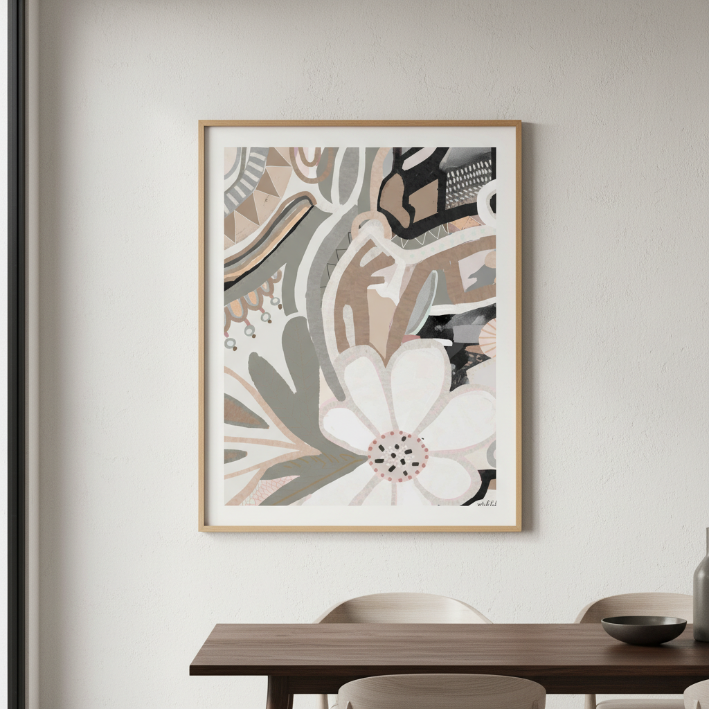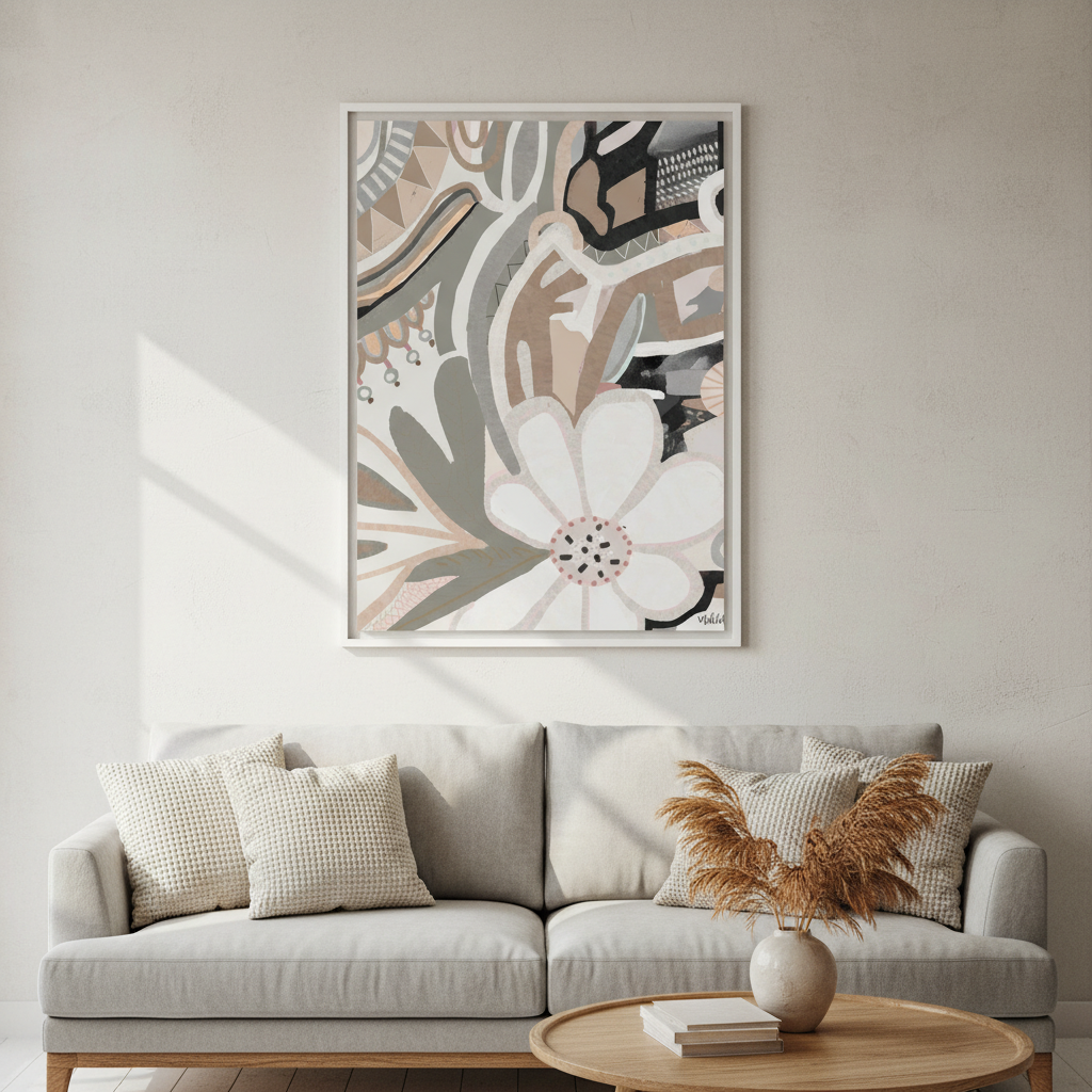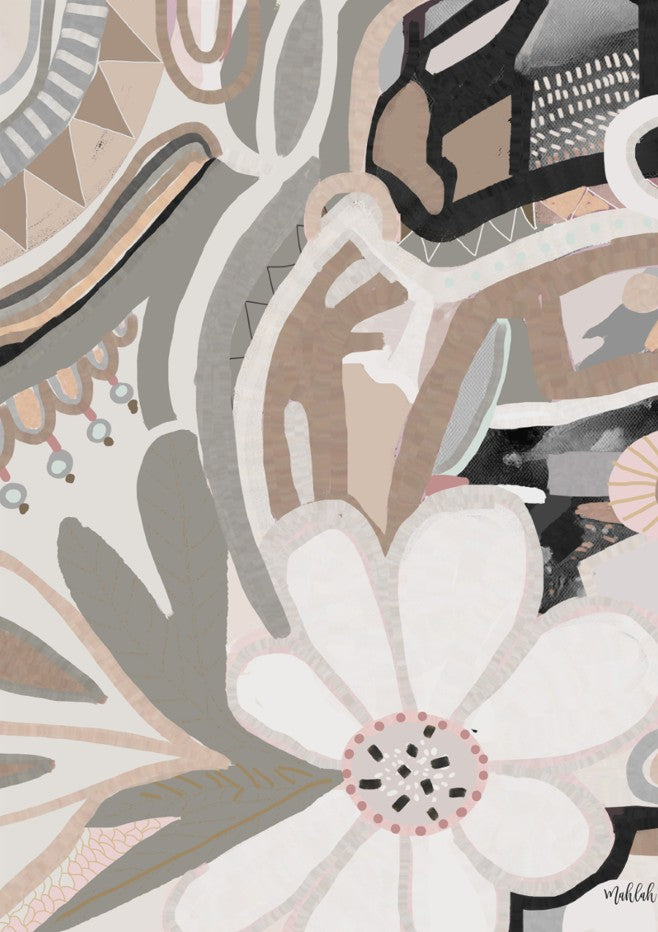 Polly Earth Flower showcases an intricate floral and abstract composition, featuring a striking white bloom at its centre surrounded by layered botanical and geometric elements. This sophisticated design by Inkheart Designs combines natural inspiration with contemporary artistry, creating a versatile piece that complements modern and eclectic interiors. The detailed pattern draws the eye inward, making it an ideal focal point for any room seeking visual depth and artistic character.
